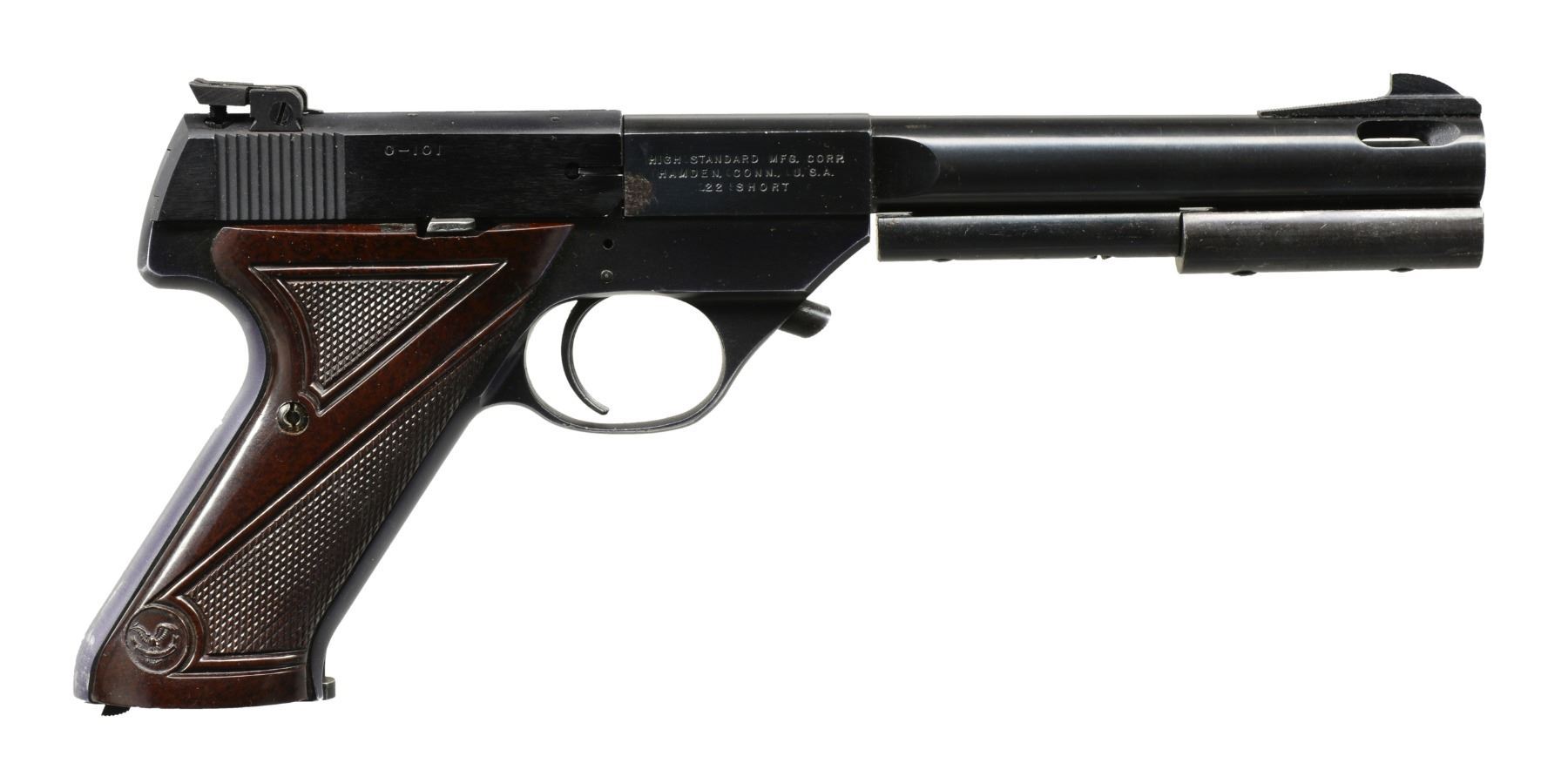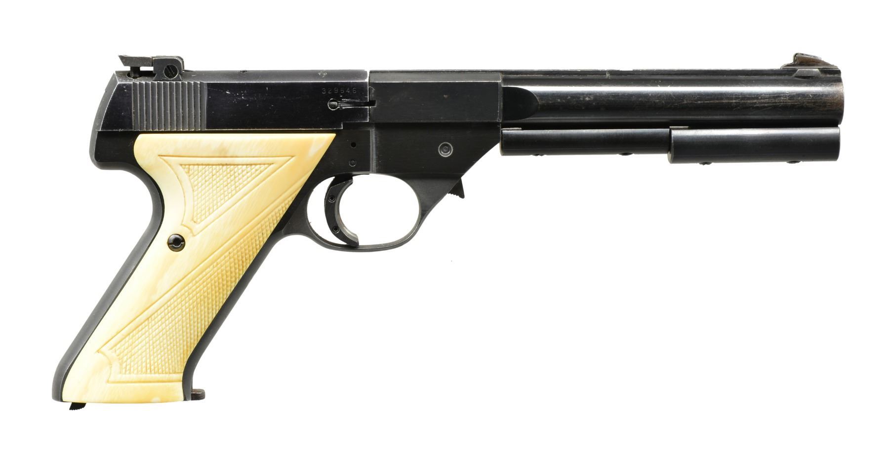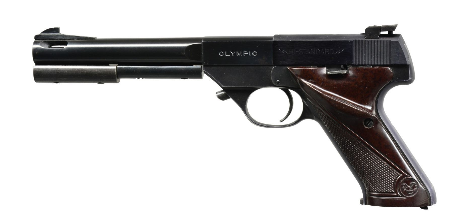1) Cal. 22 Short. S# 437885. Bbl. 6 3/4" ported heavy weight w/ 2 attached bbl. weights. Ramp mounted blade front sight w/ square notch adj. target rear sight. Black anodized aluminum breech block w/ model marking "0-101". Alloy frame w/ push button bbl. release & 2 piece checkered brown plastic grips. MAGS: 5 detachable 10 rd. UNATTACHED ACCESSORIES: 3 spare 22 Short standard weight bbls.: 1 - 4 1/2" & 2 - 6 7/8". 1 filler w/ screws for bbl. weight slot. CONDITION: bbl. retains 90% blue w/ spot of pitting on right side at breech. Slide retains 98% anodized finish. Frame has lightly worn anodized finish w/ wear & fading on grip straps. All bores retains sound rifling. (20-997/DS). 2) Cal. 22 LR. S# 329546 (under slide). Bbl. 6 5/8" heavy w/ rib & 2 bbl. weights. Blade front sight & adj. target rear sight. Alloy slide marked "OLYMPIC". trigger has added wide shoe. 2 Piece ivory colored checkered plastic thumb rest grips. MAGS: 2 detachable 10 rd. UNATTACHED ACCESSORIES: 4 extra 22 LR bbls. including 4 1/2" standard, 4 1/2" bull, 4 1/2" bull w/ rib & bbl. weight & 6 5/8" bull. 2 Extra slides: 1 marked "S-101" & 1 marked "SPORT-KING" on left side w/ s# "365395" on right side. 1 Extra bbl. weight w/ screws. Spare parts are contained in a black molded pistol case. CONDITION: bbl. & slide have 80% lightly worn blue having scratches, marks & spots of corrosion. Alloy slide retains 70% faded finish acquiring a purple cast. All bbls. have very good bright bores. (20-1056/DS). BOTH MODERN. $950-1,350.