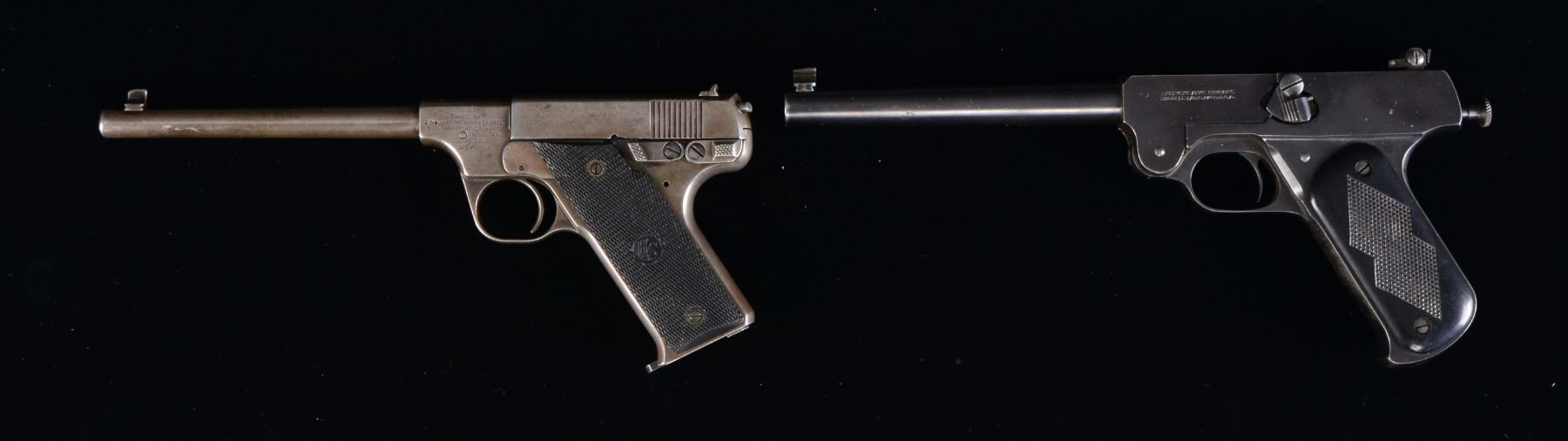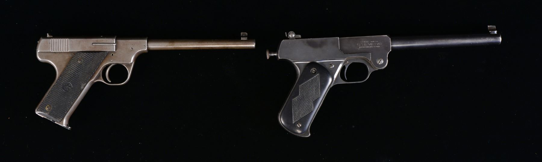 BOTH: cal. 22 LR. 1) HARTFORD ARMS SEMI AUTO TARGET. S# 2548. Bbl. 6 3/4" w/ blade front sight & fixed V notch rear sight. Checkered hard rubber 2 piece grips. Mfg. 1926-1930. MAGS: 1 detachable 10 rd. CONDITION: metal has cleaned gray pitting showing scatted spots of corrosion & light pitting. Grips show light wear & marks. Lightly pitted bore w/ worn rifling. (20-972/DS). 2) STEVENS NO. 10 TARGET SINGLE SHOT. S# 8775. Bbl. 8" w/ bead front sight & square notch adj. rear. Blued tip up action w/ appearance of a semi automatic pistol. 2 Piece checkered hard rubber grips. Total of 7,131 mfg. 1919-1933. CONDITION: 90% blue showing edge wear. Bore is bright w/ strong rifling. Grips show light wear. (20-1022/DS). BOTH CURIO. $400-600.