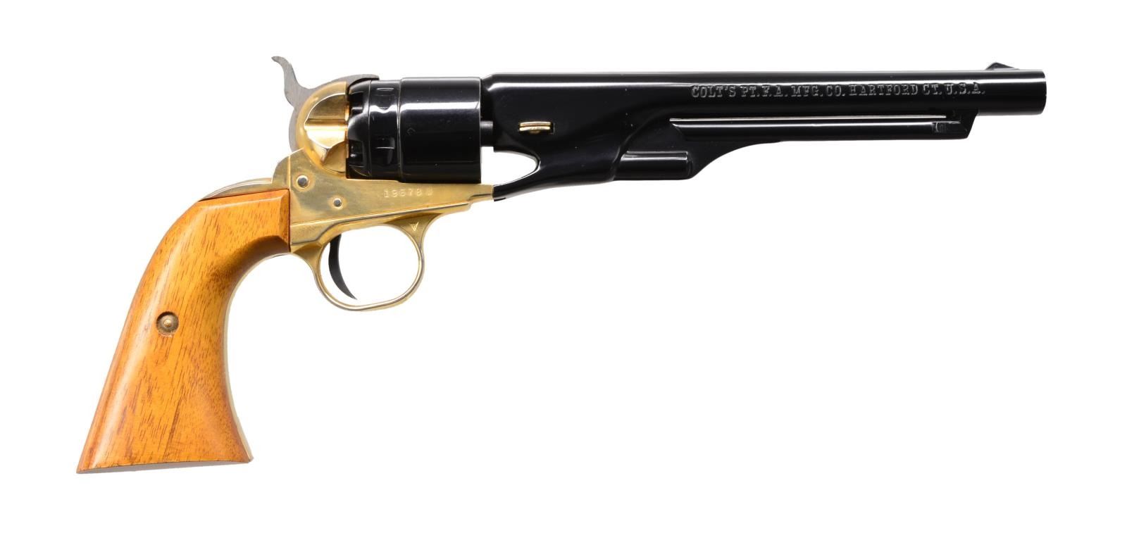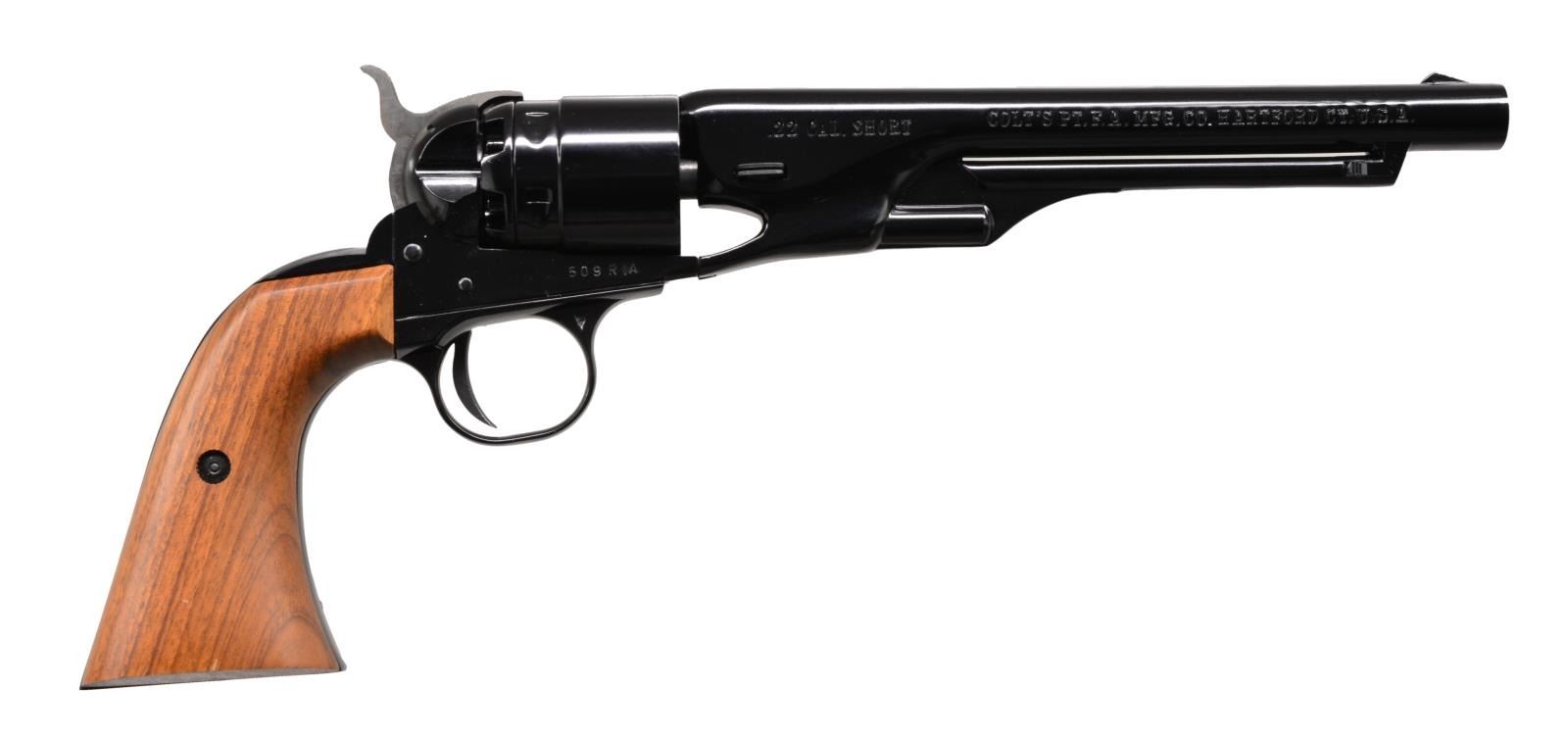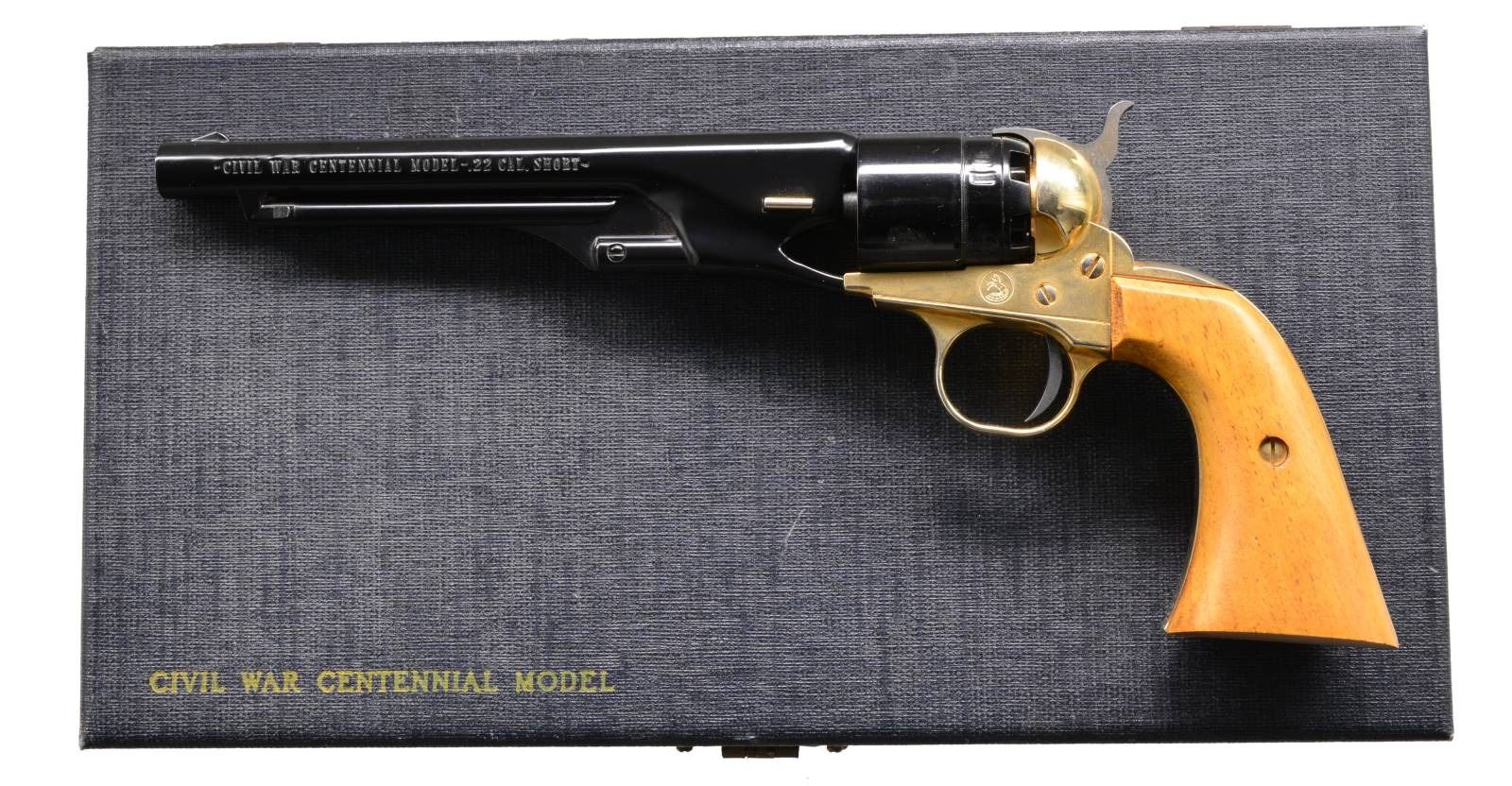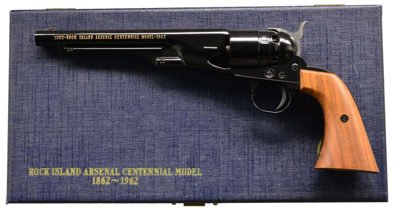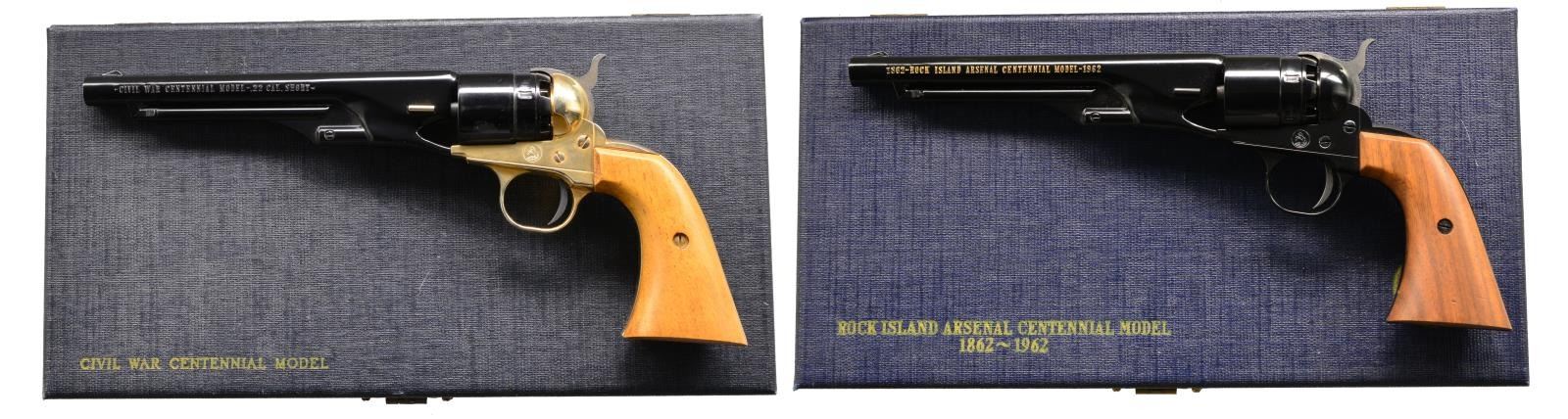 BOTH: cal. 22 Short. Single shot pistols styled to look like Colt 1860 Army Civil War era revolver. Bbls. 6", slide forward to remove & allow loading of faux cyl. 1) CIVIL WAR CENTENNIAL. S# 19678W. Black finished bbl., gold finished frame & grip straps. 2 Piece walnut grips. UNATTACHED ACCESSORIES: blue & gray display case containing instruction sheet, Centennial parchment, certificate & registration card. CONDITION: as new, appears unfired. (20-101/DS). 2) ROCK ISLAND ARSENAL CENTENNIAL 1862-1962. Cal. 22 Short. S# 509RIA. Black painted bbl., cyl. & action. 2 Piece walnut grips. UNATTACHED ACCESSSORIES: blue & gray presentation case. CONDITION: as new, appears unfired. (20-102/DS). BOTH CURIO. $500-800.