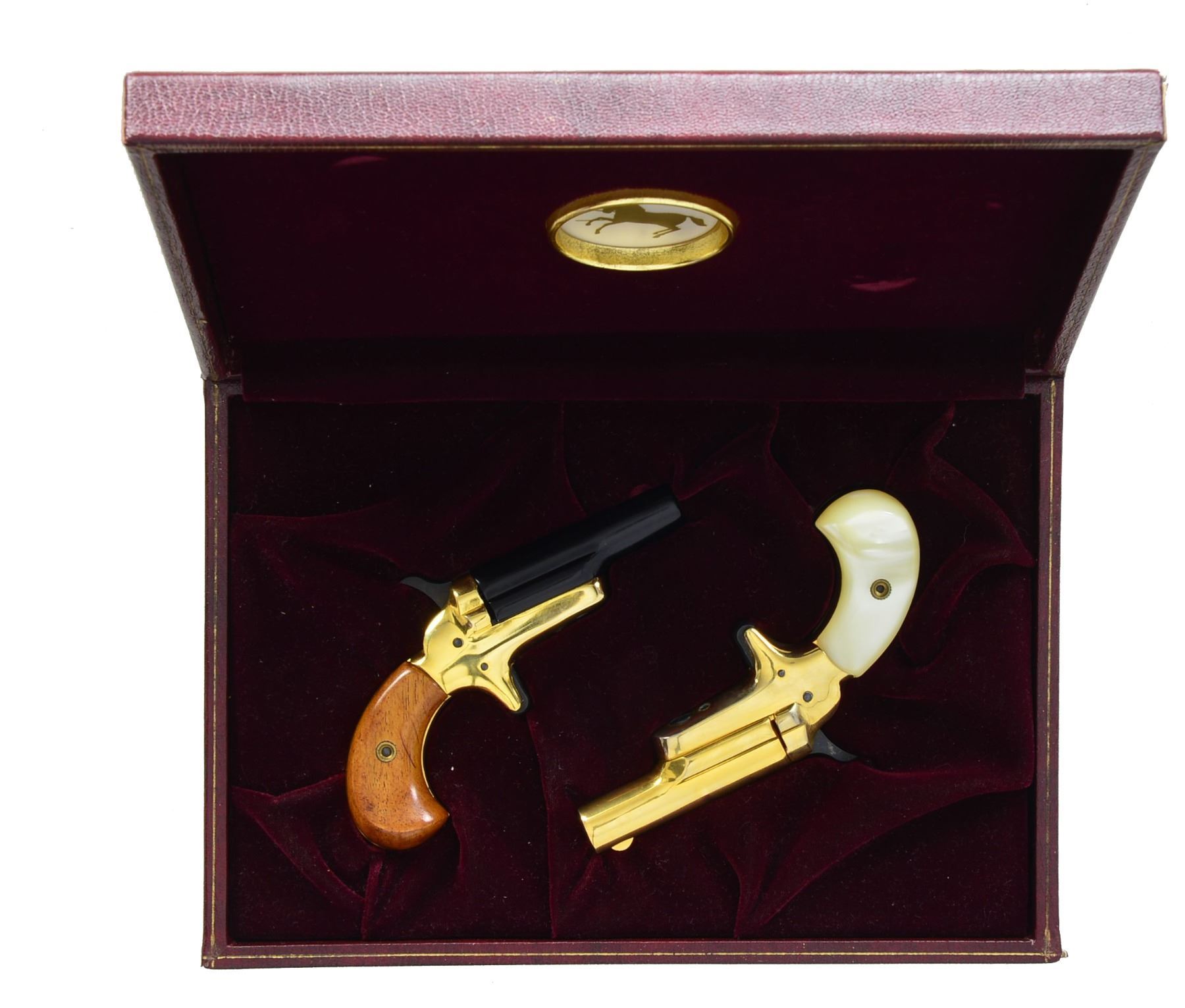 BOTH: cal. 22 Short. Bbls. 2 1/2" w/ semi circular sight. Actions feature spur triggers, sloping spur hammers & bird's head grips. 1) LORD. S# 2859LDR. Black finished bbl., hammer & trigger. Gold finished frame. 2 Piece wood grips. CONDITION: 99% metal finish. Grips show a couple of sm. marks. Bore retains good rifling showing spots of darkened appearance or pitting. (20-866/DS). 2) LADY. S# 2860LDR. Gold finished bbl. & frame w/ black finished hammer & trigger. 2 Piece mother of pearl grips. UNATTACHED ACCESSORIES: naugahyde covered presentation box w/ purple velour fitted interior. Lid of box has label w/ vignettes of Lord, Lady & picture of 2 pistols. Inside of lid has rampant Colt circular vignette. Box contains instruction & warranty pamphlets. CONDITION: over 95% finish w/ spots of light fading on bottom of frame. Bore retains sound rifling showing spots of dark pitting. (20-867/DS). BOTH CURIO. $300-500.