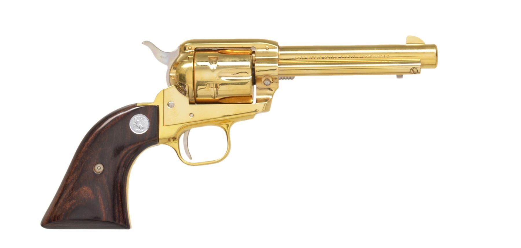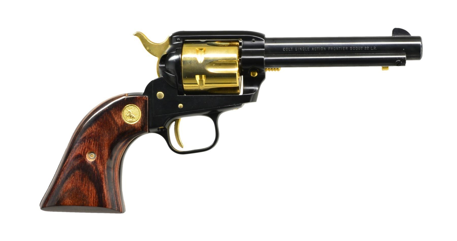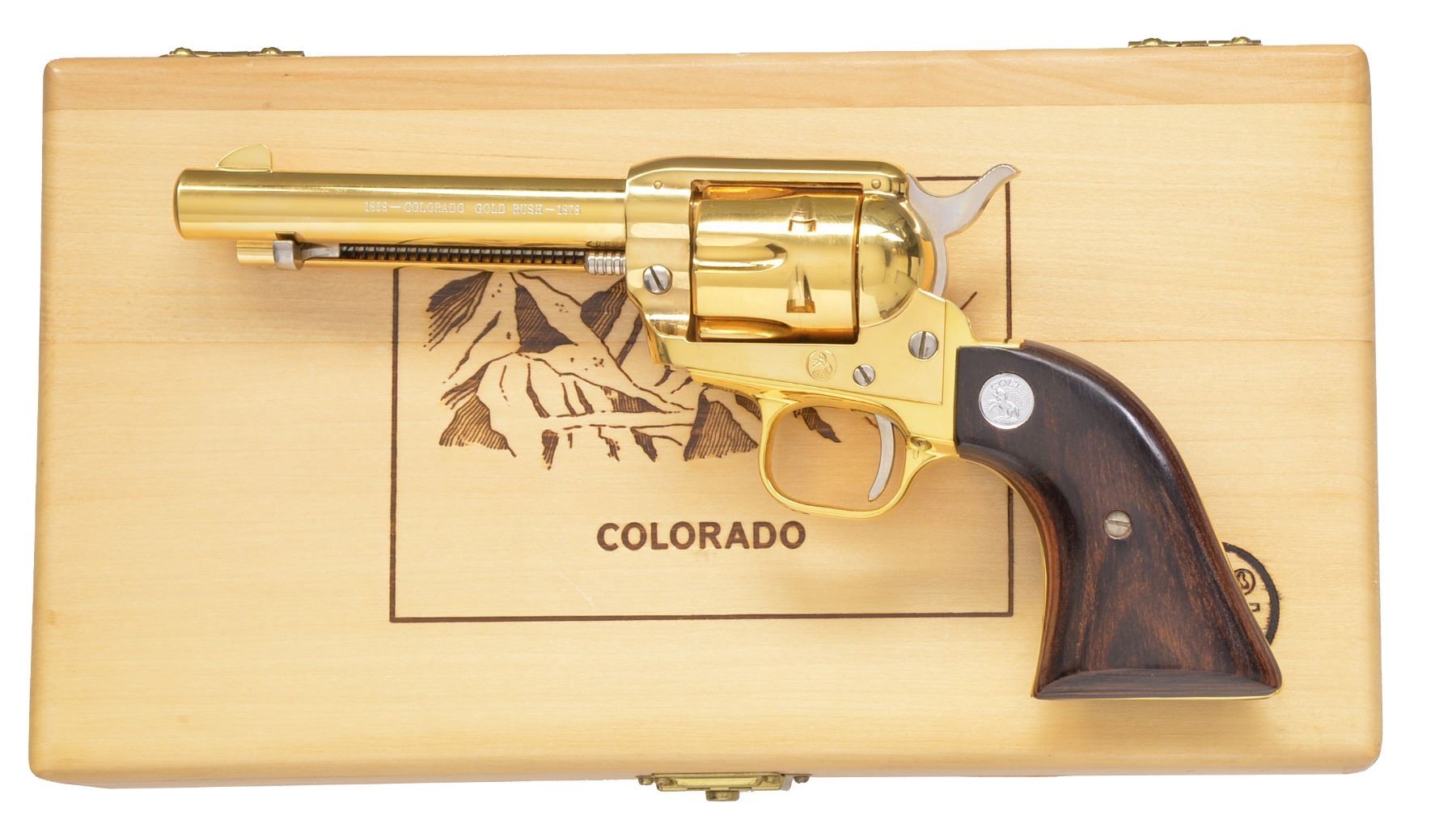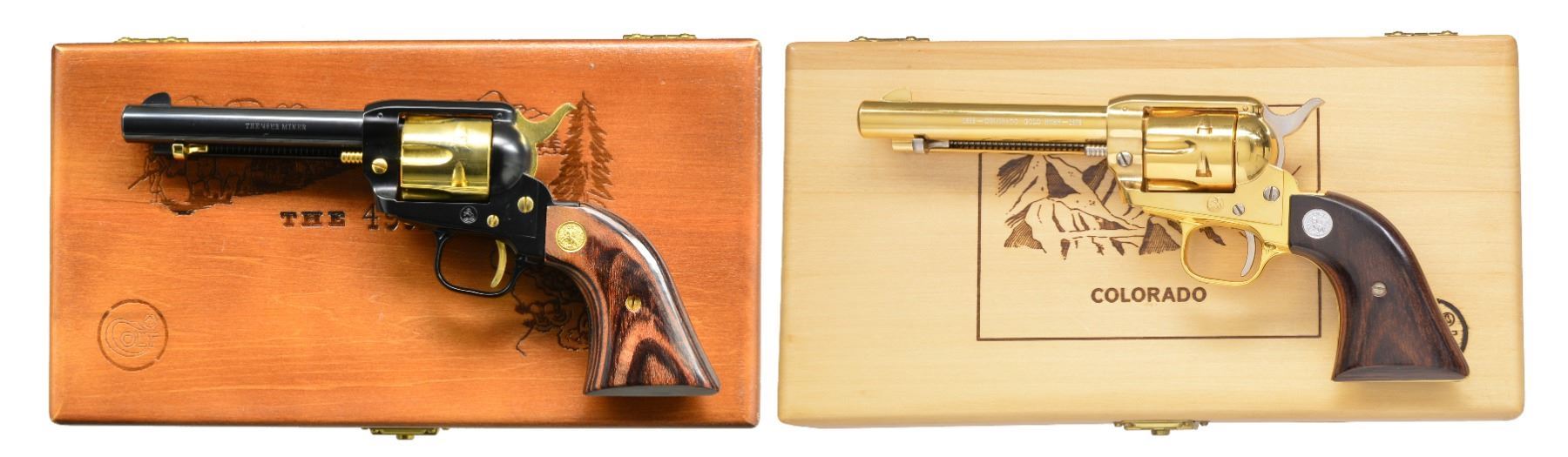 FRONTER SCOUT SA REVOLVERS. BOTH: cal. 22 LR. Bbls. 4 3/4". 6 Shot fluted cyls. 1) 49'ER MINER. S# 0194FN. Blued bbl. & ejector housing. Black anodized frame & grip straps. Gold anodized cyl., hammer, trigger ejector, cyl., pin & action screws. 2 Piece laminated grips w/ gold Rampant Colt medallions. Limited edition 500 mfg. 1965. UNATTACHED ACCESSORIES: wood display box w/ fitted velour interior having wagon train & gold mining scene on lid. CONDITION: appears unfired. 99% Finish showing sm. scuffs on frame. (20-95/DS). 2) COLORADO GOLD RUSH 1853-1878. S# 1116CG. Gold finished bbl., cyl., ejector housing, frame & grip straps. Hammer, trigger, cyl. pin, ejector & action screws are nickel finished. 2 Piece laminated wood grips w/ silver Rampant Colt medallions. Limited edition of 1,350 mfg. 1966. UNATTACHED ACCESSORIES: wood presentation box w/ black fitted interior having Colorado mountain scene on lid. CONDITION: appears unfired, gold finish shows sm. scuffs & spots of pinprick oxidation. (20-98/DS). BOTH CURIO. $900-1,350.