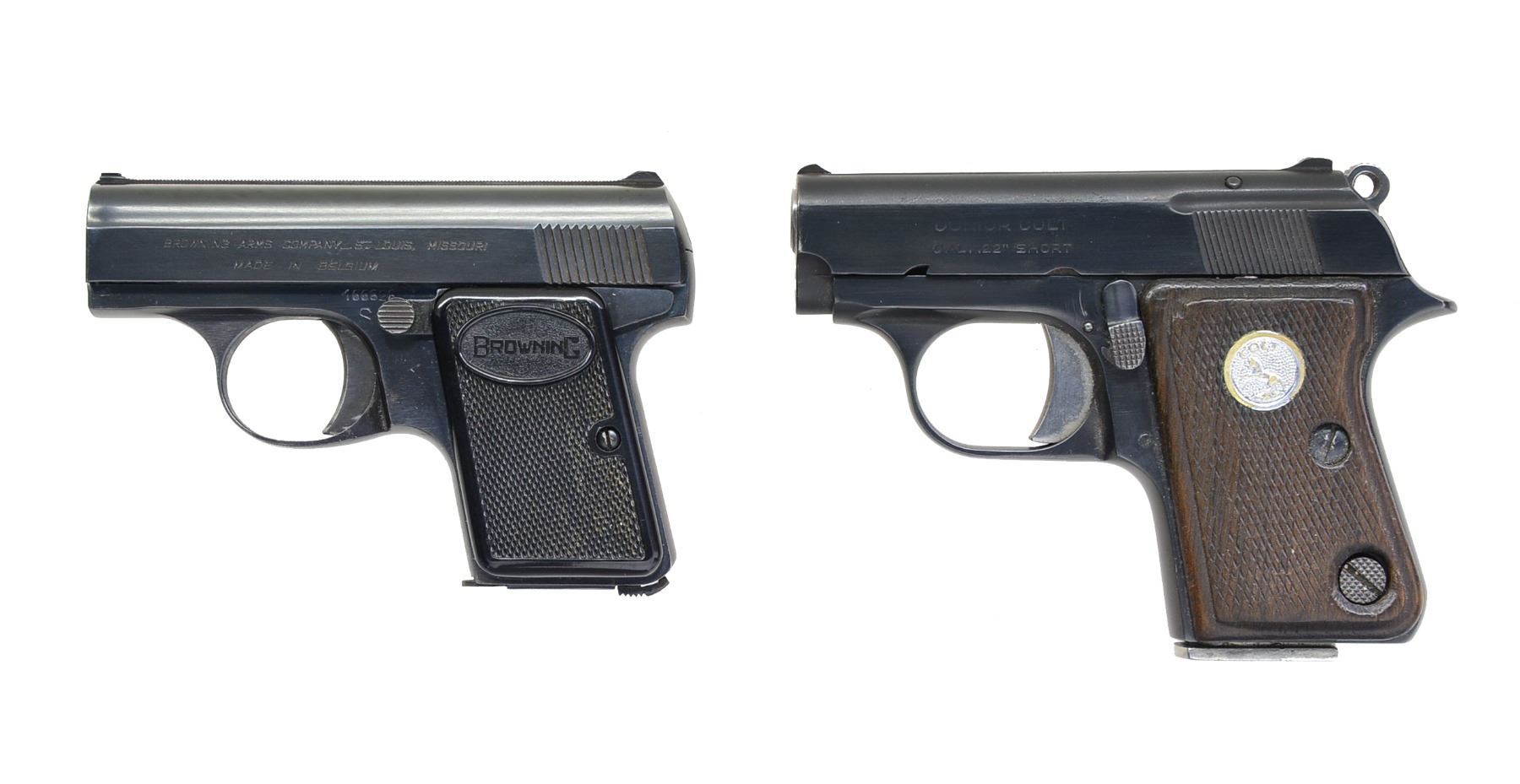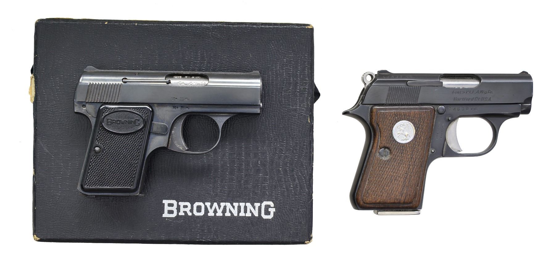 1) 25 ACP BABY BROWNING. Cal. 25 ACP. S# 166828. Bbl. 2". The smallest of the Browning Automatic Pistols is often referred to as the"Baby Browning", w/ a 6 rd. capacity & an overall length of only 4", it was considered a "Gentleman's Pistol" easily being concealed in a vest pocket. Blue finish w/ factory Browning plastic grips. Serrated slide. Fixed sights over a serrated flat top. A lg. safety on the left side behind the trigger is easy to utilize, even when time is of the essence. Bottom mounted, European style mag. release. MAGS: 1-6 rd. UNATTACHED ACCESSORIES: factory shipping/presentation box & original paperwork. CONDITION: bluing coverage is complete & uniform, only noticeable thinning in areas of pistol grip specifically the backstrap. Shiny bore w/ strong rifling. Fire control mechanism appears to function correctly when cycled by hand. (20-1049/JZ). 2) JUNIOR COLT POCKET. Cal. 22 Short. S# 14639CC. Bbl. 2 1/4". Blued finish w/ walnut grips, checkered & complete w/ colt medallion. Serrated slide. Fixed sights. Push button w/ mag. release located at bottom of mag. well. Exposed hammer. Mfg. in Spain under Colt contract from 1958-1968. MAGS: 2 factory 6 rd. CONDITION: bluing coverage is dark & complete, possibly having been reblued at some point. Grips appear original & show years of use w/out abuse. Bore is shiny w/ good rifling. Fire control mechanism appears to function correctly when cycled by hand. (20-1072/JZ). BOTH CURIO. $600-900.
