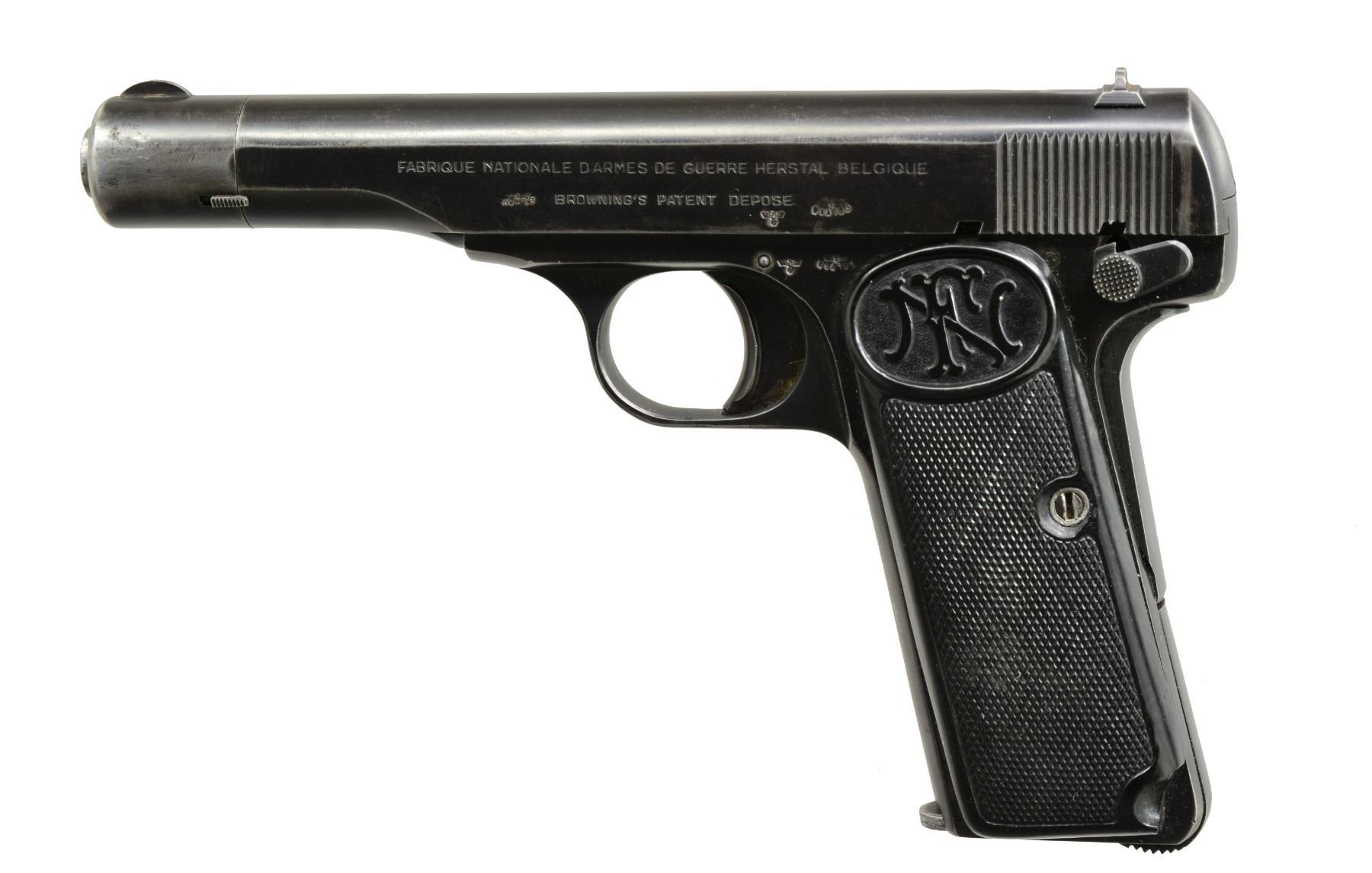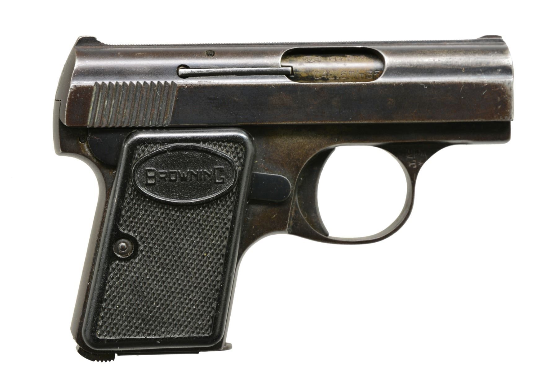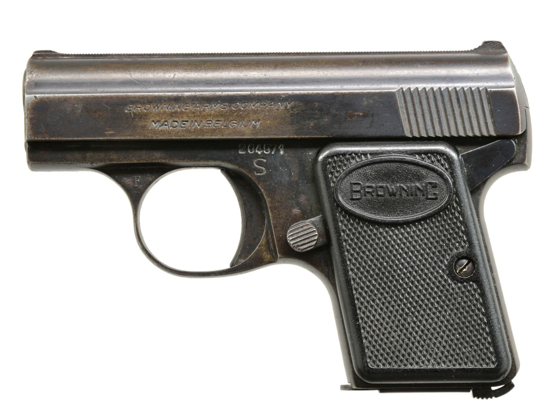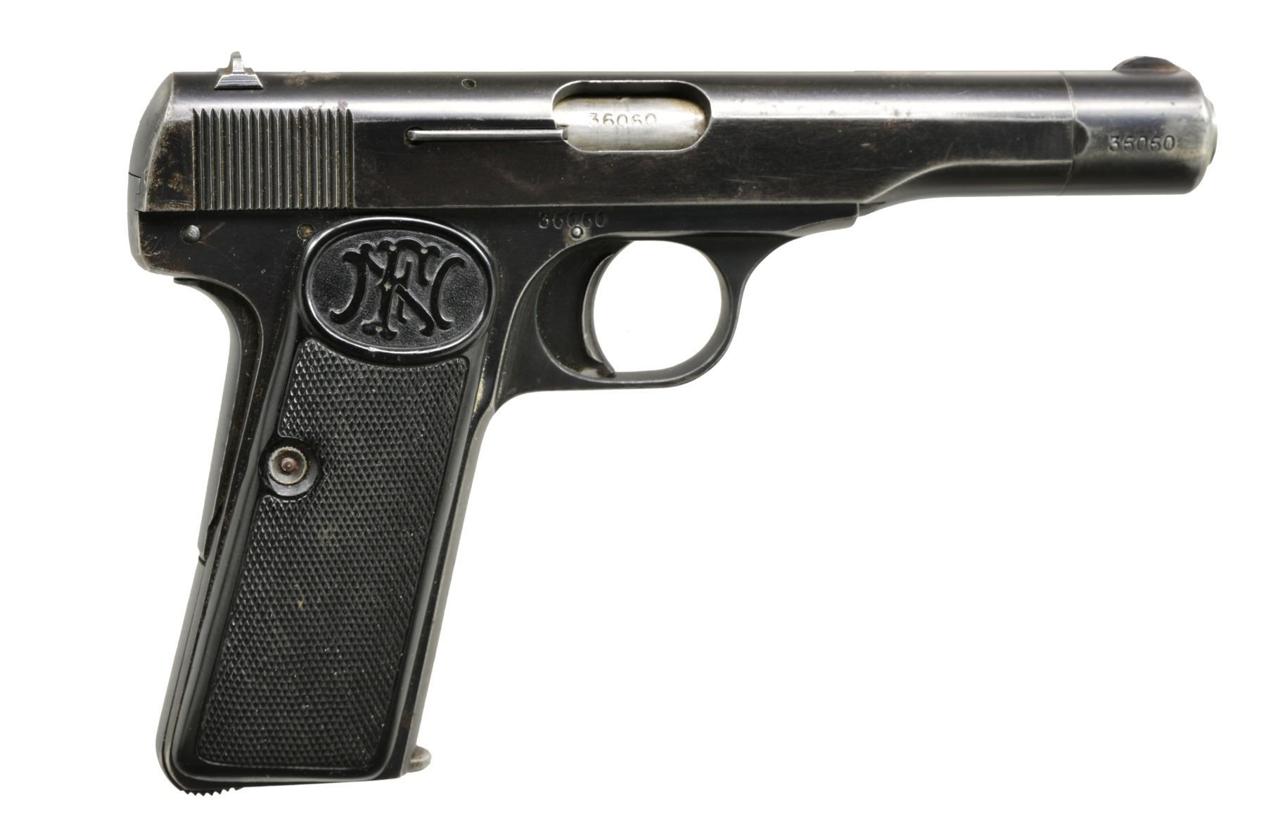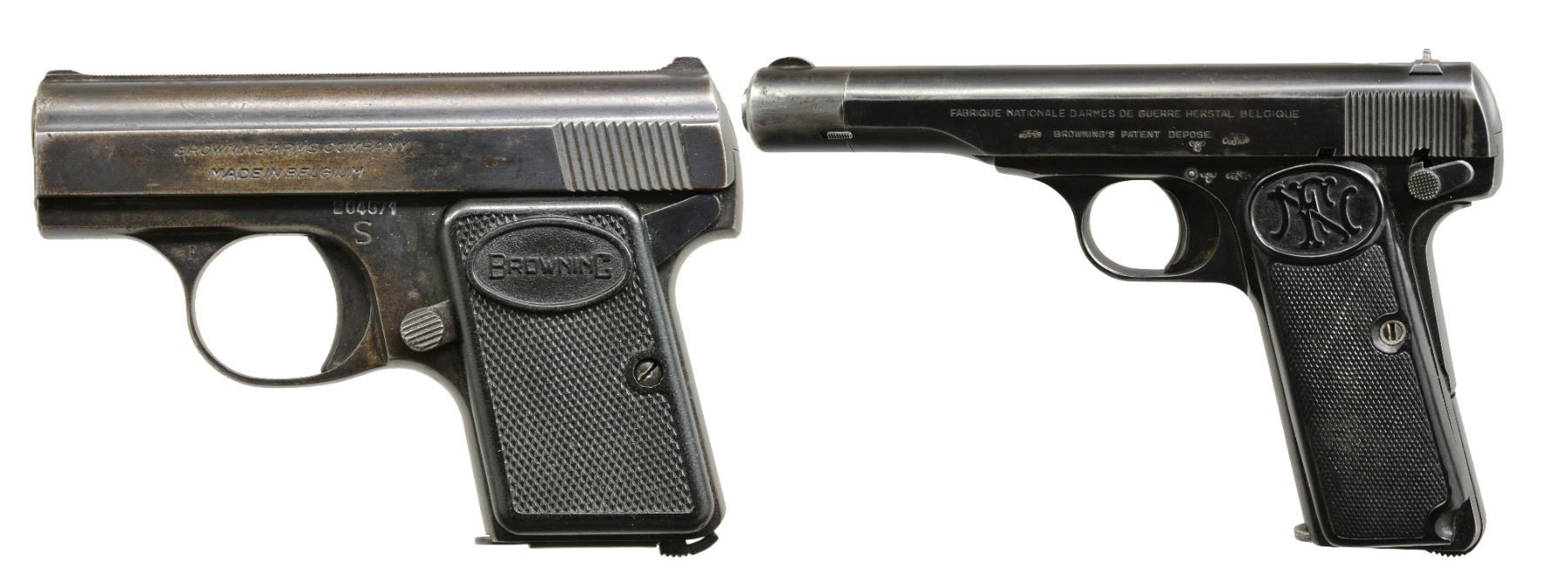BOTH: blued w/ black checkered grips plus matching numbered bbls., slides & nose cap on Model 1922. Belgium made & bottom mag. latches. 1) BROWNING BABY. Cal. 6.35mm (25 ACP). S# 264571. Bbl. 2". Mfg. 1962 (1955-1968) w/ Liege proofs, BAC slide marking & "Browning" on grips. Slide thumb & mag. safeties; no grip safety. MAGS: 1 very good FN marked 6 rd. CONDITION: good plus overall appearance w/ scattered peppery oxidation & slight high point wear. Very good grips & near excellent bore. (19-5790/NW). 2) FN MODEL 1922. Cal.7.65mm (32 ACP). S# 36060. Bbl. 4 1/2". Mfg. during German occupation of FN from 1940 to 1944. Proofs of eagle party symbol & eagle WaA103. Mag., thumb & grips safeties. MAGS: good FN marked 9 rd. CONDITION: good plus overall appearance w/ holster type wear most noticeable near muzzle along w/ high points plus thinning on front strap. Good grips w/ light wear having screw slot damage. Very good bore. (19-5808/NW). BOTH CURIO. $650-900.