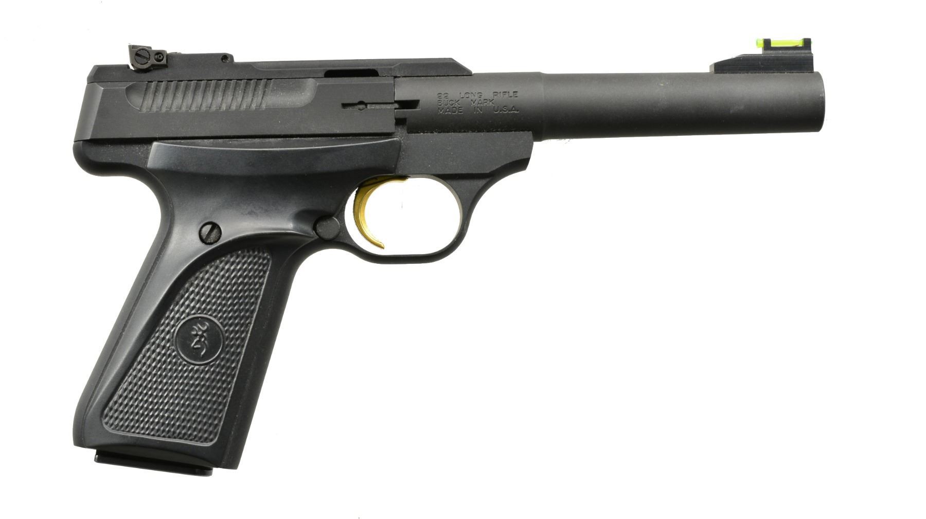 BOTH: cal. 22 LR. MAGS: 2 factory 10 rd.; appropriate 1 for each. CONDITION: all aspects near excellent including bore. 1) BUCK MARK CAMPER MODEL. S# 515MW15472. Bbl. 5 1/2" bull w/ replacement green fiber optic front sight plus adj. rear; both bbls. mounted. Mfg. 2004 (1999-2012) having matte black finish w/ Browning logo checkered black plastic grips. UNATTACHED ACCESSORIES: factory gray plastic case w/ packaging to include original blued sight. (20-1233/NW). 2) MODEL 1911-22. Cal. 22 LR. S# 51EZX09398. Bbl. 4 3/8"; fixed sights on slide w/ drift adj. rear. Mfg. 2013 (2011-date) w/ alloy construction, stainless match crowned bbl., matte black finish & dbl. diamond checkered hardwood grips; 7/8 scale sized Model 19911-A1 w/ its standard operating features. (20-1253/NW). BOTH MODERN. $500-750.