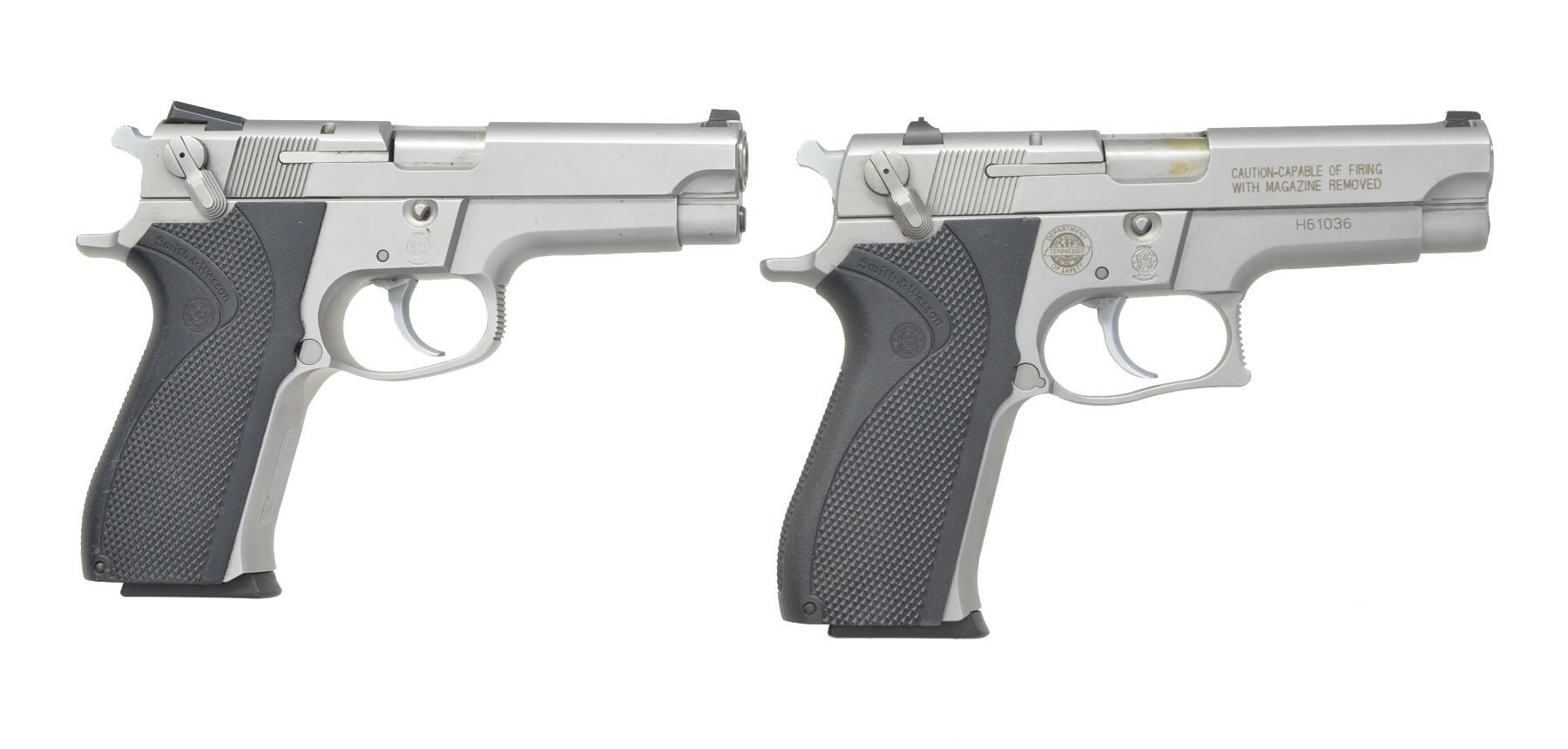 BOTH: 9mm Luger. Bbls. 4". Stainless steel construction. Ambidextrous safeties. 1 Piece black synthetic grips. 1) S# TDL3827. Right side of frame is marked w/ circular emblem of the Tennessee Department of Safety w/ agency marking "H61036". 3 Dot sights. MAGS: 1 S&W 10 rd. & 1 Eagle Alpha 10 rd. CONDITION: satin stainless finish shows mild edge wear & scuffs. Very good grips. Bore is bright w/ sound rifling. (20-213/DS). 2) S# TYP0062. 3 Dot night sights. MAGS: 1 S&W 14 rd. & 1 MEC-GAR 17 rd. CONDITION: stainless finish shows light edge & muzzle wear w/ scattered scratches & marks. Bore is bright w/ strong rifling. (20-216/DS). BOTH MODERN. $700-1,000.