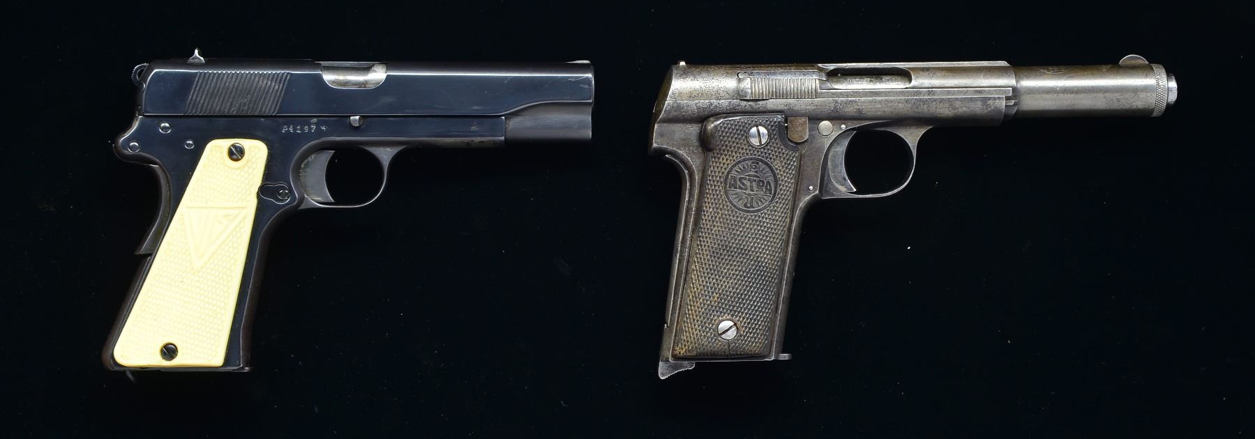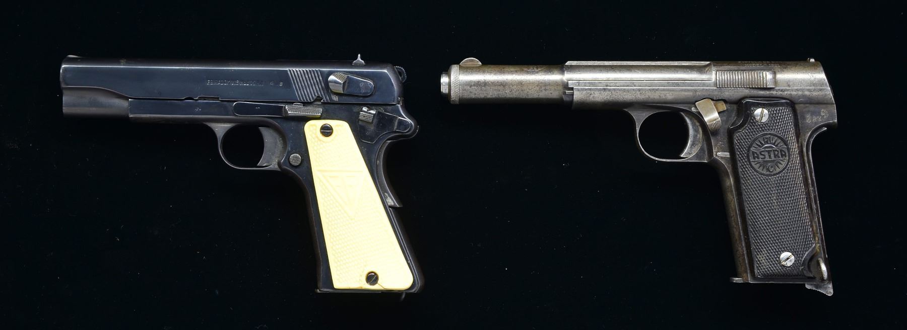 1) RADOM VIS 35PR1. Cal. 9mm. S# P4197. Bbl. 4 1/2". Action features rnd. hammer. Blade front sight w/ fixed V notch rear sight & decocking lever on left side. Bbl. & slide marked "waffenampt / 77". Underside of slide has matching number, left side of bbl. lug has last 3 digits of matching number. 2 Piece white checkered plastic grips. Right panel marked "VIS", left panel marked "FB". MAGS: 2 detachable 8 rd. CONDITION: metal has bright highly polished reblued finish w/ distorted markings. Blue shows light wear & spots of finish loss on bottom of frame forward of trigger guard. Both grip panels show cracks around lower attachment screw. Dark lightly pitted bore w/ intact rifling. Bbl. bushing is polished flat. (20-983/DS). 2) ASTRA MODEL 400 (1921 MILITARY). Cal. 9X23 Bergmann. S# 35713. Bbl. 6". Front of slide has Spanish crest over Astra markings. Rear part of slide has 2 line "GUERNICA" address & "MODELO 1921" marking below caliber marking & 1924 mfg. date. Frame, slide & bbl. have matching serial numbers. 2 Piece checkered hard rubber grips. MAGS: 1 detachable 7 rd. CONDITION: retains some dull blue in protected areas. Fading to gray showing sm. dents & scattered pitting. Grips show wear. Right panel is cracked at lower attachment screw. Dark bore w/ intact rifling. (20-995/DS). BOTH CURIO. $700-1,000.