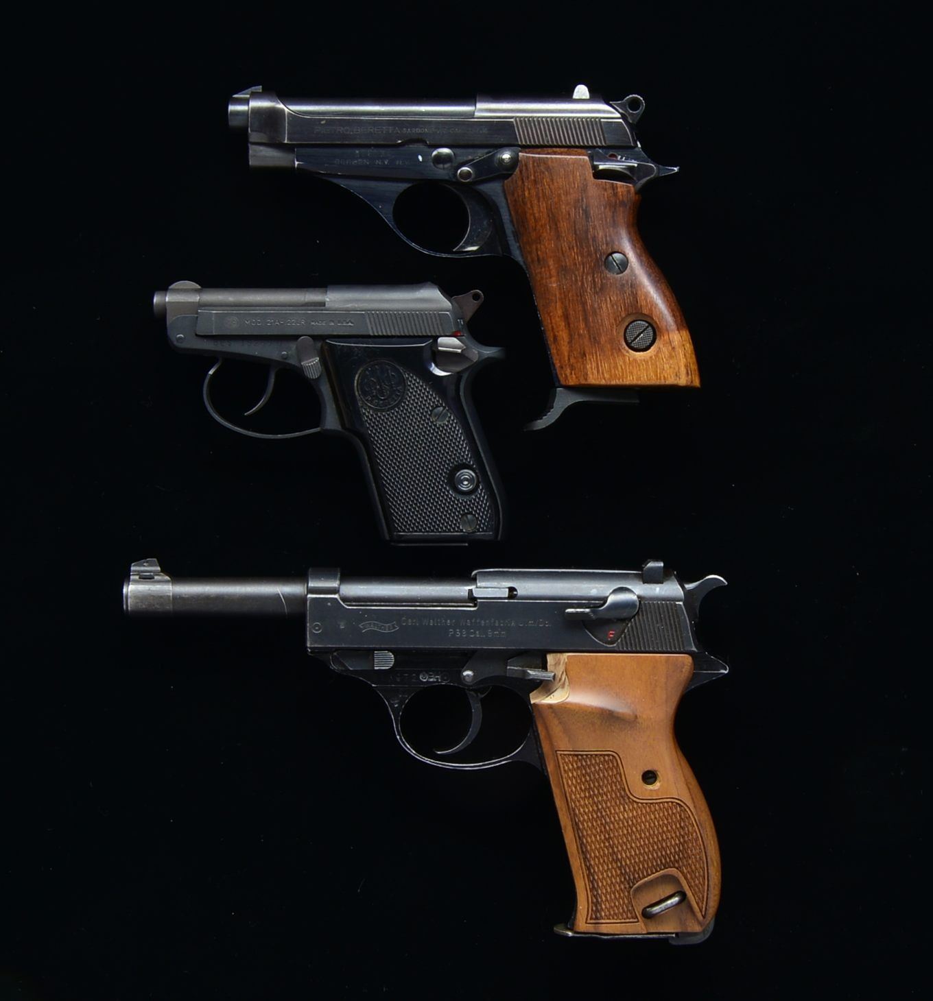 1) BERETTA MODEL 70. Cal. 22 LR. S# M26134. Bbl. 3 1/2". Slide markings include "PIETRO BERETTA CAL 22 LR MADE IN ITALY". Frame marked "BERBEN N.Y. N.Y.". SA. Fixed sights. Walnut grips. MAGS: 1-8 rd. finger rest mag. CONDITION: grips have light wear & scattered sm. handling marks. Metal retains 80% blue / black finish w/ high point wear & scattered sm. scratches. Very good shiny bore. (20-964/RW). 2) WALTHER P.38 SEMI AUTO PISTOL. Cal. 9mm Luger. S# 116972. Matching numbers on frame, bbl. & slide. Frame marked on left side over trigger guard "BH" & 3 Austrian acceptance marks. Slide marked on left side w/ Walther banner, eagle "N" nitro proof & "Carl Walther Waffenfabrik Ulm/Do P 38 Cal 9mm". Replacement checkered walnut grips w/ thumb rest on left side. Left grip has been modified to clear slide release. MAGS: 2-8 rd. mags. 1 Dated "2/59" & 1 marked in electro pencil "4159". CONDITION: grips in near excellent condition. Metal retains 75% thinning worn finish w/ scattered handling marks. Very good shiny bore. (20-998/RW). 3) BERETTA MODEL 21A. Cal. 22 LR. S# BES19269U. Bbl. 2 7/16". Slide marked on right side "BERETTA USA". Marked on left side "MOD 21A 22LR MADE IN USA". SA / DA. Black plastic checkered grips w/ Beretta logo. MAGS: 1-7 rd. mag. UNATTACHED ACCESSORIES: matching factory box. CONDITION: grips in very good condition. Metal retains very high degree of finish w/ light high point wear. Bore has dark oxidized appearance. (20-1005/RW). ALL MODERN. $600-900.