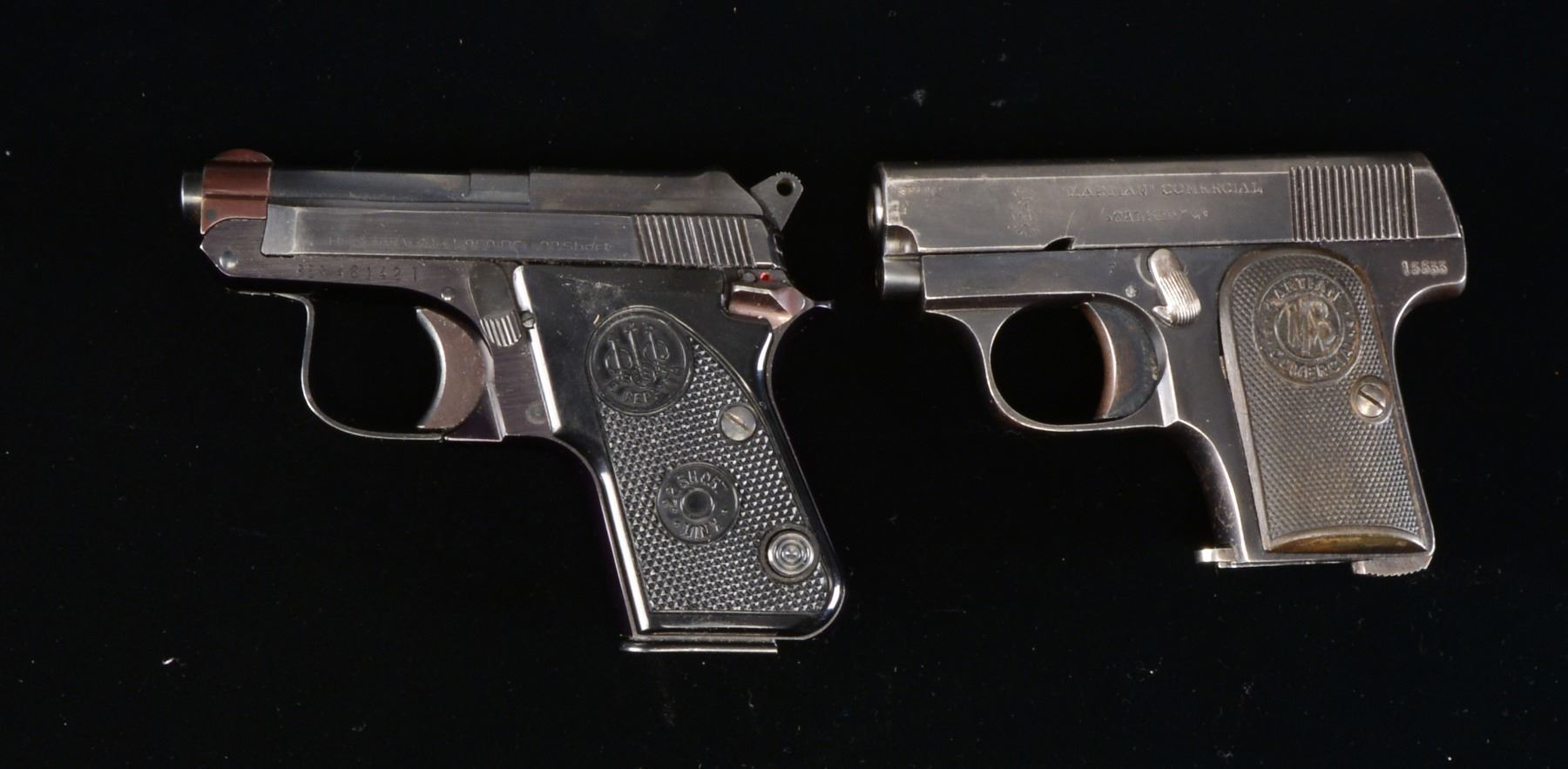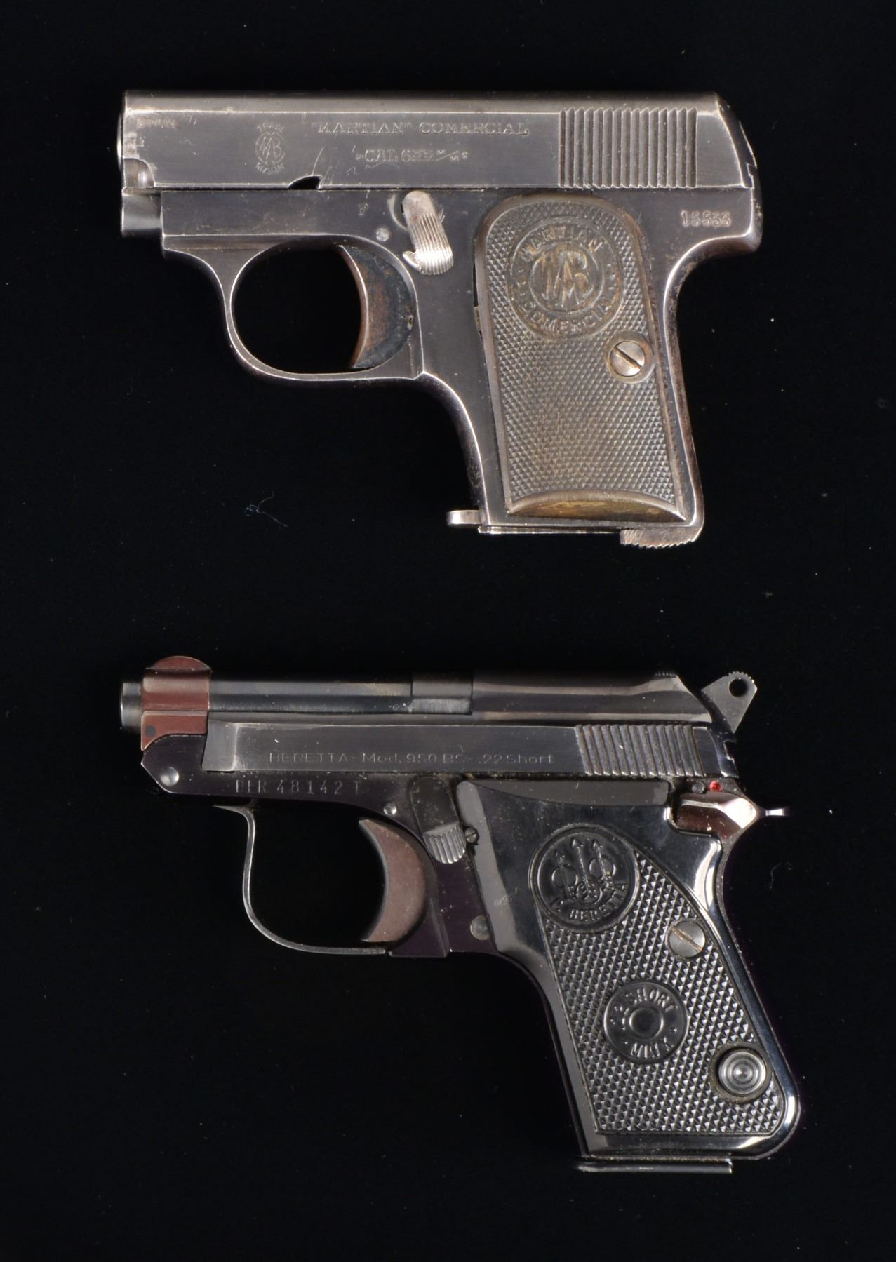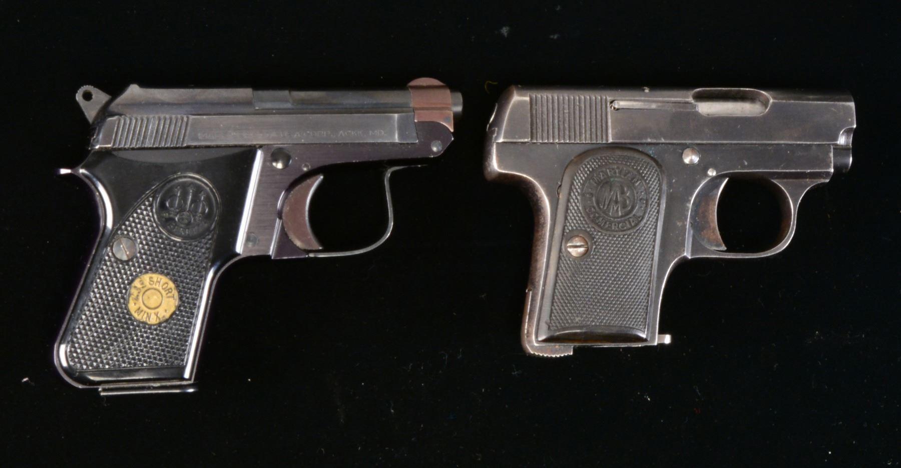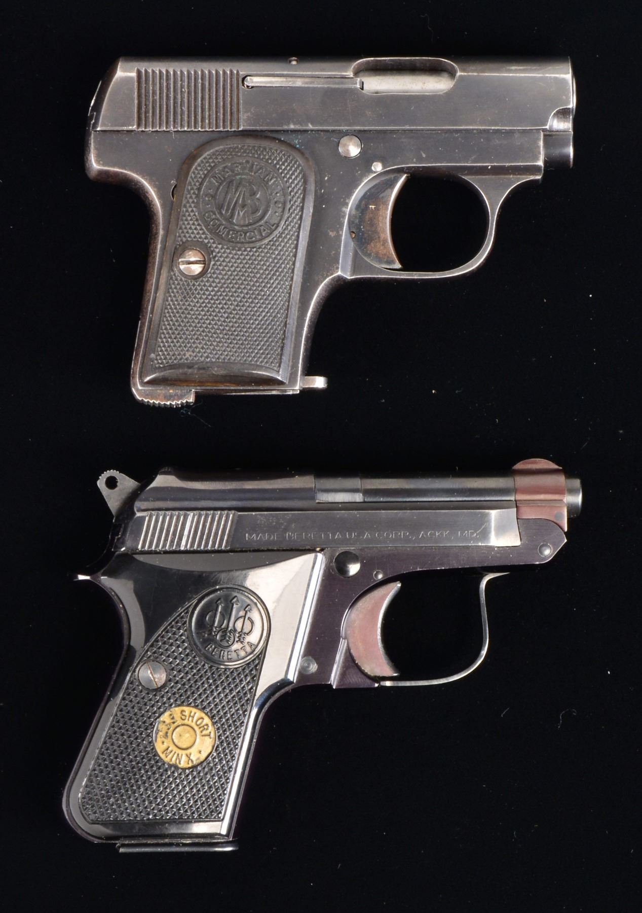 1) MAB MARTIAN. Cal. 6.35mm (25 ACP). S# 15533. Bbl. 2". Mfg. in Spain from 1919-1928 as simplified copy of 1906 Browning by Martin A. Bascaran. Left side of slide w/ MAB logo & ""MARTIAN" COMMERCIAL". Checkered hard rubber grips. MAGS: 1 good 6 rd. CONDITION: good overall w/ slight fading of bluing plus light high point wear & occasional spot of peppery oxidation. Fair bore w/ even light pitting. Good hand worn grips. (20-770/NW). CURIO. 2) BERETTA MODEL 950BS. Cal. 22 Short RF. S# BER 48142 T. Bbl. 2 3/8". Mfg. 1978-2002 in USA w/ blued finish plus checkered black plastic grips having PB logo & "MINX" marking. Often called "Jetfire". MAGS: 1 factory 8 rd. CONDITION: overall near excellent w/ hint of high point wear. Near excellent bore & grips. (20-771/NW). MODERN. $350-500.