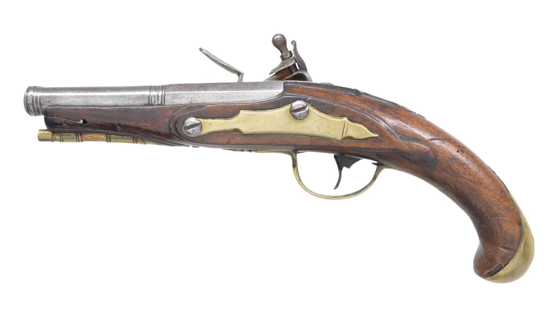 Cal. about 42. NSN. Bbl. 5" oct. w/ faceted transitions to rnd. transition & at cannonade muzzle. Rifled bore. Unmarked lock. Pin fastened walnut stock has relief carving around lock, sideplate, top tang & ram rod channel areas. Brass fittings include buttcap, trigger guard, sideplate, faceted thimble & single faceted pipe. Brass tipped replacement hardwood ramrod. CONDITION: metal has cleaned gray appearance showing scattered pitting. Stock shows wear w/ heavy dents & handling marks. Butt area shows added wood & epoxy repairs. Ramrod channel & forearm tip area shows cracks & chips. Dark pitted bore showing remnants of rifling. (01-17050/DS). ANTIQUE. $300-450.