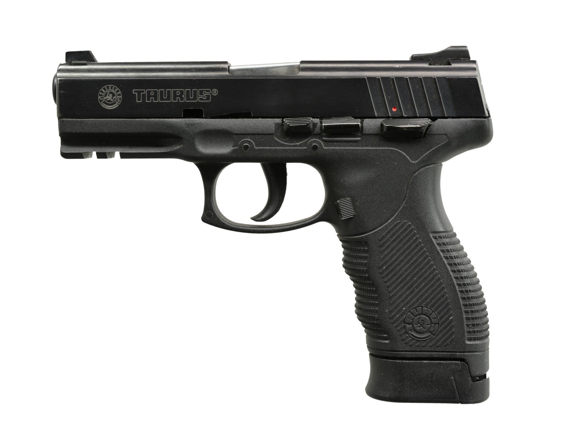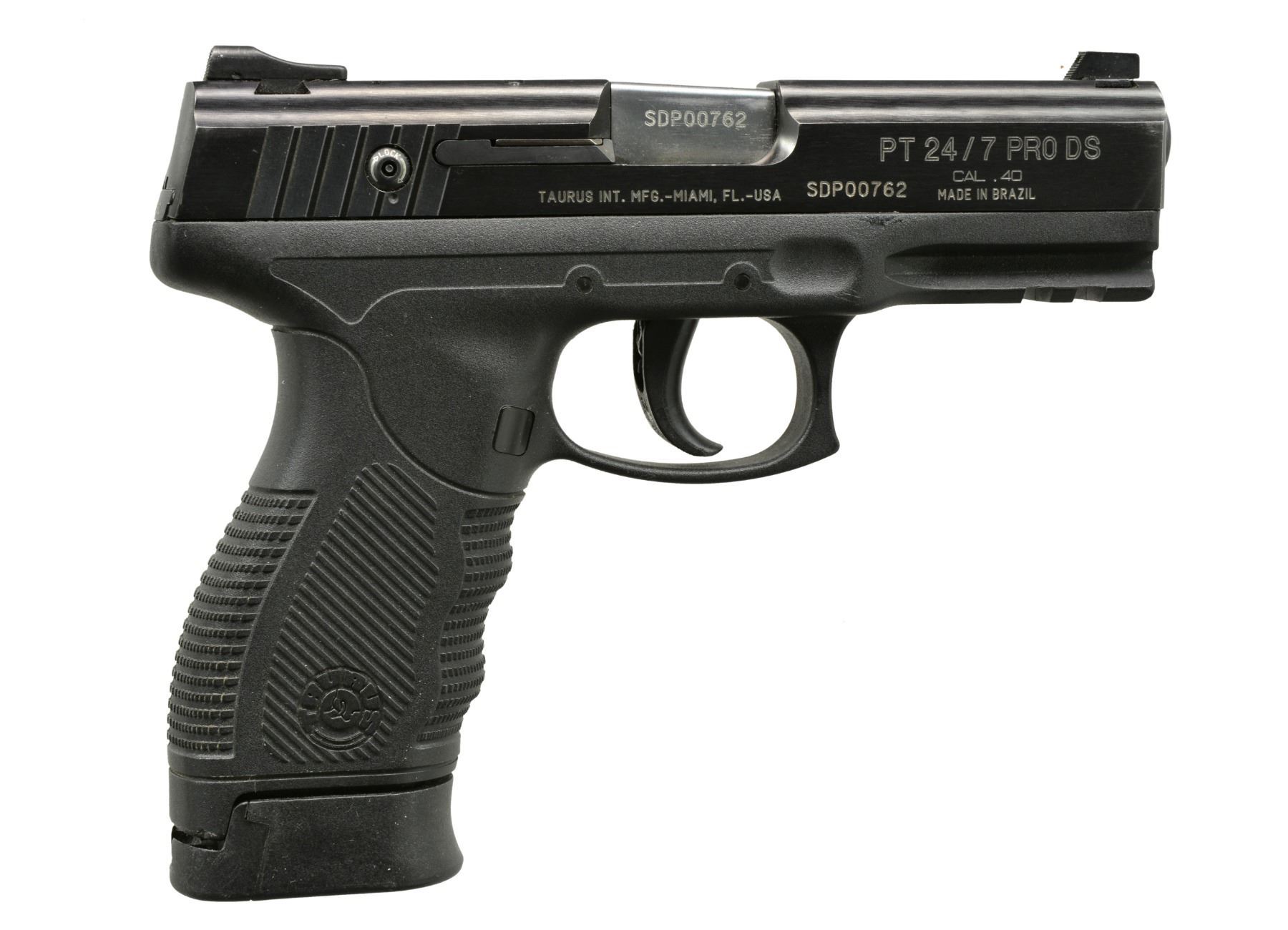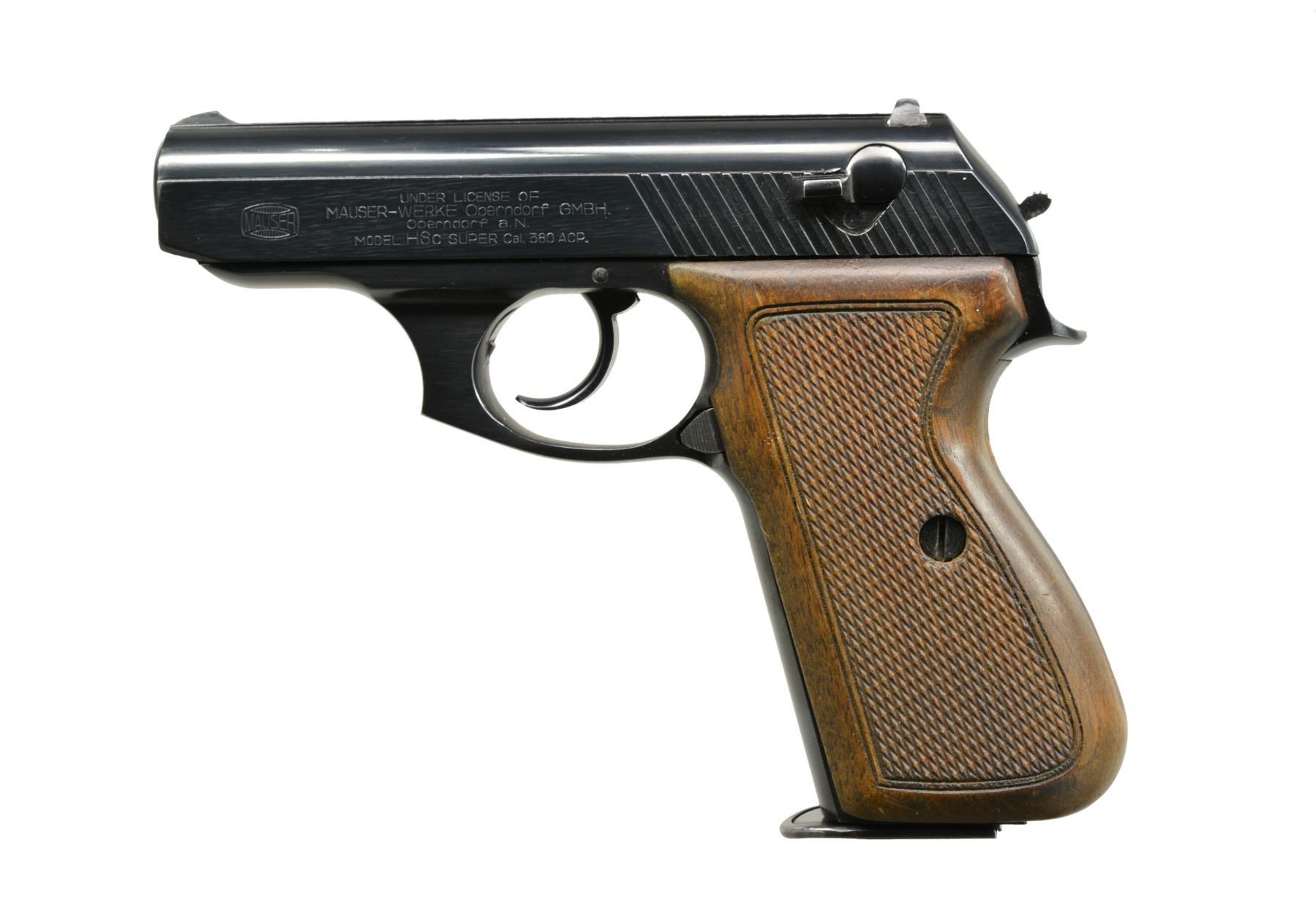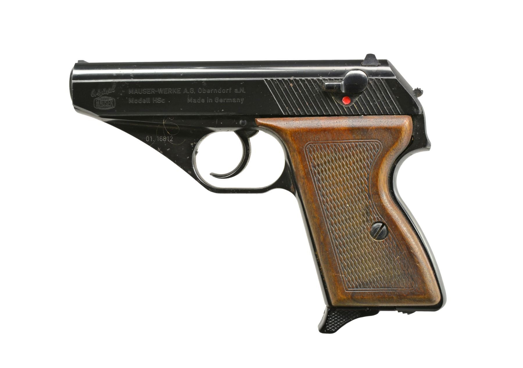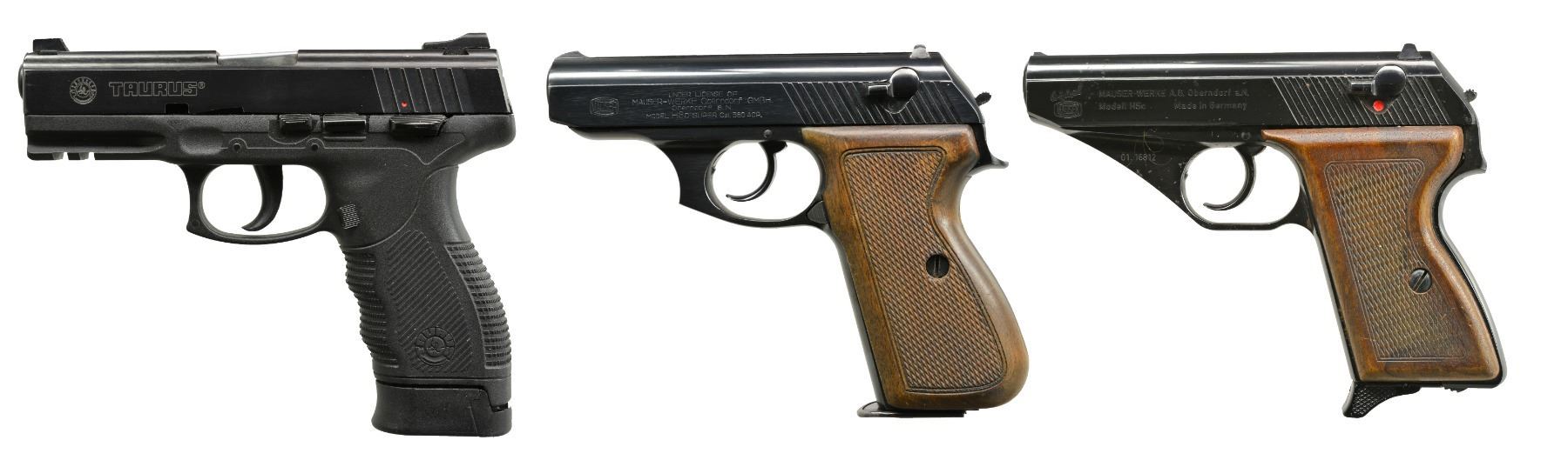 1) TAURUS MODEL PT 24/7 PRO DS. Cal. 40 S&W. S# SDP00762. Bbl. 4 1/4". Mfg. in Brazil w/ black polymer frame having grooved finger groove grip & accessory rail. Matching numbered frame, blued slide & bbl. Square profiled slide w/ dovetailed 3 dot fixed sights & key lock in right cocking grooves. Striker fired in SA mode yet if it fails to fire, firing pin can be reactivated w/ DA trigger pull. Frame mounted thumb safety. MAGS: 1 blued factory 15 rd. w/ finger extension base. CONDITION: very faint high point wear near muzzle. All other aspects near excellent. (20-582/NW). 2) RENATO GAMBA MODEL MAUSER HSc SUPER. Cal. 380 ACP. S# 03425. Bbl. 3 1/2". Mfg. 1982 in Gardone Italy under license of Mauser & imported by Navy Arms. Modern update of original HSc incorporating push button mag. release & high capacity functioning. Fixed front sight & drift adj. rear. Slide mounted safety. MAGS: 1 very good blued 15 rd. w/ "ARG" marked body & Mauser banner push button floorplate. CONDITION: hint of high point slide wear near muzzle; all other aspects including bore & grips near excellent. (20-583/NW). 3) MAUSER MODEL HSc. Cal. 9mm Kurz (380 APC). S# 01-16812.Bbl. 3 3/8". Mfg. 1970 & imported by Interarms. Blued w/ matching numbered slide having side safety plus sighting trough w/ fixed front sight & drift adj. rear. Checkered hard wood grips. Bottom mag. release. MAGS: 1 good Mauser banner marked 8 rd. w/ black plastic finger extension base. CONDITION: scattered peppery oxidation plus faint high point wear at front of slide. Hand worn grips; especially bottom rear of left. Near excellent bore. (20-584/NW). ALL MODERN. $650-900.