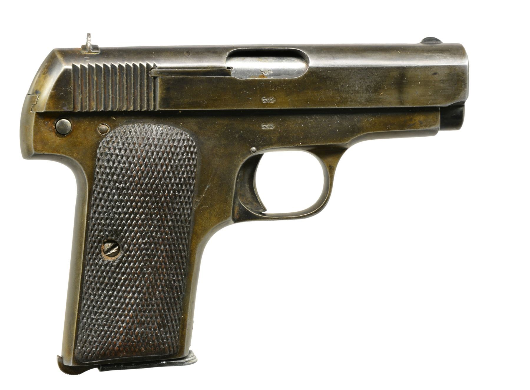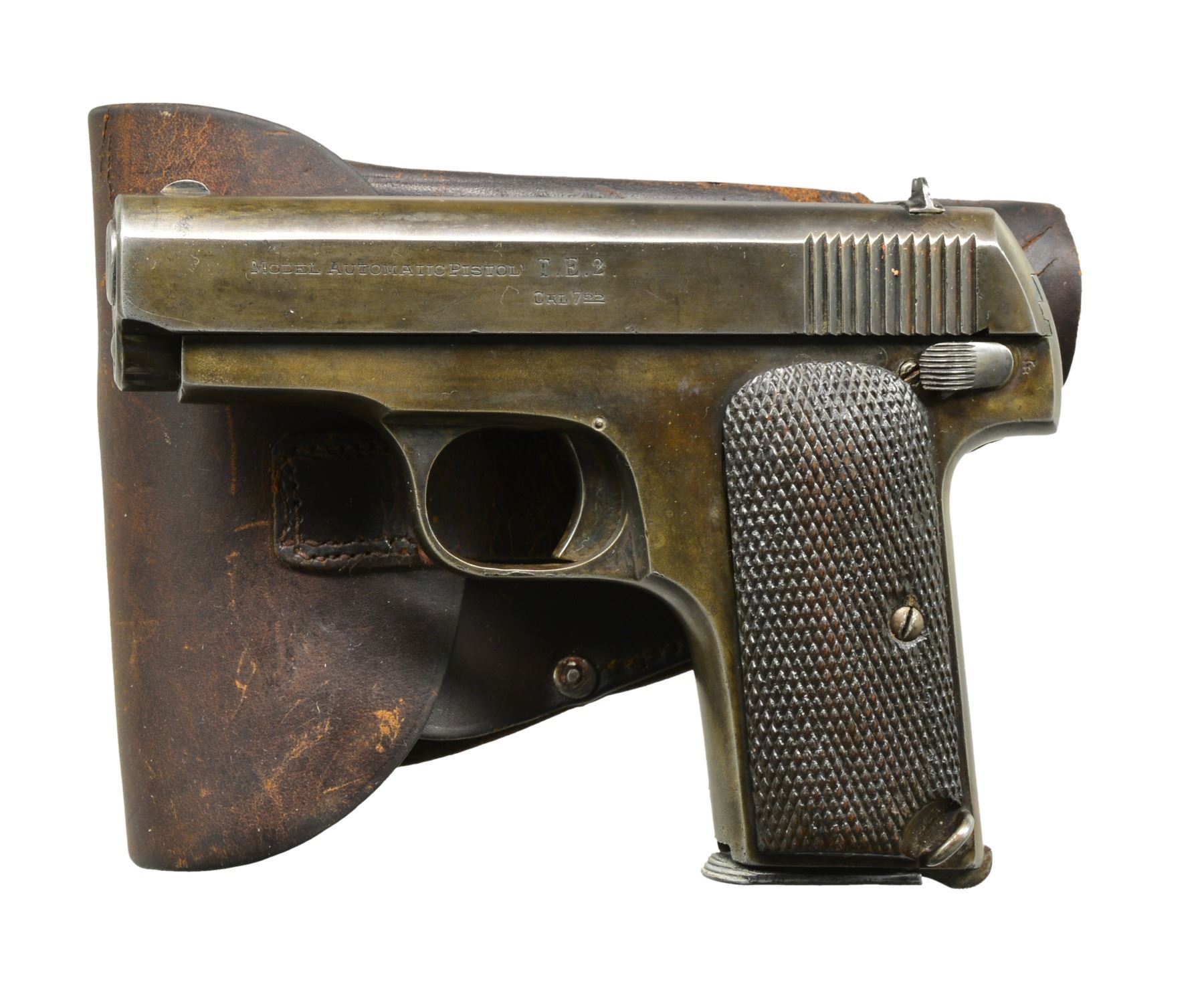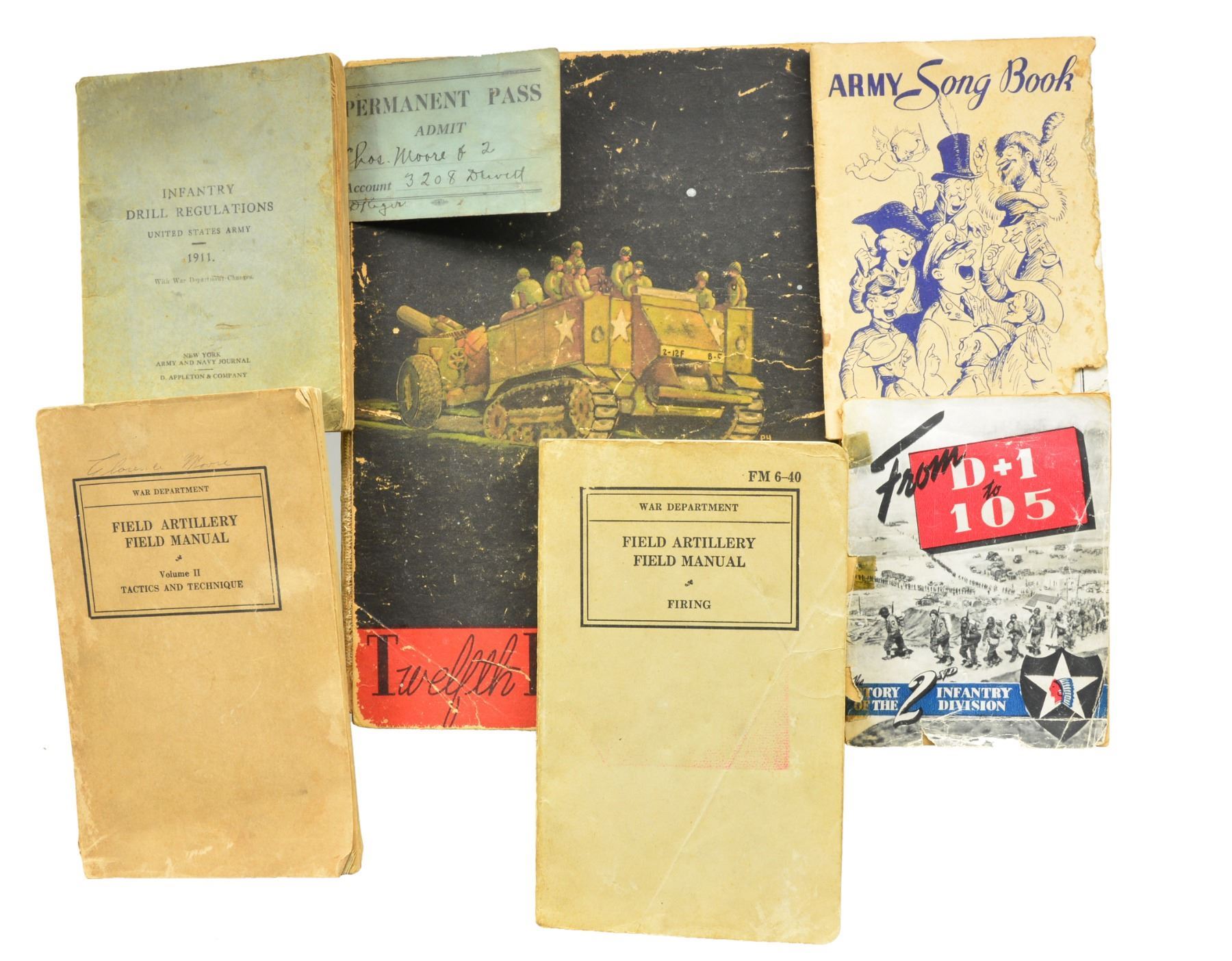 WWII BOOKS. Cal. 7.65mm (32 ACP). S# 39. Bbl. 3 1/4". Mfg. in Spain by Arizmendi & Goenega. Most commonly marked "American Automatic" along w/ "WALMAN" at top of checkered hard rubber grips. Checkered hardwood grips plus lanyard loop on lower left rear of frame. German crown N proofs in vertical line on frame, slide & bbl. Fixed sights w/ rear appearing added after mfg. MAGS: 1 good Sauer & Sohn 7 rd. modified at base to work w/ WALMAN latch. Noticeably snug for last half of insertion. UNATTACHED ACCESSORIES: fair oiled brown flap holster w/ stud & strap retention. Mag. pouch on front, open bottom & angled wide belt loop on back. Under flap appears marked in lg. letters "U. A.X.I" plus inked"G. Leifner M plus 4-5 unreadable letters". Partial maker's stamp w/ only"INDEL" over "3" readable. BOOKS: 1) WWII Twelfth Field Artillery Yearbook 7.5" X 10.5" w/ member listings at back. Fair w/ broken spine. 2) 1911 pocket sized Infantry Drill Regulations Manual in fair to good condition. 3) 1939 FM 6-40 Field Artillery Field Manual for firing; good condition. 4) 1932 Field Artillery Field Manual, Volume II, Tactics & Technique in fair to good condition. 5) 1941 Army Song Book; in fair condition due to chewed edge opposite spine. 6) Mid 1940's "From D+1 to 105", "Story of the 2nd Infantry Division" fair & missing back cover. CONDITION: fair to good overall appearance w/ faded finish & beginning patina appearance in grip area plus rear of frame & slide. Extra finish on grips both front & back w/ slight wear on bottom right. Noticeably weak mag. latch spring. Good bore w/ light wear & hint of frosting. (20-31/NW). CURIO. $500-1,000.