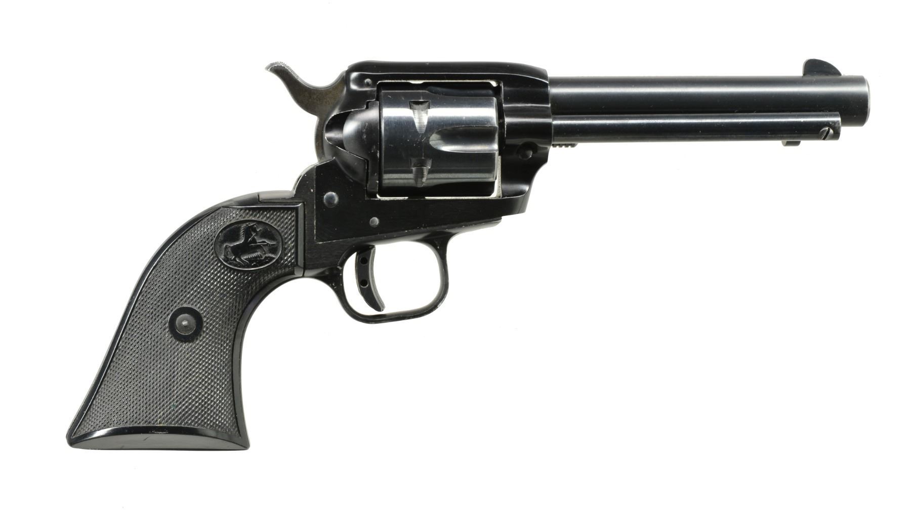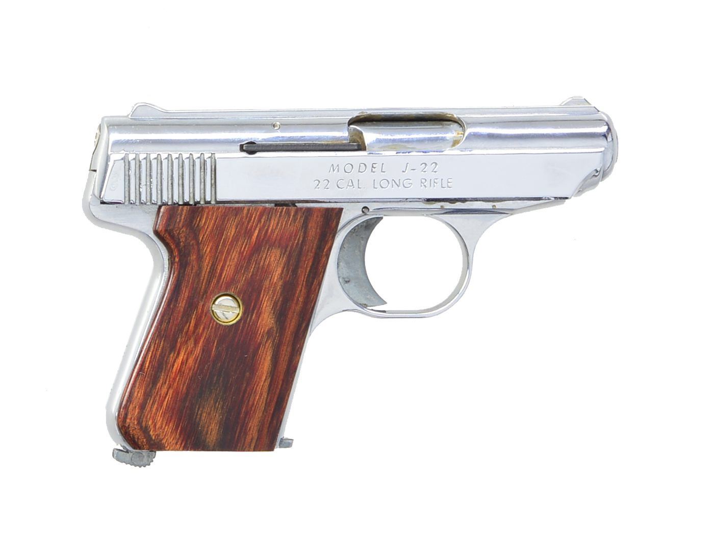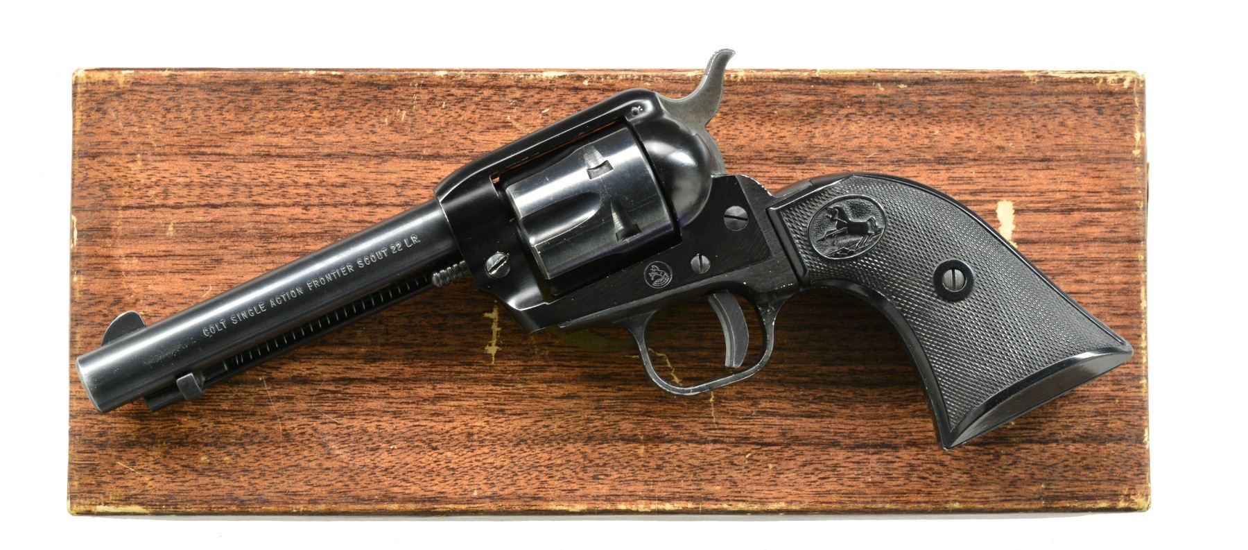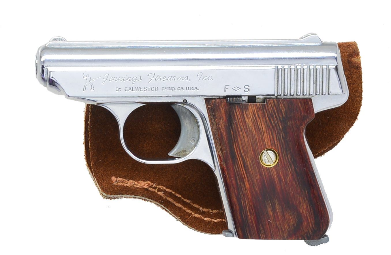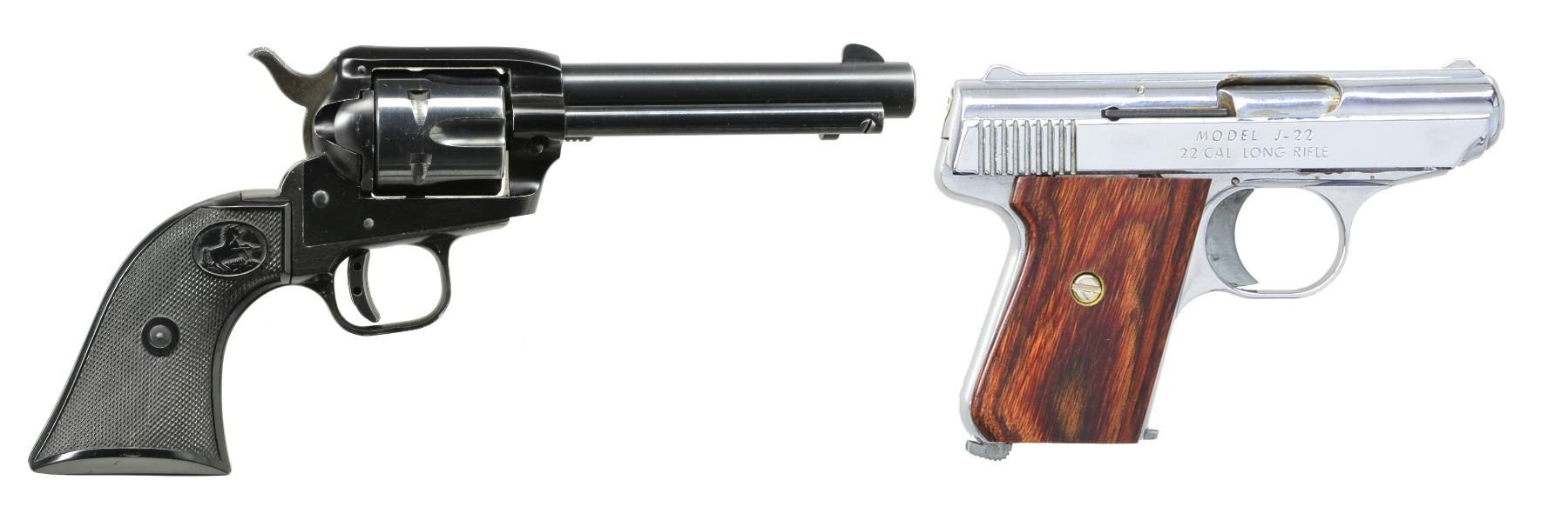 BOTH: cal. 22 LR. 1) COLT FRONTIER SCOUT REVOLVER. S# 155038F. Bbl. 4 3/4" w/ blade front sight & frame notched rear. Mfg. 1962 w/ black alloy frame & Colt logo checkered black plastic grips. Steel trigger shoe installed. UNATTACHED ACCESSORIES: original wood grained box & packaging. Scuffs on edges & portion of lid plus break out of 1 corner of top & base from violent forward motion of bbl. in box. CONDITION: very good general appearance w/ light holster like high point wear & occasional sm. marks. Even gray stained tone to sides of hammer. Very good grips w/ very faint marks on right. Near excellent bore. (20-429/NW). CURIO. 2) JENNINGS MODEL J-22 SEMI-AUTO PISTOL. S# 407630. Bbl. 2 5/8". Mfg. discontinued 1985. Chrome plated w/ alloy trigger & mag. latch. Smooth hardwood grips. Fixed sights on raise rib of slide. MAGS: 1 very good 6 rd. UNATTACHED ACCESSORIES: near excellent Cobra Gunskin IWB suede belt clip holster. CONDITION: all aspects near excellent including bore. (20-430/NW). MODERN. $400-600.