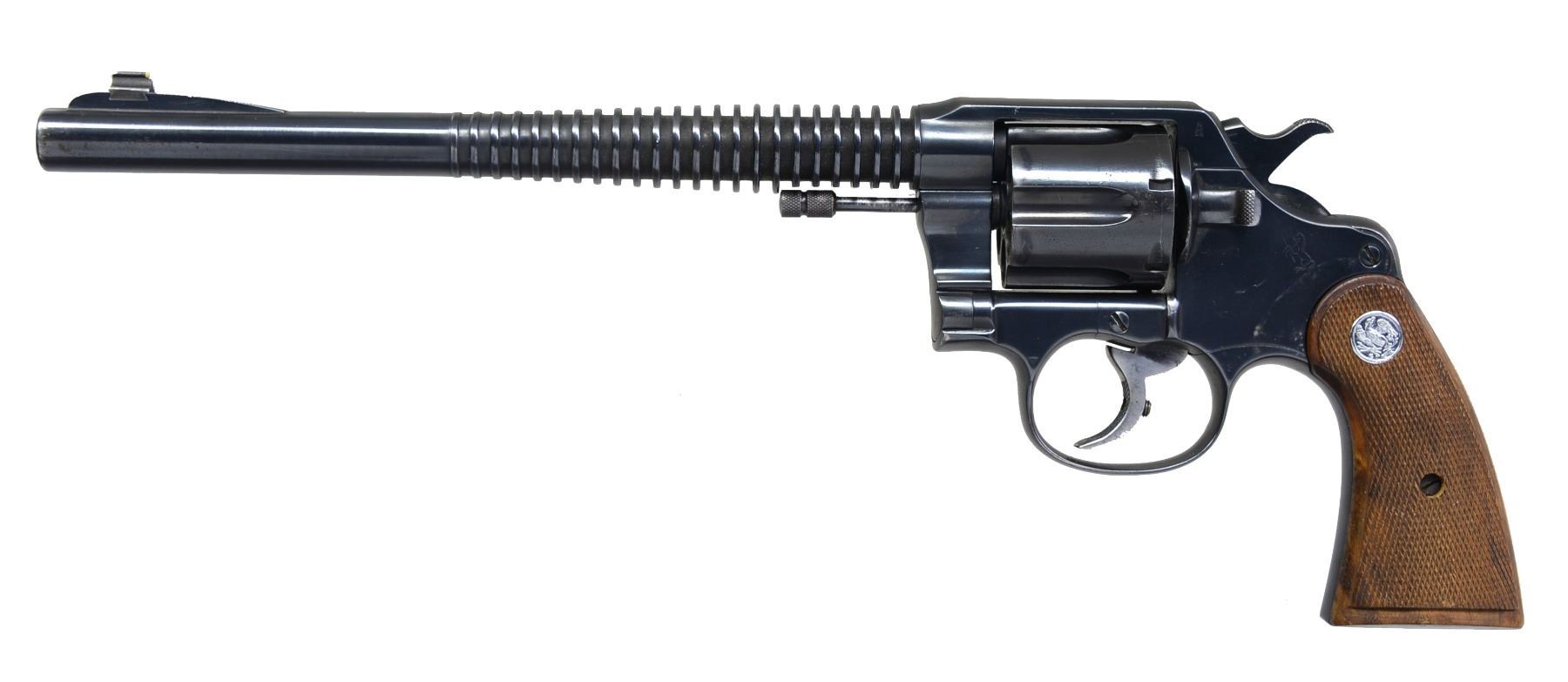 Cal. 45 ACP. S#. 248786. Bbl. 9 9/16" custom made from Thompson machine gun bbl. retaining circular flutes extending 5" from breech end. Ivory bead front sight on a grooved ramp. 6 Shot fluted cyl. Action & hammer are reblued having a matte finish on backstrap & top of frame. Checkered trigger w/ travel stop screw is polished bright. Lanyard ring is removed from butt. Checkered walnut 2 piece grips aftermarket grips w/ silver eagle medallions. CONDITION: over 80% lightly worn reblued finish shows edge wear & scattered scratches. Bore is bright w/ strong rifling. Grips show light wear & marks. (20-1286/DS). CURIO. $300-500.