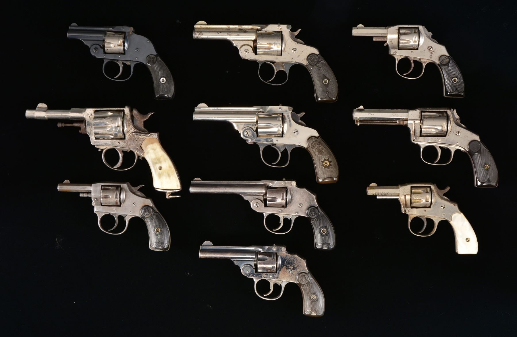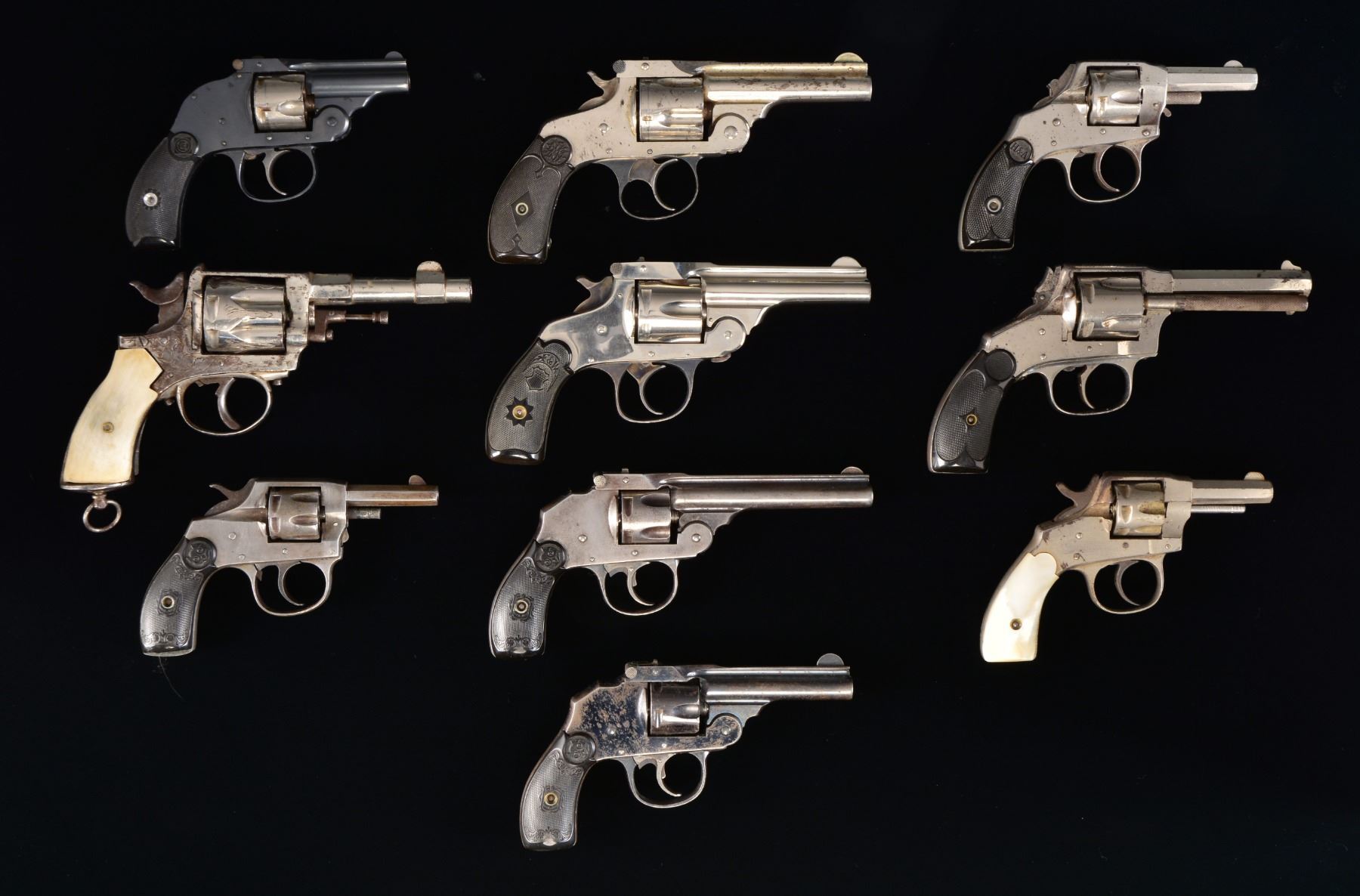 1) BELGIUM. Cal. 8mm Long CF. S# 47 (under grips). Bbl. 3 1/2" rnd. w/ hexagon shank & boss for semi circular front sight. 7 Shot fluted cyl. Solid frame action w/ nickel finish. having open pattern floral engraving w/ lanyard ring at butt. 2 Piece horn replacement grips. CONDITION: 60% nickel. Grips are poorly fit. Bore retains intact rifling w/ some very light pitting. (01-17537/DS). ANTIQUE. 2) HOPKINS & ALLEN XLI. Cal. 22 RF. S# 2511 (under grips). Bbl. 2 1/4" oct. w/ semi circular sight. 7 Shot fluted cyl. Solid frame action w/ nickel finish. 2 Piece mother of pearl grips. CONDITION: 60% nickel showing spots of corrosion & light pitting. Grips show light wear. Action functions only in DA mode. Dark bore w/ light pitting. (20-950/DS). CURIO. 3) HARRINGTON & RICHARDSON HAMMERLESS. Cal. 32 S&W. S# 85478. Bbl. 2" rnd. w/ rib & semi circular front sight & U notch rear sight. 5 Shot fluted nickel finished cyl. Blued top break action. 2 Piece checkered hard rubber grips. CONDITION: bbl. & action retain 90% blue showing spots of freckling. Cyl. retains 80% nickel showing spots of corrosion & drag line. Very good grips. Bore is bright w/ strong rifling showing spots of very light pitting. (20-955/DS). CURIO. 4) HOPKINS & ALLEN XL 5. Cal. 38 S&W. S# 2461 (under grips). Bbl. 3 3/8" w/ blade front sight. 5 Shot fluted cyl. Solid frame action w/ nickel finish. Features include folding hammer spur & checkered ejector housing. CONDITION: 70% nickel showing scattered scratches & spots of corrosion. Grips show light wear. Dark bore shows scattered pitting. (20-956/DS). CURIO. 5) MARLIN MODEL 1887. Cal. 38 S&W. S# 1558. Bbl. 3 1/4" rnd. w/ rib having pinned semi circular front sight & V notch rear sight. 5 Shot fluted cyl. Nickel finished top break action w/ blue trigger guard. 2 Piece checkered hard rubber grips. Estimated quantity of 15,000 mfg. 1877-1899. CONDITION: 75% nickel showing spots of corrosion & light rust. Grips show light wear. Bore retains strong rifling. (20-957/DS). CURIO. 6) HOPKINS & ALLEN XL. Cal. 22 RF. S# 7736. Bbl. 2 1/2" oct. w/ semi circular sight. 7 Shot fluted cyl. Solid frame action w/ nickel finish. 2 Piece checkered hard rubber grips. CONDITION: 70% nickel showing spots of wear & corrosion. Grips show moderate wear. Hammer is missing it's folding spur. Bore has worn rifling & scattered pitting. (20-959/DS). CURIO. 7) IVER JOHNSON MODEL 1900. Cal. 22 RF. S# 21076 (under grips). Bbl. 2 1/4" oct. w/ blade front sight. 7 Shot fluted cyl. Solid frame action. 2 Piece checkered hard rubber grips w/ owl's head medallions. CONDITION: cleaned metal has gray coloration from cold blue use. Grips have lg. chips at butt. Trigger return spring is collapsed. Dark bore w/ intact rifling. (20-966/DS). CURIO. 8) IVER JOHNSON 32 SAFETY HAMMERLESS. Cal. 32 S&W (Short). S# 13250. Bbl. 4" rnd. w/ rib having semi circular front sight & U notch rear sight. 5 Shot fluted cyl. Top break action. Checkered hard rubber grips w/ owl's head motif. CONDITION: cleaned gray metal w/ scattered light pitting & handling marks. Grips show moderate wear. Dark lightly pitted bore. (20-979/DS). CURIO. 9) FOREHAND & WADSWORTH TOPBREAK. Cal. 32 S&W. S# 20919. Bbl.3 1/4" rnd. w/ rib having semi circular front sight & V notch rear sight. 6 Shot fluted cyl. Nickel finished action w/ blued trigger guard. 2 Piece checkered hard rubber grips. CONDITION: action retains over 95% nickel showing light scratches. Trigger guard has fading blue. Very good grips. Bore is bright w/ strong rifling. (20-1037/DS). CURIO. 10) IVER JOHNSON 32 SAFETY HAMMERLESS. Cal. 32 S&W (Short). S# 49767. Bbl. 3" rnd. w/ rib having semi circular sight & V notch rear sight. 5 Shot fluted cyl. Blued top break action. 2 Piece hard rubber grips w/ owl's head motif. UNATTACHED ACCESSORIES: original 2 piece box in fair condition. CONDITION: 60% flaking blue showing spots of surface corrosion. Grips show moderate wear. Bore retains sound rifling showing scattered pitting. (20-1151/DS). CURIO. $900-1,500.