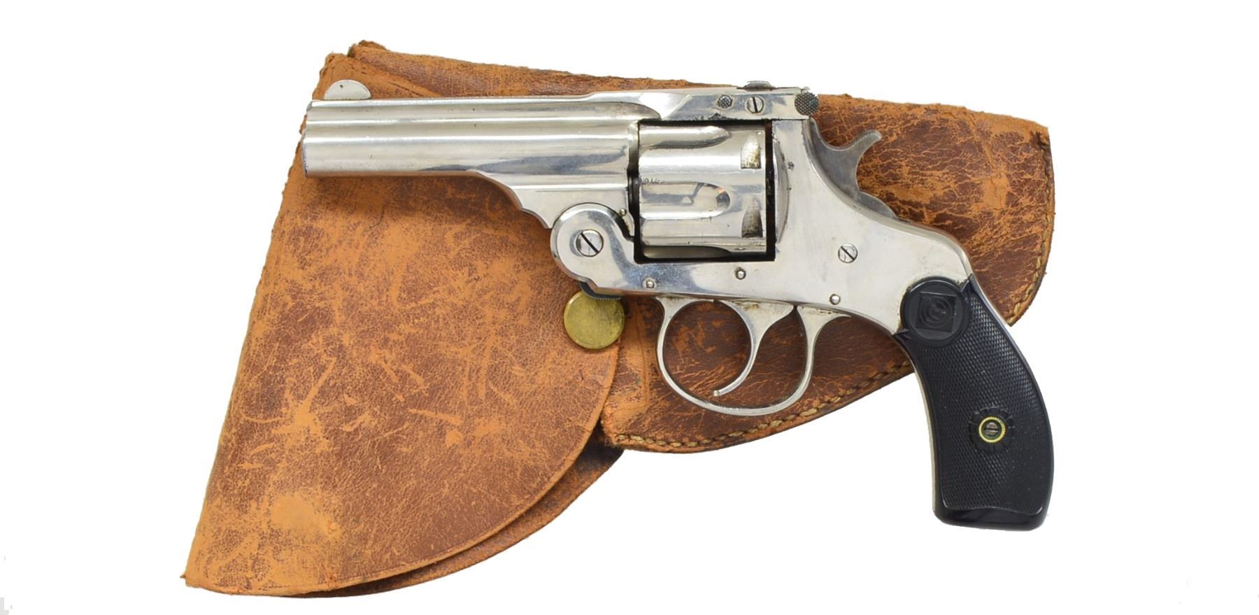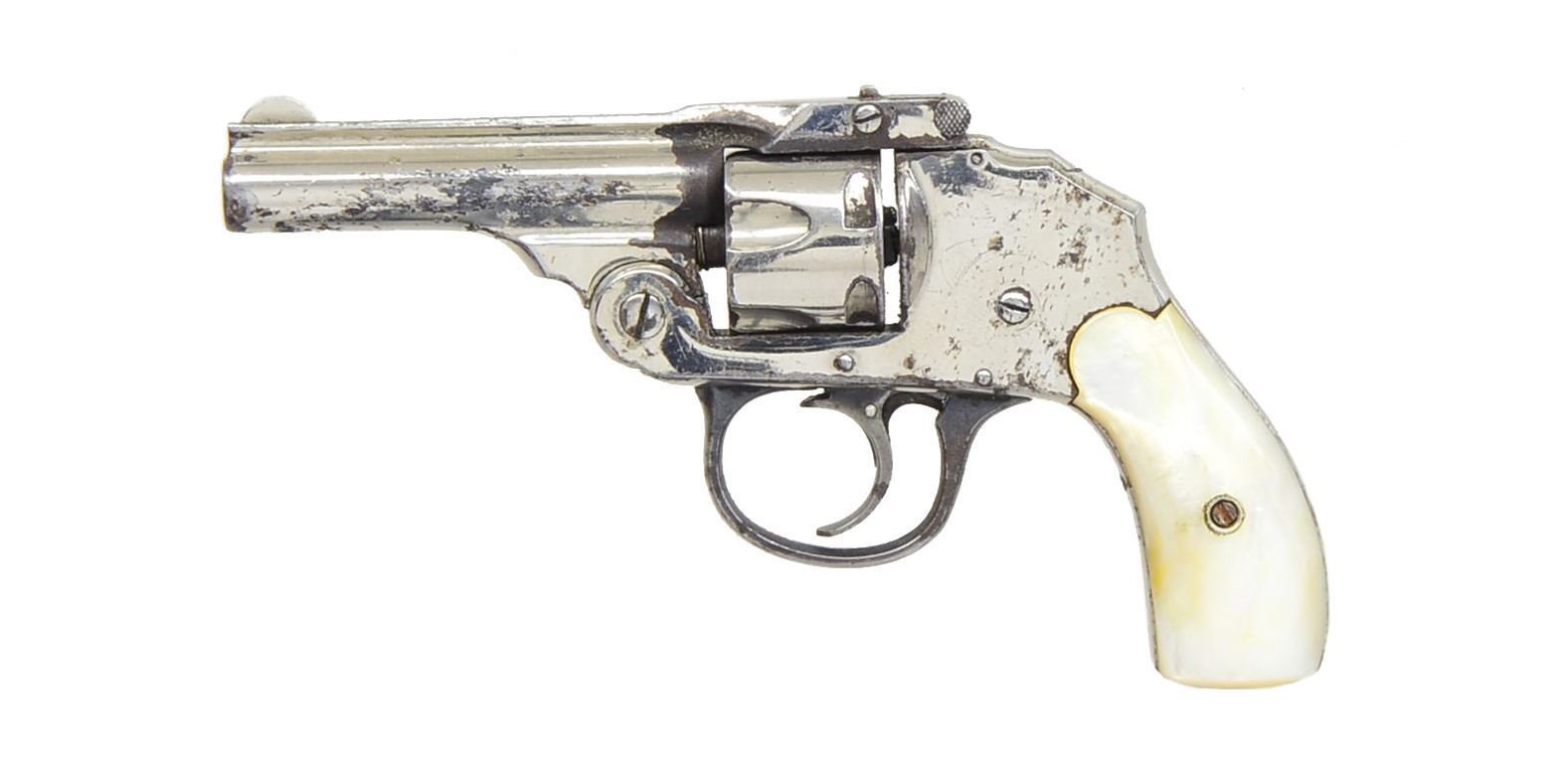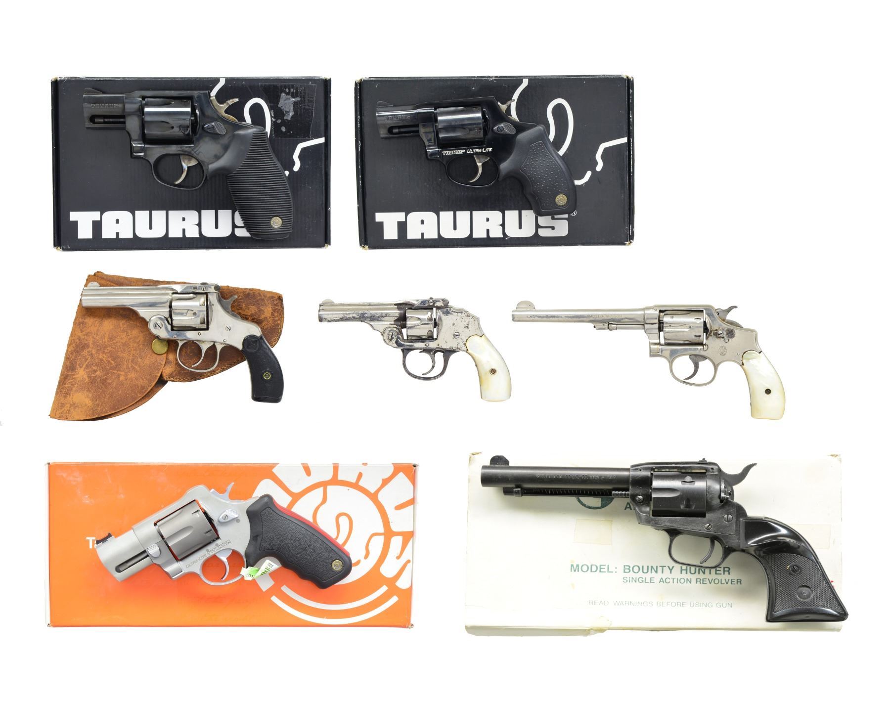 1) H&R AUTO EJECTING. Cal. 32 S&W. S# 2744. Bbl. 3 1/4" w/ only patent date of "OCT.4"97". Mfg. 1890-1892 as 2nd Model. Nickel plated including trigger guard w/ case colored hammer & bbl. latch. Checkered hard rubber grips w/ target logo. Matching numbered cyl. (6 rd. fluted) & extractor. Double post, black powder frame indicated by no cal. marking on left side of bbl. plus flat mainspring. UNATTACHED ACCESSORIES: fair well used brown flap holster w/ snap retention & single wide belt loop. CONDITION: good to very good overall appearance w/ areas of slight oxidation & loss of finish appearing on underside of top strap plus both ends of cyl. Very good grips. Fair bore w/ cleaned light to moderate pitting. Proper functioning. (01-17475/NW). ANTIQUE. 2) IVER JOHNSON SAFETY AUTO HAMMMERLESS. Cal. 32 S&W. S# B73808. Bbl. 3". Second model mfg. 1896-1908 w/ nickel plated dbl. post black powder frame having flat mainspring. No cal. marking on bbl. 5 rd. fluted cyl. S# on left front side under grips plus additional 2563 on left side at butt. Pearl grips & blued trigger guard. CONDITION: poor to fair w/ light oxidation & finish loss around firing areas. Loose bbl. latching & non functioning trigger mechanism. Very good grips. Fair pitted bore. 20-498/NW). CURIO. 3) S&W 38 M&P MODEL OF 1905. Cal. 38 Spl. S# 474455. Bbl. 6". Mfg. 1915-1942 as 4th change. Nickel plated w/ pearl grips on rnd. butt frame. Matching numbered bbl., cyl. & blued extractor. CONDITION: generally good appearance w/ peppery oxidation & dull finish along w/ streak of nickel loss on left front half of bbl. Very good grips. Fair to good bore w/ spots of cleaned pitting. (20-499/NW). CURIO. 4) TAURUS MODEL 444 ULTRA-LITE TITANIUM. Cal. 44 Mag. S# HR916221. Bbl. 2 1/2". Raging Bull variation plus satin finished silver alloy frame & bbl. shroud w/ matte gray titanium cyl. Brighter matte appearing stainless parts. Introduced 2005. Hammer key lock plus front & rear cyl. latches. Black textured finger groove grips having red back strap insert. Red fiber optic front sight & frame notched rear. UNATTACHED ACCESSORIES: factory box & packaging. CONDITION: very good to near excellent overall appearance w/ very light marks & beginning cyl. turn line. Appears only handled & cycled; retains hang tag on trigger guard. Near excellent bore & grips. (20-500/NW). MODERN. 5) TAURUS MODEL 405. Cal. 40 S&W. S# ET449739. Bbl. 2" w/ serrated ramp front blade & frame notched rear. Mfg. 2011-2012 w/ blued finish & horizontally grooved rubber Ribber grips. Case colored wide smooth faced trigger & safety lock hammer. UNATTACHED ACCESSORIES: original box & packaging. CONDITION: very faint beginning cyl. turn line plus very sm. marks on cyl. face. General near excellent appearance w/ no signs of firing. Near excellent bore & grips. (20-501/NW). MODERN. 6) TAURUS MODEL 85 ULTRA-LITE. Cal. 38 Spl. S# ZF54030. Bbl. 2" w/ serrated ramp front blade & frame notched rear sights. Blued alloy frame model; discontinued 2012. Pebble grained, finger grooved rubber boot style grips. Smooth case colored trigger & safety lock hammer. UNATTACHED ACCESSORIES: original box & packaging. CONDITION: all aspects near excellent including bore. (20-502/NW). MODERN. 7) EAA EASA. Cal. 22 LR & 22 Mag. S# E41778. Bbl. 4 3/4" w/ blade front sight & drift adj. rear on frame. Mfg. 1994 in Italy & imported by EAA. Blued w/ black alloy frame having checkered black plastic grips w/ thumbrest for RH use. 6 Rd. fluted cyls. Left recoil shield incorporates hammer block safety. UNATTACHED ACCESSORIES: extra 22 mag. cyl. & original box w/ manual. CONDITION: good plus overall appearance w/ thinning somewhat mottled appearance throughout. Near excellent bore & grips. (20-504/NW). MODERN. $1,100-1,600.