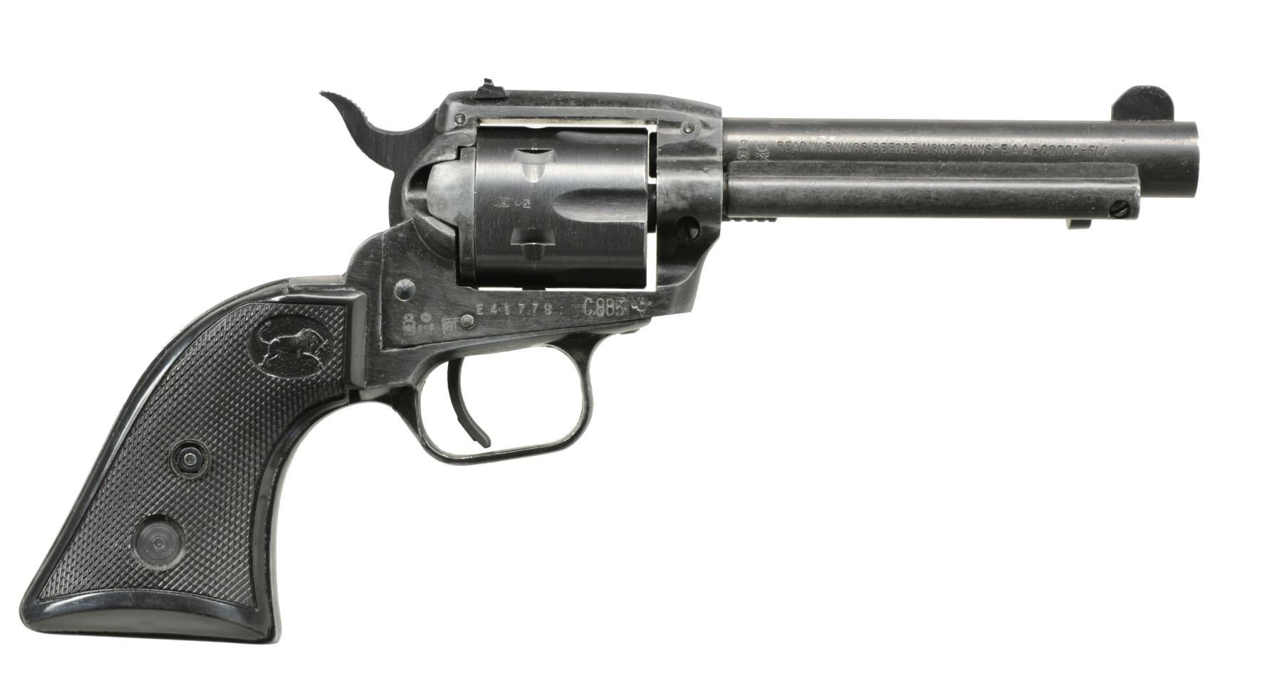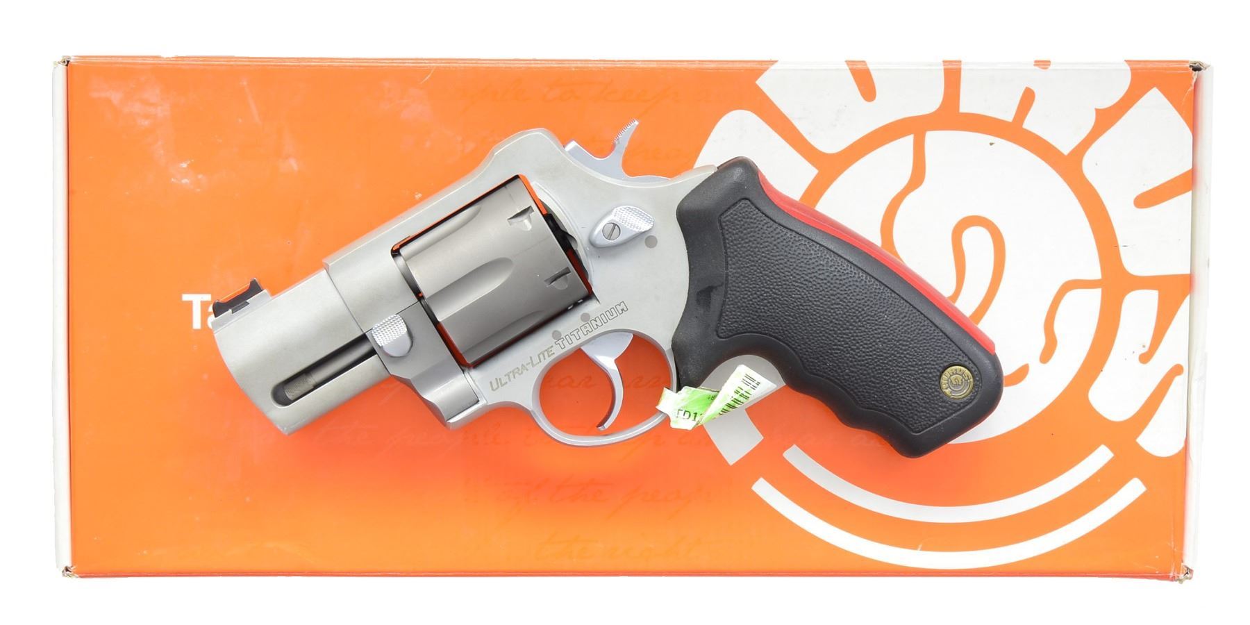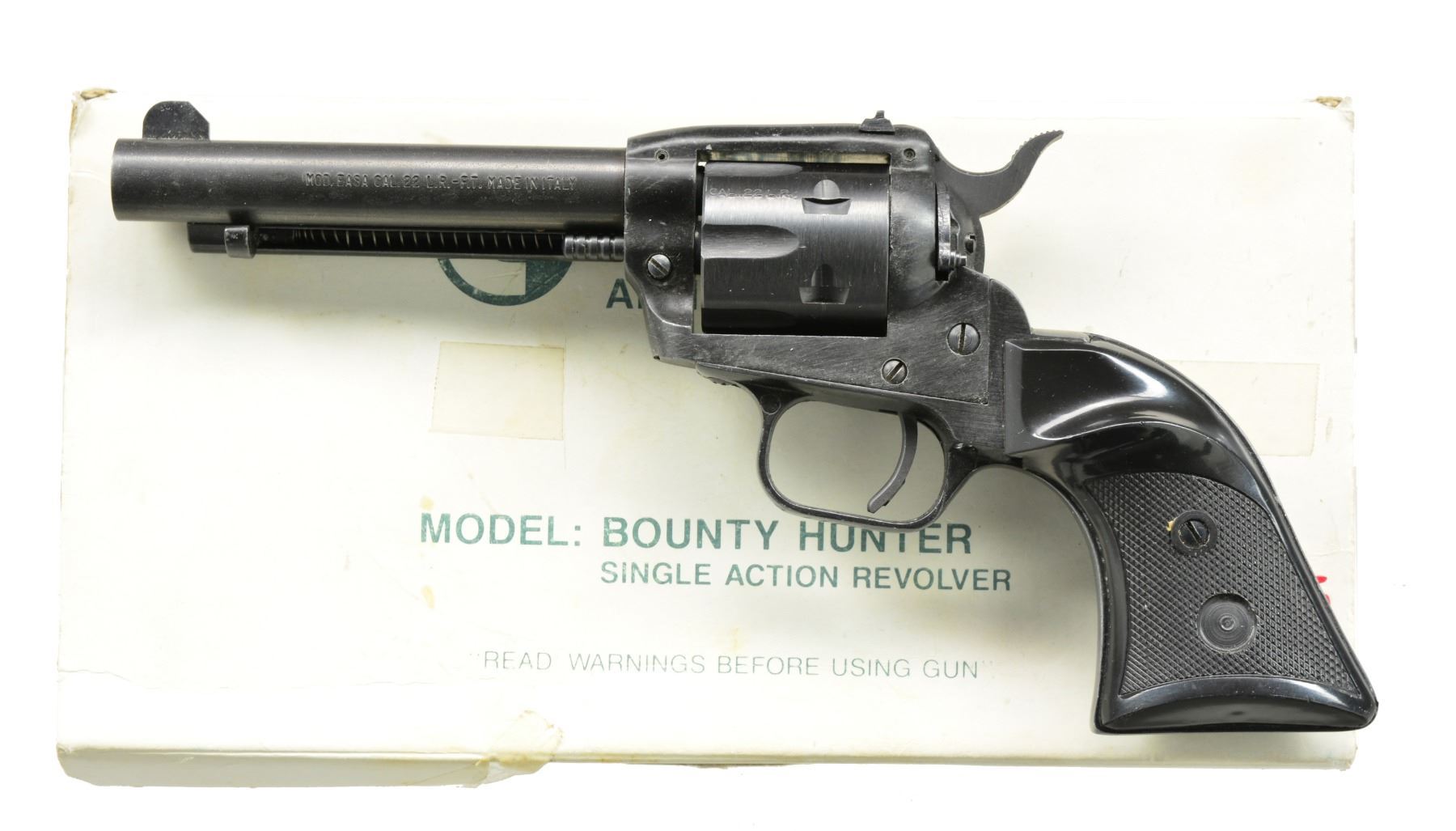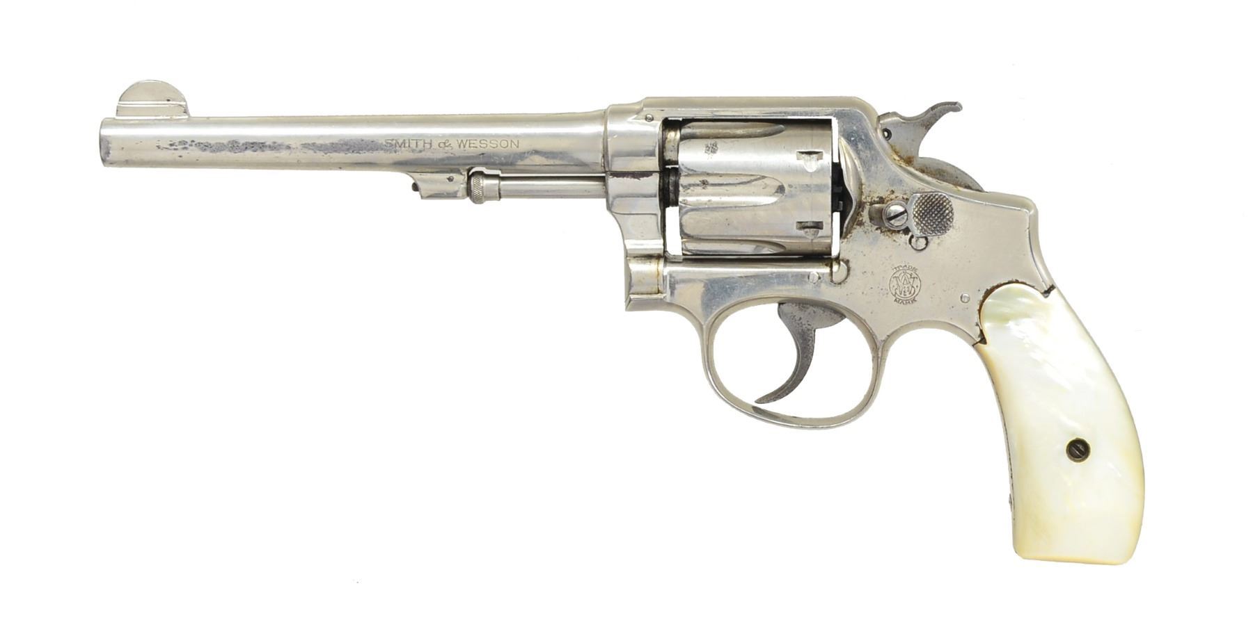 1) H&R AUTO EJECTING. Cal. 32 S&W. S# 2744. Bbl. 3 1/4" w/ only patent date of "OCT.4"97". Mfg. 1890-1892 as 2nd Model. Nickel plated including trigger guard w/ case colored hammer & bbl. latch. Checkered hard rubber grips w/ target logo. Matching numbered cyl. (6 rd. fluted) & extractor. Double post, black powder frame indicated by no cal. marking on left side of bbl. plus flat mainspring. UNATTACHED ACCESSORIES: fair well used brown flap holster w/ snap retention & single wide belt loop. CONDITION: good to very good overall appearance w/ areas of slight oxidation & loss of finish appearing on underside of top strap plus both ends of cyl. Very good grips. Fair bore w/ cleaned light to moderate pitting. Proper functioning. (01-17475/NW). ANTIQUE. 2) IVER JOHNSON SAFETY AUTO HAMMMERLESS. Cal. 32 S&W. S# B73808. Bbl. 3". Second model mfg. 1896-1908 w/ nickel plated dbl. post black powder frame having flat mainspring. No cal. marking on bbl. 5 rd. fluted cyl. S# on left front side under grips plus additional 2563 on left side at butt. Pearl grips & blued trigger guard. CONDITION: poor to fair w/ light oxidation & finish loss around firing areas. Loose bbl. latching & non functioning trigger mechanism. Very good grips. Fair pitted bore. 20-498/NW). CURIO. 3) S&W 38 M&P MODEL OF 1905. Cal. 38 Spl. S# 474455. Bbl. 6". Mfg. 1915-1942 as 4th change. Nickel plated w/ pearl grips on rnd. butt frame. Matching numbered bbl., cyl. & blued extractor. CONDITION: generally good appearance w/ peppery oxidation & dull finish along w/ streak of nickel loss on left front half of bbl. Very good grips. Fair to good bore w/ spots of cleaned pitting. (20-499/NW). CURIO. 4) TAURUS MODEL 444 ULTRA-LITE TITANIUM. Cal. 44 Mag. S# HR916221. Bbl. 2 1/2". Raging Bull variation plus satin finished silver alloy frame & bbl. shroud w/ matte gray titanium cyl. Brighter matte appearing stainless parts. Introduced 2005. Hammer key lock plus front & rear cyl. latches. Black textured finger groove grips having red back strap insert. Red fiber optic front sight & frame notched rear. UNATTACHED ACCESSORIES: factory box & packaging. CONDITION: very good to near excellent overall appearance w/ very light marks & beginning cyl. turn line. Appears only handled & cycled; retains hang tag on trigger guard. Near excellent bore & grips. (20-500/NW). MODERN. 5) TAURUS MODEL 405. Cal. 40 S&W. S# ET449739. Bbl. 2" w/ serrated ramp front blade & frame notched rear. Mfg. 2011-2012 w/ blued finish & horizontally grooved rubber Ribber grips. Case colored wide smooth faced trigger & safety lock hammer. UNATTACHED ACCESSORIES: original box & packaging. CONDITION: very faint beginning cyl. turn line plus very sm. marks on cyl. face. General near excellent appearance w/ no signs of firing. Near excellent bore & grips. (20-501/NW). MODERN. 6) TAURUS MODEL 85 ULTRA-LITE. Cal. 38 Spl. S# ZF54030. Bbl. 2" w/ serrated ramp front blade & frame notched rear sights. Blued alloy frame model; discontinued 2012. Pebble grained, finger grooved rubber boot style grips. Smooth case colored trigger & safety lock hammer. UNATTACHED ACCESSORIES: original box & packaging. CONDITION: all aspects near excellent including bore. (20-502/NW). MODERN. 7) EAA EASA. Cal. 22 LR & 22 Mag. S# E41778. Bbl. 4 3/4" w/ blade front sight & drift adj. rear on frame. Mfg. 1994 in Italy & imported by EAA. Blued w/ black alloy frame having checkered black plastic grips w/ thumbrest for RH use. 6 Rd. fluted cyls. Left recoil shield incorporates hammer block safety. UNATTACHED ACCESSORIES: extra 22 mag. cyl. & original box w/ manual. CONDITION: good plus overall appearance w/ thinning somewhat mottled appearance throughout. Near excellent bore & grips. (20-504/NW). MODERN. $1,100-1,600.