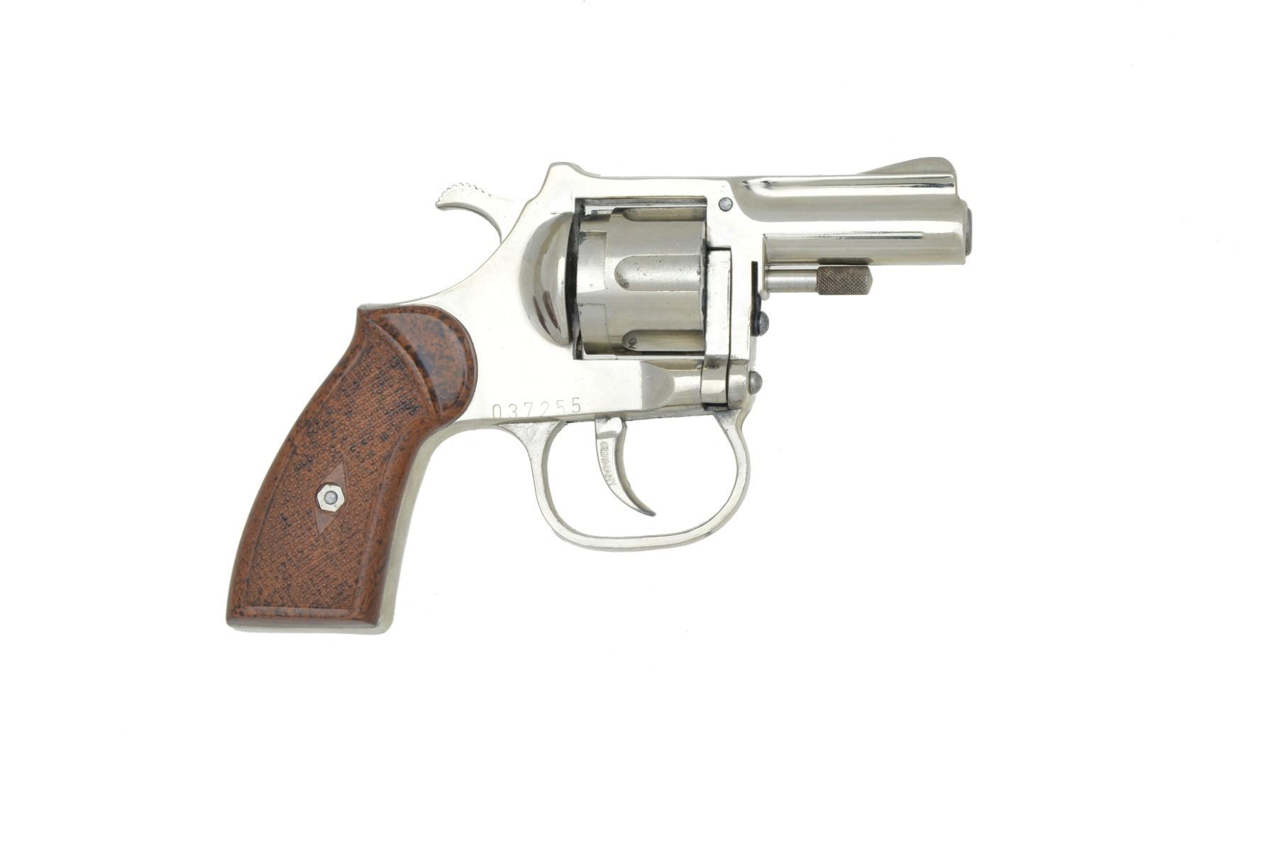 Cal. 22 RF. S# 037255. Bbl. 2 3/16". Chrome plated alloy construction w/ sleeved steel bbl. & checkered simulated wood grips. CONDITION: very good appearance w/ light pitting & peeling finish on cyl. face. Near excellent bore & grips. (19-5524/NW). CURIO. $40-60.