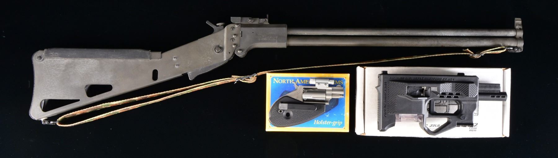 1) NORTH AMERICAN ARMS 22 MAGNUM REVOLVER. Cal. 22 Mag. S# W65740. Bbl. 1". This gun is one of the smallest commercially marketed modern revolvers. Chambered in 22 Mag., it is a handful of firepower in a very sm. package. They were offered in numerous carry configurations & this one utilizes the holster-grip, which covers the trigger mechanism when folded & incorporates a pocket grip for easy access. 5 Rd. cyl. w/ stainless steel construction plus tiny 1.5" laser mounted at the 12 o'clock position. CONDITION: like the vast majority of these guns, there appears to be very little mileage on the operating system. Finish remains as offered w/ only very light indication of actual use. Bore has been used, be it apparently gently & still retains its factory rifling. Fire control mechanism appears to function correctly when cycled by hand. (20-960/JZ). 2) USFA ZIP OPERATOR MODULAR PISTOL. Cal. 22 LR. S# AAF118. Bbl. 5 1/4". This unique modular pistol design has several options for mounting, placement, deployment & uses as part of a weapon system or as a stand alone system itself. Black plastic receiver w/ fixed sights. It utilizes the popular Ruger 10/22 mag. making feeding options affordable & readily available. MAGS: 1-10 rd. Ruger. UNATTACHED ACCESSORIES: factory box, paperwork & spring assortment. CONDITION: all outward impressions give the appearance of a new firearm or one very close to it, it may have been test fired or just well maintained, but it doesn't appear to have earned any character through wear & tear. Fire control mechanism appears to function correctly when cycled by hand. Shiny bore w/ strong rifling. (20-1046/JZ). 3) SPRINGFIELD M6 SCOUT RIFLE. Cal. 22 LR/410. S# M12683. Bbl. 18 1/4". The new M6 Scout is a modern variant of a classic survival rifle. Folding at the receiver it allowed for storage & transport in areas where pounds & inches count most & still provide reasonable fire power to accomplish the task. The original models had short bbls. & were included in the NFA Registry while this current model remains a Title 1 firearm & transfers like any other rifle or shotgun. Designed w/ function over form, there are no luxuries such as wooden forearms or fancy stocks. Black parkerized skeletal design. 22 Long rifle bbl. over the 410 is selectable at the hammer. It utilized what would typically be referred to as a winter trigger, it more resembles a lever that you squeeze w/ your whole hand allowing full use even w/ heavy gloves. In the area that would be the cheekpiece on the stock is a spare ammunition compartment holding 4 rds. of 410 & 15 rds. of 22 rifle. The front sight is a simple blade while the rear sight is selectable between a peep & a notch depending on which bbl. was utilized. Green nylon sling mounted below firearm. CONDITION: metal finish remains intact, complete w/ normal staining & a few areas of thinning at 9:00 on the bbls.; both bbls. are shiny w/ the 22 bbl. retaining strong rifling. (20-1078/JZ). ALL MODERN. $700-1,100.