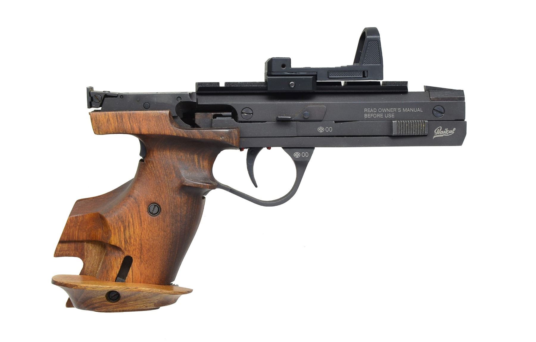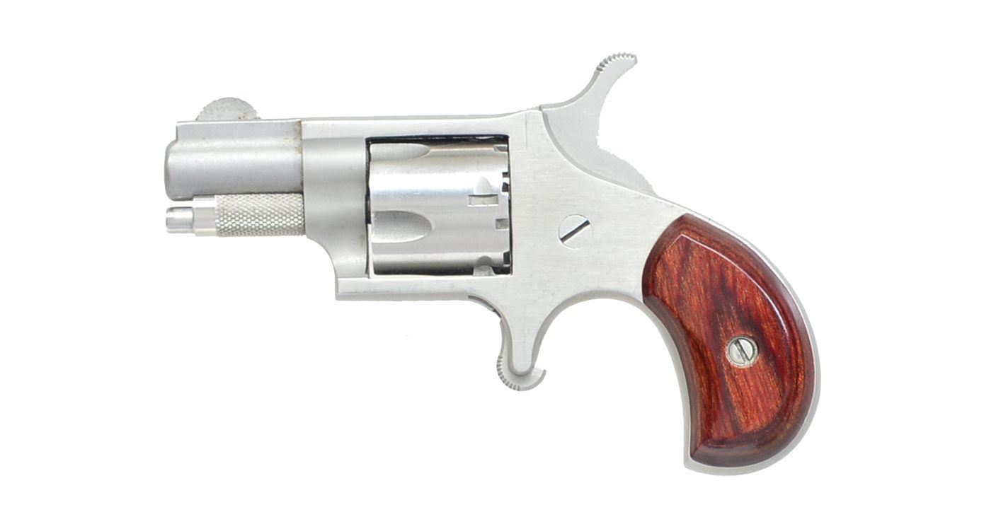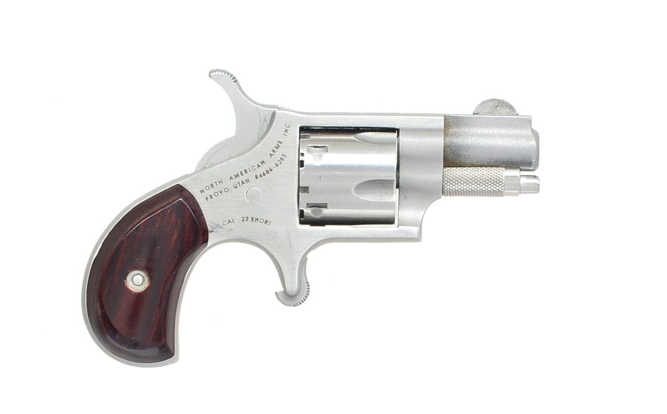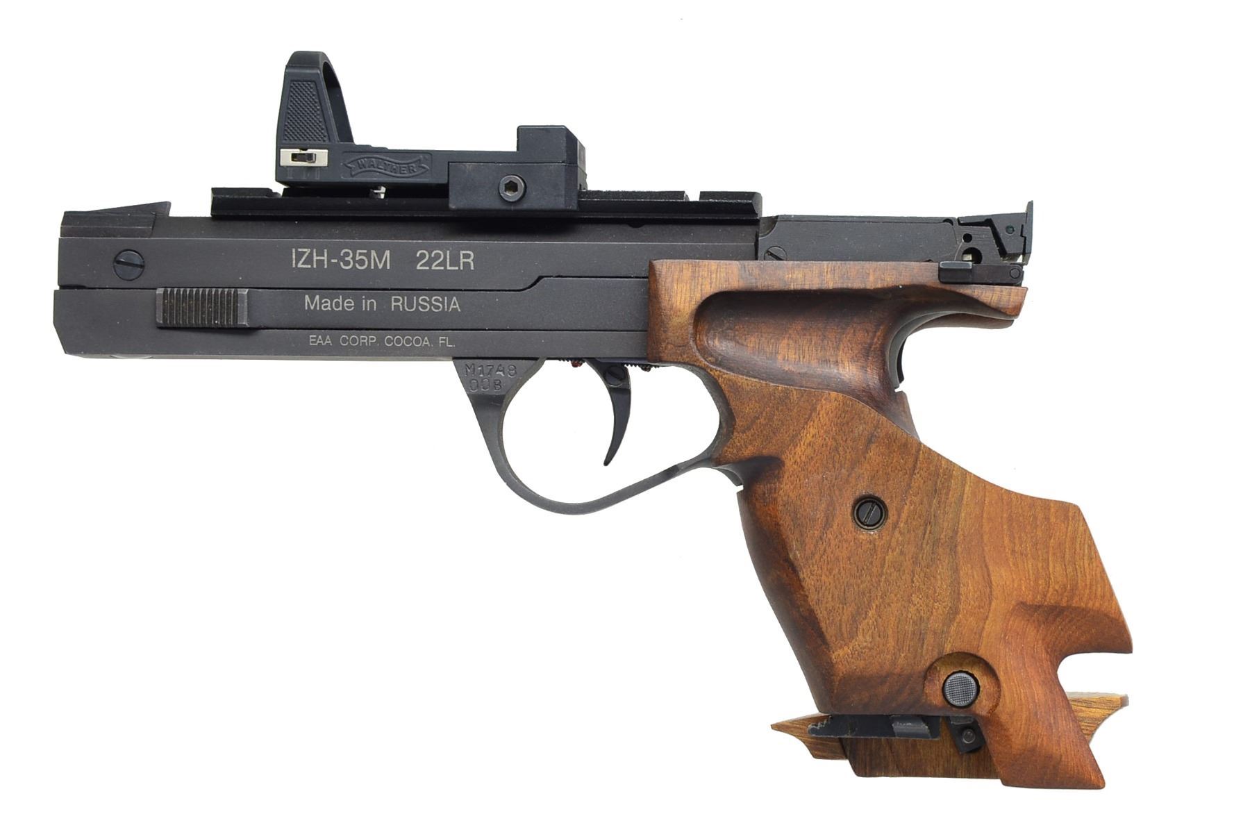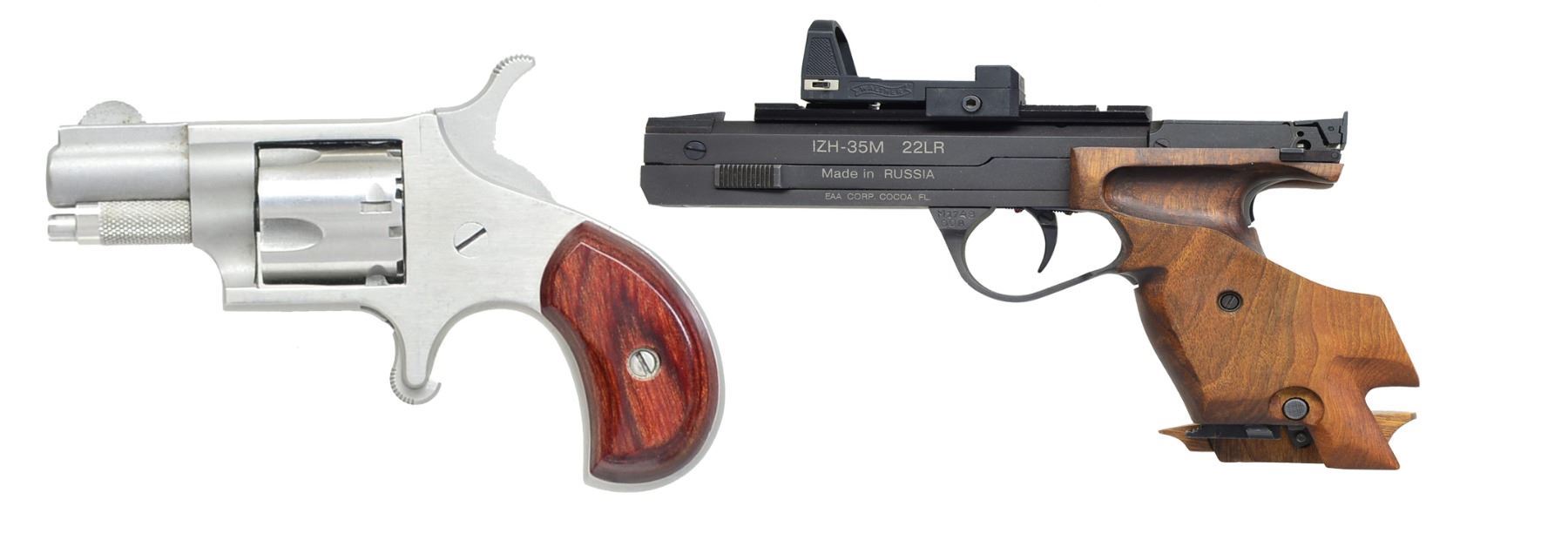 1) NORTH AMERICAN ARMS MINI REVOLVER. Cal. 22 Short. S# 37934. Bbl. 1 1/8" w/ rib mounted semi circular front sight. 5 Shot fluted cyl. Stainless steel construction w/ spur trigger. 2 Piece bird's head grips. UNATTACHED ACCESSORIES: original box containing owner & instruction manual w/ NRA promotion paper, zip up pouch, leather belt holster & black web holster. CONDITION: frame shows light scratches & marks. Very good grips. Bore retains sound rifling. (20-1146/DS). 2) EAA / BAIKEL IZH-35M SEMI AUTO TARGET PISTOL. Cal. 22 LR. S# M174800B. Bbl. 6" hammer forged. Adj. trigger assembly. Integral grip safety. Slide features cocking indicator. Patridge front sight w/ square notch adj. target rear sight. Walther holo sight on Weaver style base. Fully adj. ergonomic hardwood target grip. MAGS: 3 detachable 5 rd. UNATTACHED ACCESSORIES: foam lined black plastic box containing instruction manuals, packing box end label, parts kit & spare springs. CONDITION: over 98% wood & metal finish. Bore is bright w/ strong rifling. Sight battery is dead. (20-1148/DS). BOTH MODERN. $450-650.