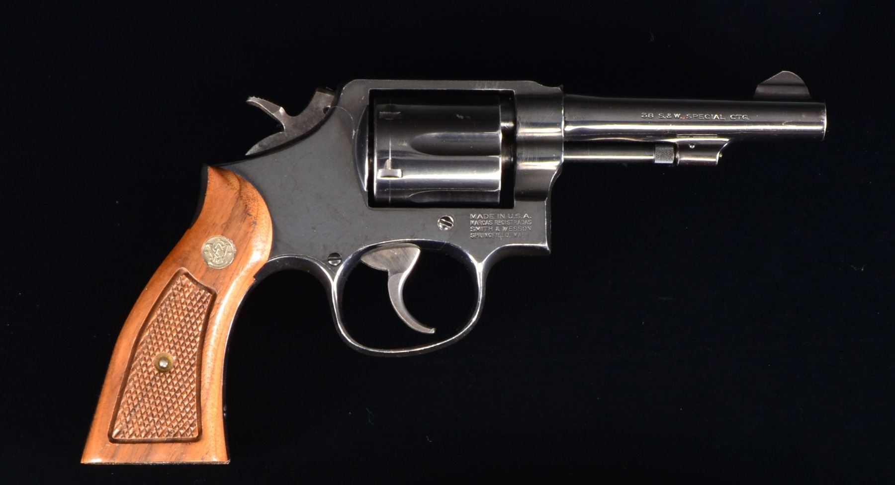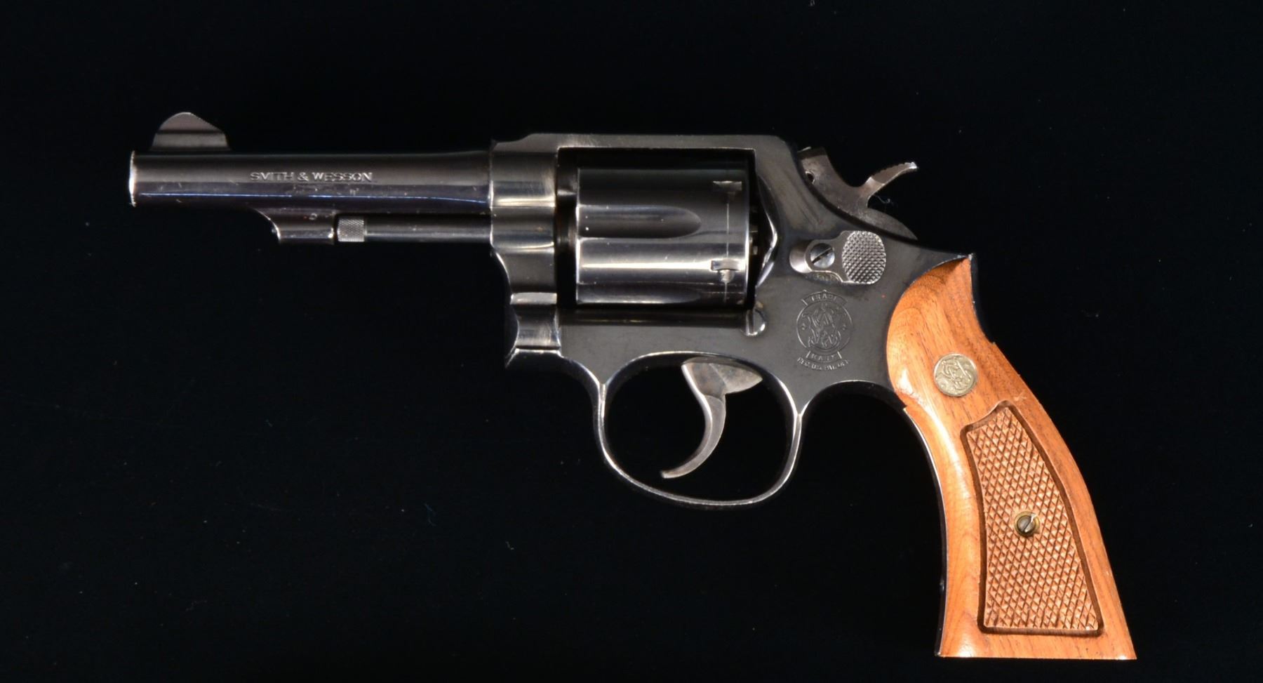 Cal. 38 Spl. S# AEP2619. Bbl. 4" w/ serrated ramp front sight. 6 Shot fluted cyl. 3 Screw action. Case colored target hammer & case colored smooth trigger. 2 Piece checkered walnut Magna grips w/ S&W medallions. CONDITION: 85% blue showing edge wear. Grips show handling marks. Bore retains sound rifling showing some letting. (20-842/DS). MODERN. $300-500.