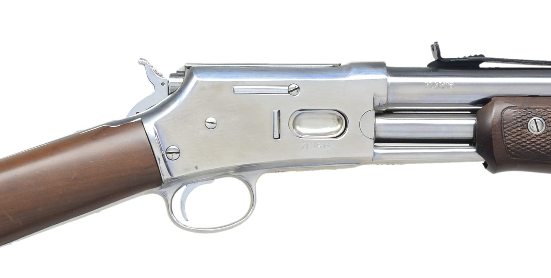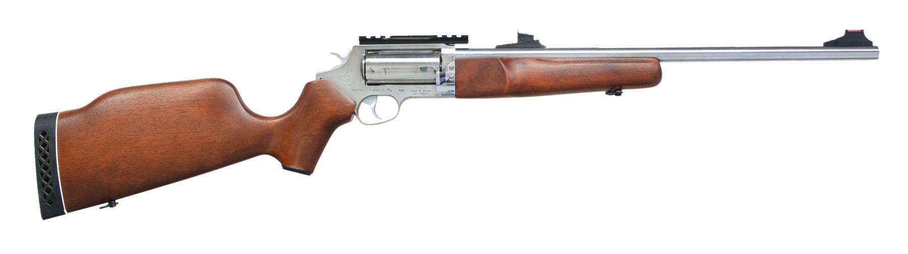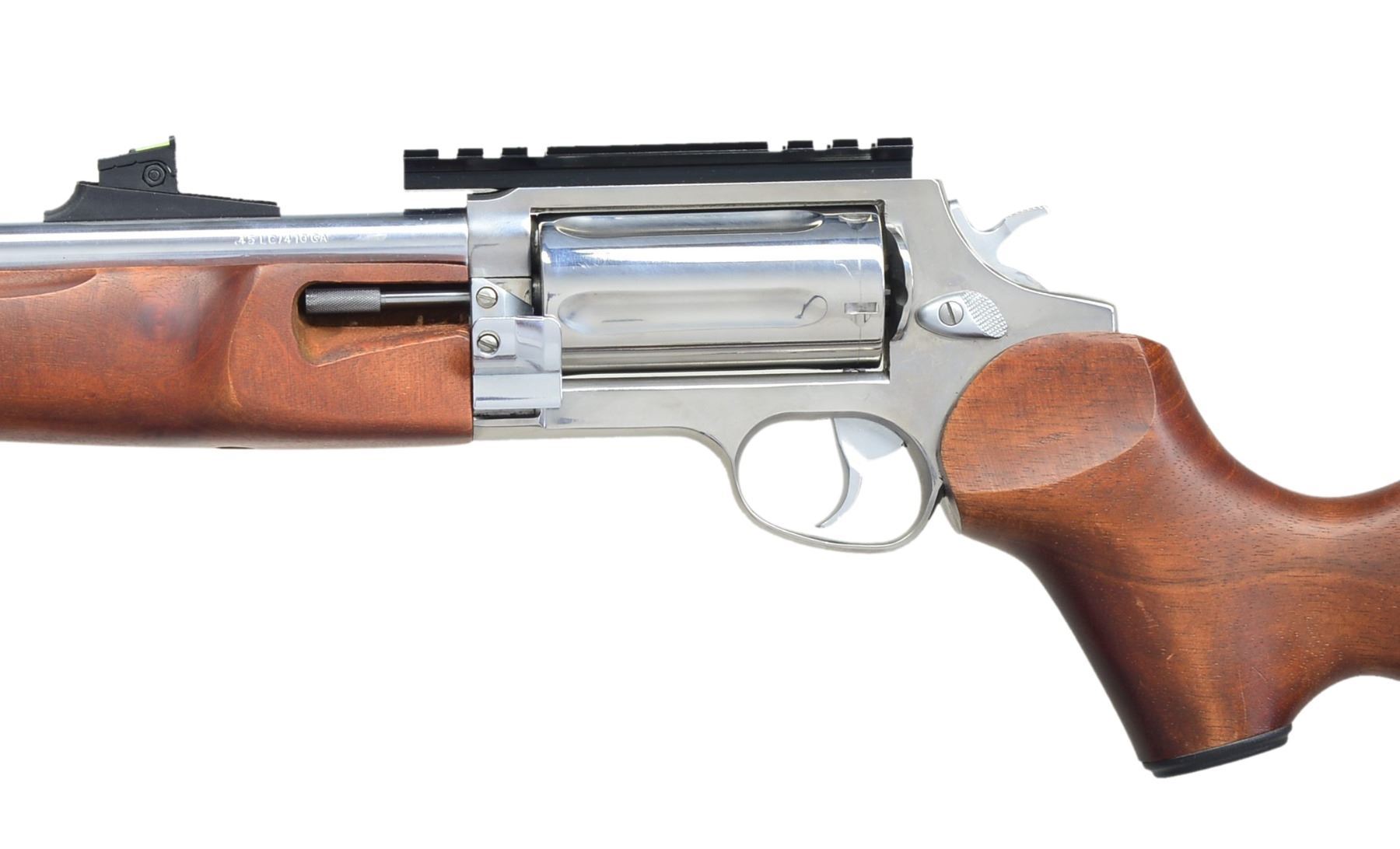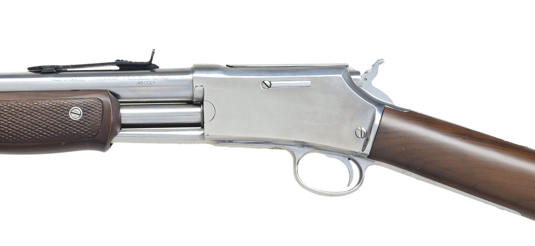 RIFLES. 1) CIRCUIT JUDGE REVOLVING CARBINE. Cal. 45 LC/410. S# EP2650. Bbl. 18 1/2". Based on the Judge DA revolver action, 5 shot scoop fluted cyl. Chrome finished bbl. & action. Hammer is fitted w/ lock. Red fiber optic sight w/ green fiber optic adj. rear sight. Action fitted w/ Weaver type scope base. Forearm & capped pistol grip Monte Carlo hardwood stock have satin finish, sling swivels & black ventilated pad. UNATTACHED ACCESSORIES: original box containing owners manual, store ad display, cleaning accessories & action lock key. CONDITION: near new in box. Near excellent bore. (20-1385/DS). 2) MODEL C45. Cal. 45 Colt. S# ZL3816. Bbl. 26" rnd. w/ sporting sights. Full length tubular mag. Bright finish. Hammer is fitted w/ safety lock. Checkered "milk pail" style forend w/ straight grip hardwood stock & crescent steel buttplate. UNATTACHED ACCESSORIES: original box containing instruction manual, warranty papers & action lock keys. CONDITION: 99% finish showing sm. scratches on action. Stock shows scattered scratches & sm. marks. Near excellent bore. (20-1393/DS). BOTH MODERN. $800-1,100.