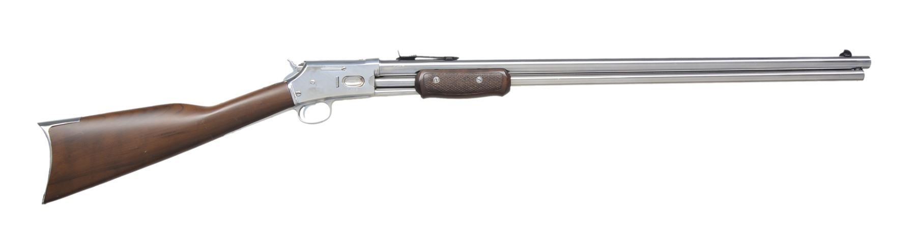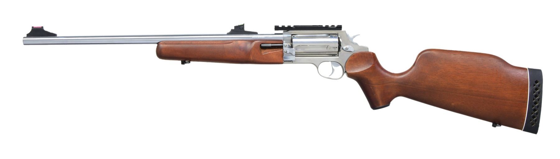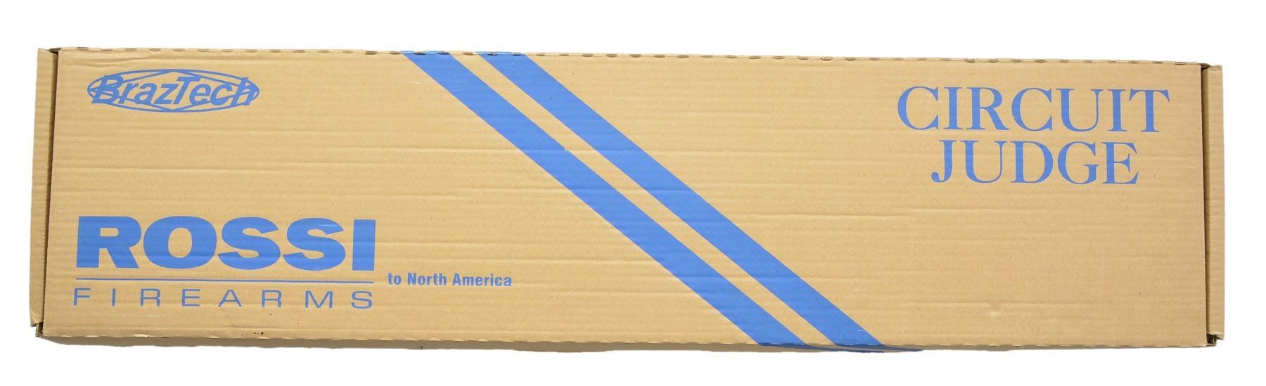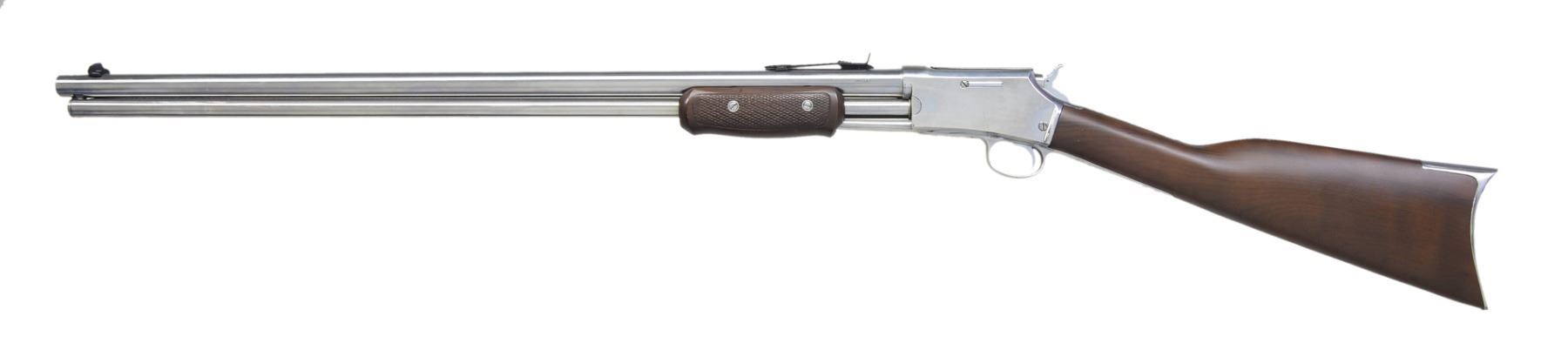 RIFLES. 1) CIRCUIT JUDGE REVOLVING CARBINE. Cal. 45 LC/410. S# EP2650. Bbl. 18 1/2". Based on the Judge DA revolver action, 5 shot scoop fluted cyl. Chrome finished bbl. & action. Hammer is fitted w/ lock. Red fiber optic sight w/ green fiber optic adj. rear sight. Action fitted w/ Weaver type scope base. Forearm & capped pistol grip Monte Carlo hardwood stock have satin finish, sling swivels & black ventilated pad. UNATTACHED ACCESSORIES: original box containing owners manual, store ad display, cleaning accessories & action lock key. CONDITION: near new in box. Near excellent bore. (20-1385/DS). 2) MODEL C45. Cal. 45 Colt. S# ZL3816. Bbl. 26" rnd. w/ sporting sights. Full length tubular mag. Bright finish. Hammer is fitted w/ safety lock. Checkered "milk pail" style forend w/ straight grip hardwood stock & crescent steel buttplate. UNATTACHED ACCESSORIES: original box containing instruction manual, warranty papers & action lock keys. CONDITION: 99% finish showing sm. scratches on action. Stock shows scattered scratches & sm. marks. Near excellent bore. (20-1393/DS). BOTH MODERN. $800-1,100.