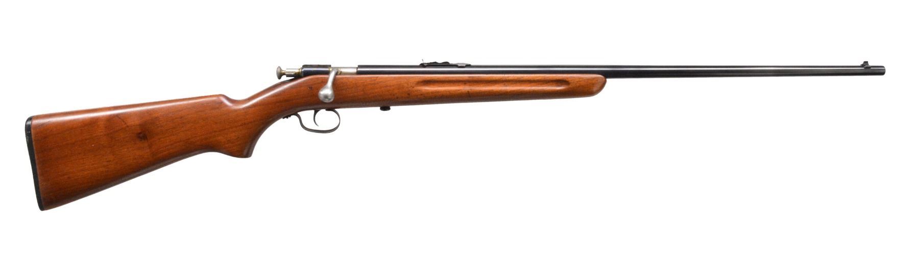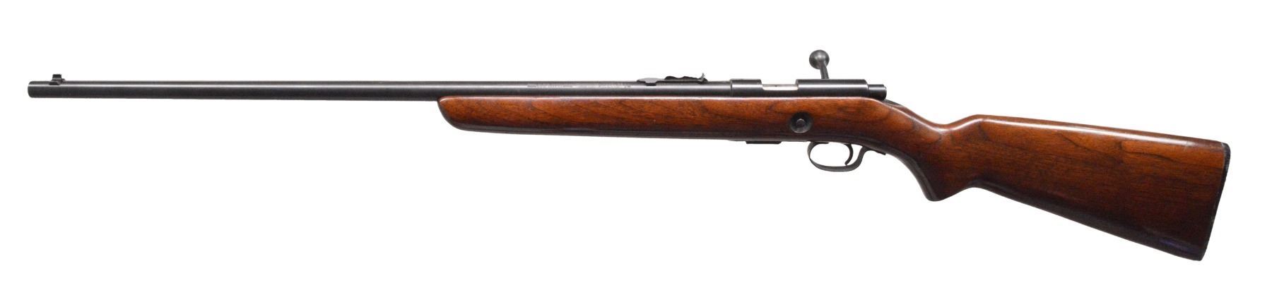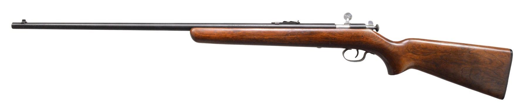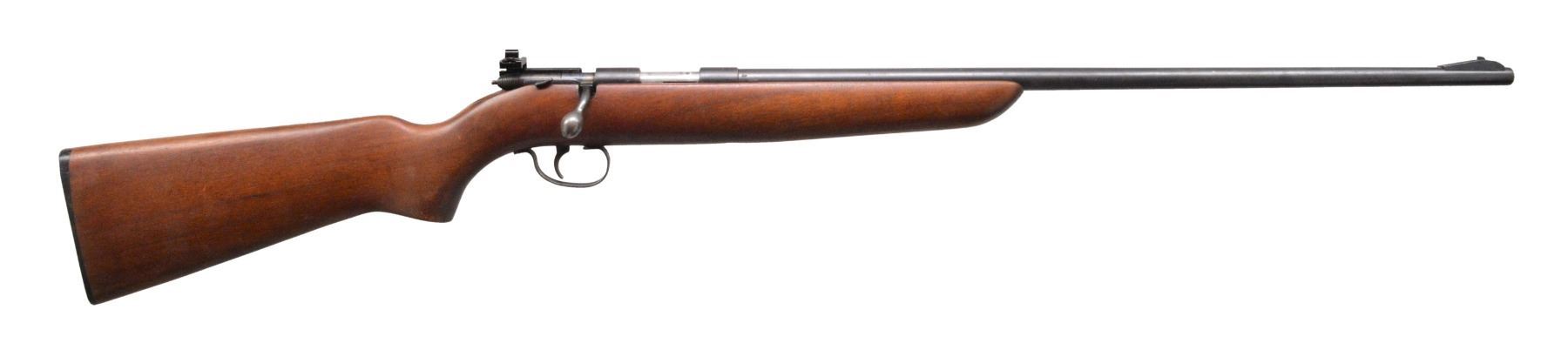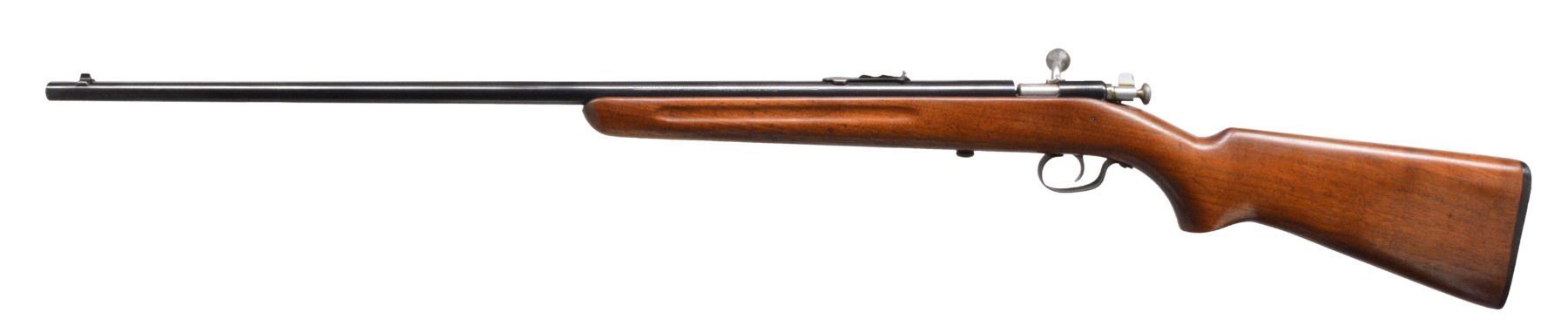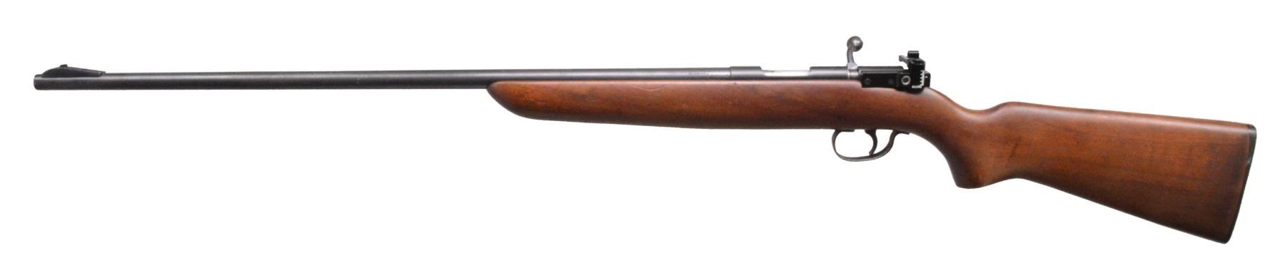 ALL: cal. 22 S, L, LR. ALL: NSN. 1) WINCHESTER MODEL 67 SINGLE SHOT. Bbl. 27" bead front sight w/ elevator adj. rear sight. Chrome plated bolt. Finger groove walnut stock is thinned at wrist w/ cut out for sight. Forearm has added coarse checkering. CONDITION: 80% lightly faded blue. Refinished stock is broken through wrist & repaired. Bright bore retains sound rifling. (20-77/DS). 2) REMINGTON MODEL 510-P TARGETMASTER SINGLE SHOT. Bbl. 25". Ramp mounted blade front sight w/ aftermarket Williams receiver sight. Walnut stock w/ original buttplate. CONDITION: 80% dull fading blue showing spots of freckling. Refinished wood has dull appearance. Bore is bright w/ sound rifling. (20-78/DS). 3) WINCHESTER MODEL 67A SINGLE SHOT. Bbl. 27". Bead front sight & elevator adj. rear sight. Chrome plated bolt. Walnut stock has original buttplate. CONDITION: over 98% lightly faded blue showing sm. scratches & wear spots. Original wood finish shows scratches & marks. Bore is bright w/ sound rifling. (20-79/DS). 4) WINCHESTER MODEL 67 SINGLE SHOT. Bbl. 27". Blade front sight w/ elevator adj. rear sight. Chrome plated bolt. Finger groove style walnut stock has original buttplate. CONDITION: bbl. retains 98% reblued finish. Chrome plating shows areas of loss on bolt handle. Stock has good semi gloss refinish. Bore is bright w/ sharp rifling. (20-80/DS). 5) WINCHESTER MODEL 67. Bbl. 27" w/ bead front sight & elevator adj. rear sight. Finger groove walnut stock w/ original buttplate. CONDITION: metal has 98% reblued finish. Bore is relined & retains very good rifling. Sanded & refinished stock shows numerous scratches & marks. (20-81/DS). 6) WINCHESTER MODEL 69A REPEATER. Bbl. 25". Bead front sight w/ elevator adj. rear sight. Walnut stock w/ original buttplate. MAGS: 1 detachable 5 rd. CONDITION: 90% original blue showing spots of freckling. Stock shows light scratches & marks. Bright bore retains strong rifling. (20-82/DS). ALL CURIO. $750-1,100.