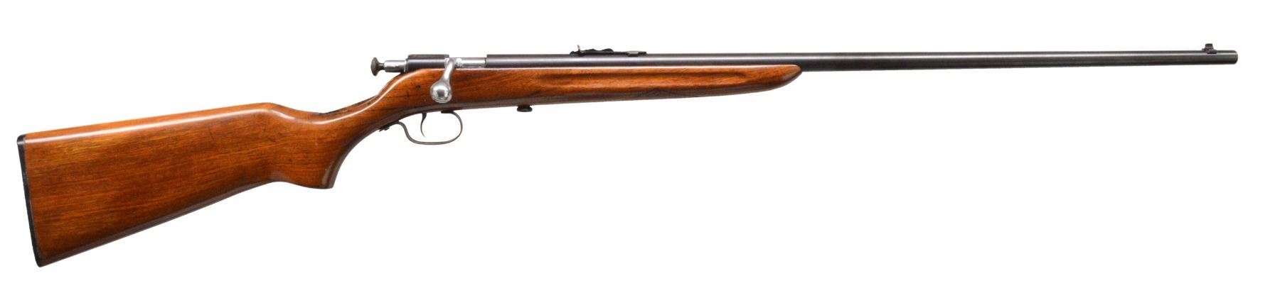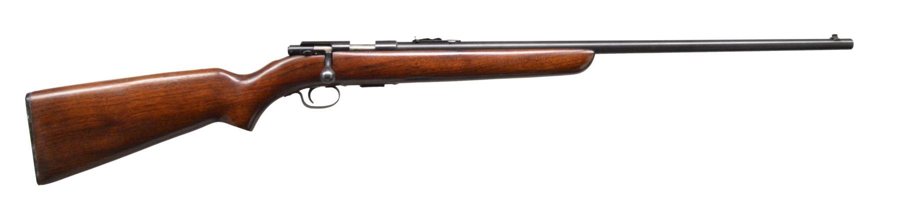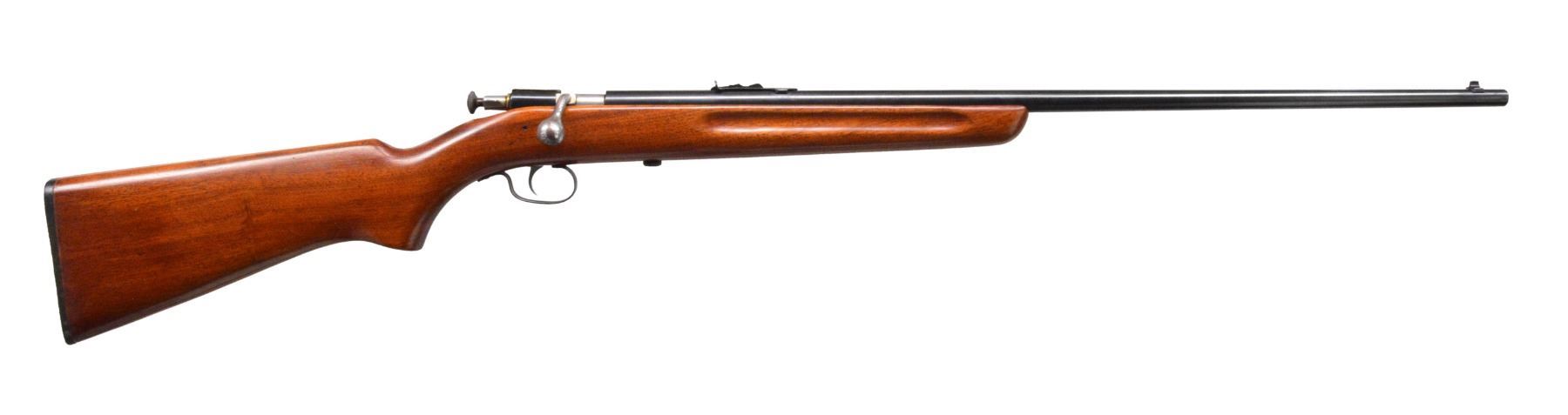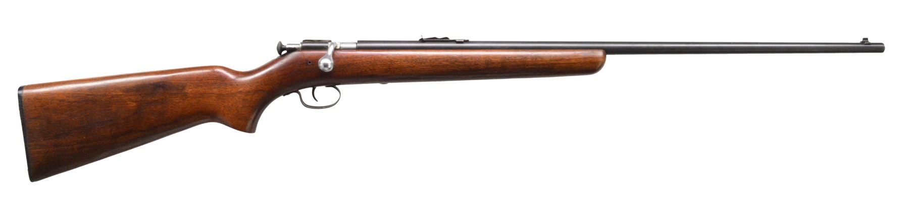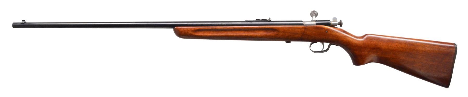 ALL: cal. 22 S, L, LR. ALL: NSN. 1) WINCHESTER MODEL 67 SINGLE SHOT. Bbl. 27" bead front sight w/ elevator adj. rear sight. Chrome plated bolt. Finger groove walnut stock is thinned at wrist w/ cut out for sight. Forearm has added coarse checkering. CONDITION: 80% lightly faded blue. Refinished stock is broken through wrist & repaired. Bright bore retains sound rifling. (20-77/DS). 2) REMINGTON MODEL 510-P TARGETMASTER SINGLE SHOT. Bbl. 25". Ramp mounted blade front sight w/ aftermarket Williams receiver sight. Walnut stock w/ original buttplate. CONDITION: 80% dull fading blue showing spots of freckling. Refinished wood has dull appearance. Bore is bright w/ sound rifling. (20-78/DS). 3) WINCHESTER MODEL 67A SINGLE SHOT. Bbl. 27". Bead front sight & elevator adj. rear sight. Chrome plated bolt. Walnut stock has original buttplate. CONDITION: over 98% lightly faded blue showing sm. scratches & wear spots. Original wood finish shows scratches & marks. Bore is bright w/ sound rifling. (20-79/DS). 4) WINCHESTER MODEL 67 SINGLE SHOT. Bbl. 27". Blade front sight w/ elevator adj. rear sight. Chrome plated bolt. Finger groove style walnut stock has original buttplate. CONDITION: bbl. retains 98% reblued finish. Chrome plating shows areas of loss on bolt handle. Stock has good semi gloss refinish. Bore is bright w/ sharp rifling. (20-80/DS). 5) WINCHESTER MODEL 67. Bbl. 27" w/ bead front sight & elevator adj. rear sight. Finger groove walnut stock w/ original buttplate. CONDITION: metal has 98% reblued finish. Bore is relined & retains very good rifling. Sanded & refinished stock shows numerous scratches & marks. (20-81/DS). 6) WINCHESTER MODEL 69A REPEATER. Bbl. 25". Bead front sight w/ elevator adj. rear sight. Walnut stock w/ original buttplate. MAGS: 1 detachable 5 rd. CONDITION: 90% original blue showing spots of freckling. Stock shows light scratches & marks. Bright bore retains strong rifling. (20-82/DS). ALL CURIO. $750-1,100.