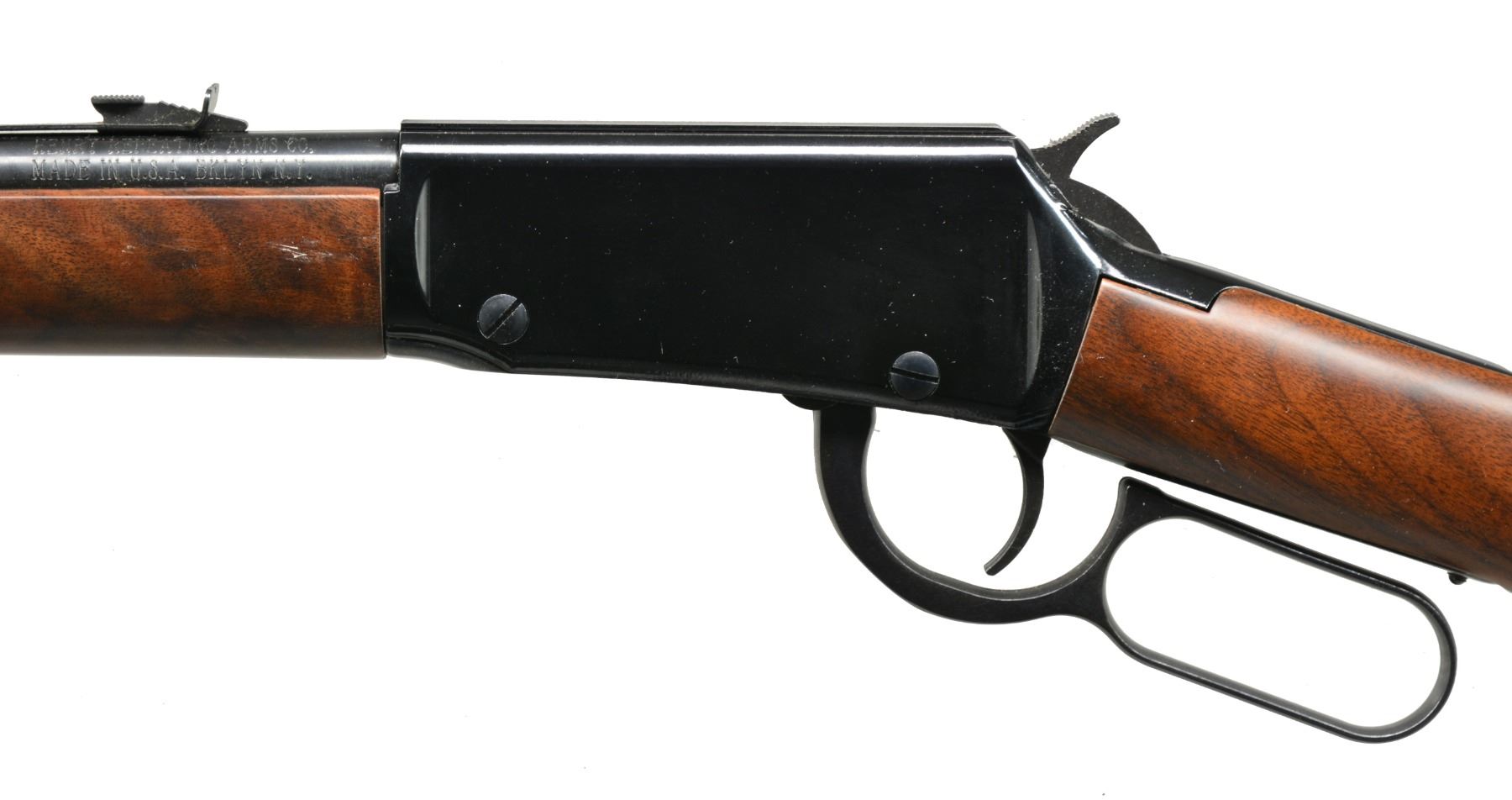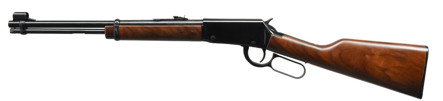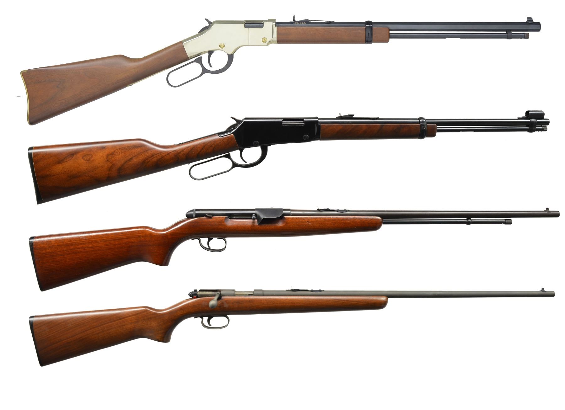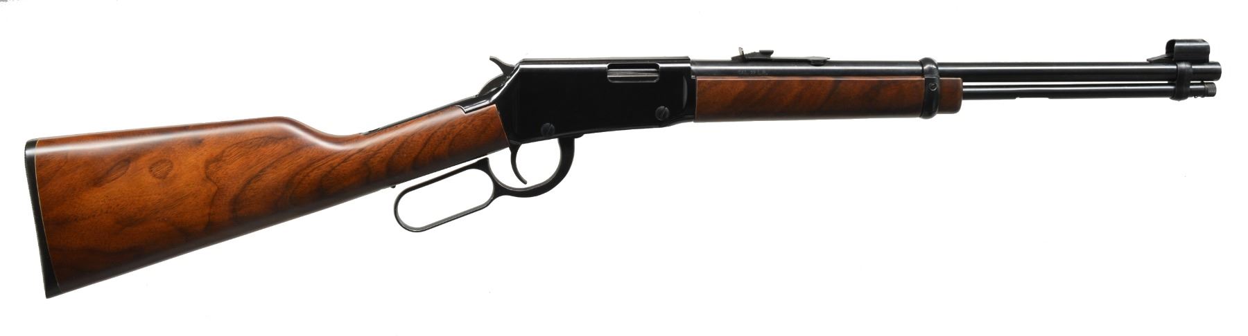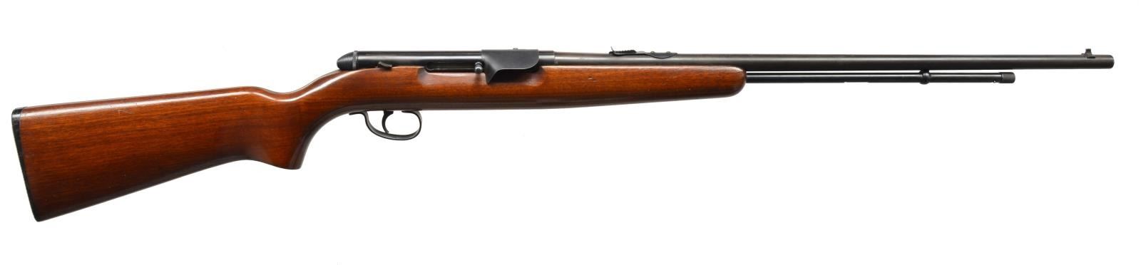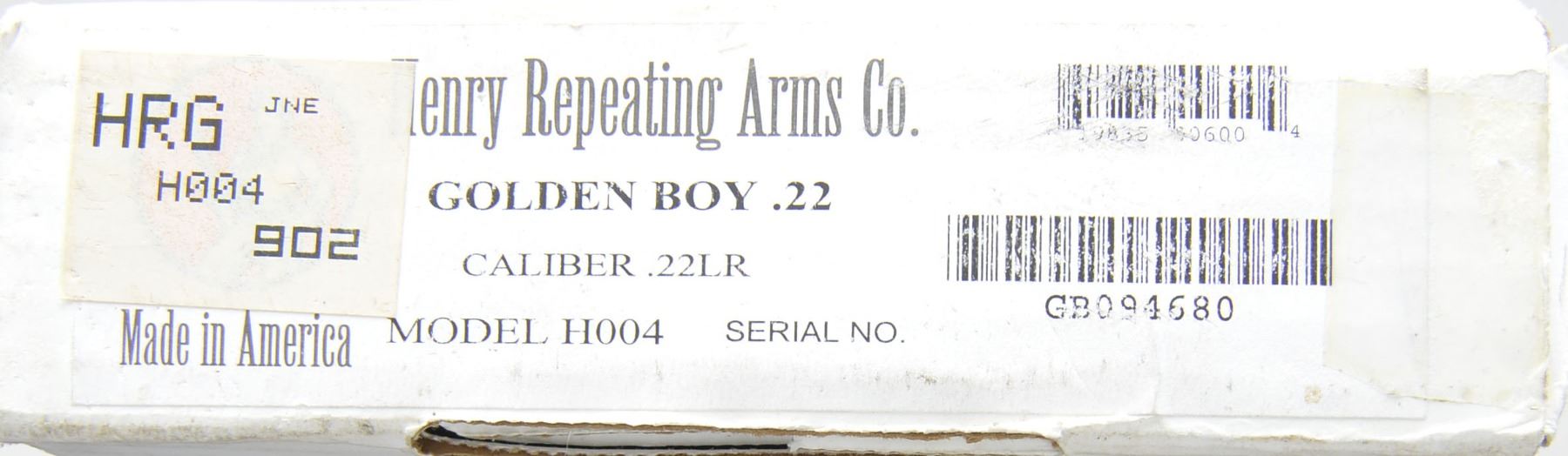 1) HENRY GOLDEN BOY LEVER ACTION. Cal. 22 LR. S# GB094680. Bbl. 20" oct. w/ sporting sights. Tubular mag. Gold finished action & buttplate. Satin finished walnut stocks. UNATTACHED ACCESSORIES: original box containing instruction manual & warranty papers. Box is tattered w/ tears. CONDITION: near excellent showing sm. handling marks. Near excellent bore. (19-5922/DS). MODERN. 2) HENRY H001Y YOUTH LEVER ACTION. Cal 22 LR. S# Y008716H. Bbl. 16 1/8" rnd. w/ hooded ramp blade front sight & sporting rear sight. Tubular mag. Black finished action has rail for scope attachment. Satin finished walnut stock & forend. LOP: 12 7/8" to original buttplate. UNATTACHED ACCESSORIES: original box containing Henry brochure. CONDITION: near new w/ near excellent bore. (19-5932/DS). MODERN. 3) REMINGTON 550-1 SEMI AUTO. Cal. 22 S, L, LR. NSN. Bbl. 24" rnd. w/ bead front sight & elevator adj. rear sight. Tubular mag. Action is grooved for scope attachment & has sheet metal shell deflector. Walnut stock has original plastic buttplate. CONDITION: lightly faded blue turning to brown on bbl. Stock shows scattered handling marks. Bore is bright w/ sound rifling. (19-5936/DS). CURIO. 4) REMINGTON 514 US PROPERTY MARKED BOLT ACTION. Cal. 22 S, L, LR. NSN. Bbl. 24 3/4" w/ sporting sights. Bbl., action & bolt handle have gray parkerized type finish. Left side of bbl. is stamped "US". Bbl. & receiver have "P" inspection marks. Walnut stock w/ plastic buttplate having "P" inspection mark at bottom of grip. CONDITION: 95% metal finish showing scuff & wear spots. Stock shows a few sm. marks. Bore is bright w/ sound rifling. (19-5946/DS). CURIO. $750-1,250.