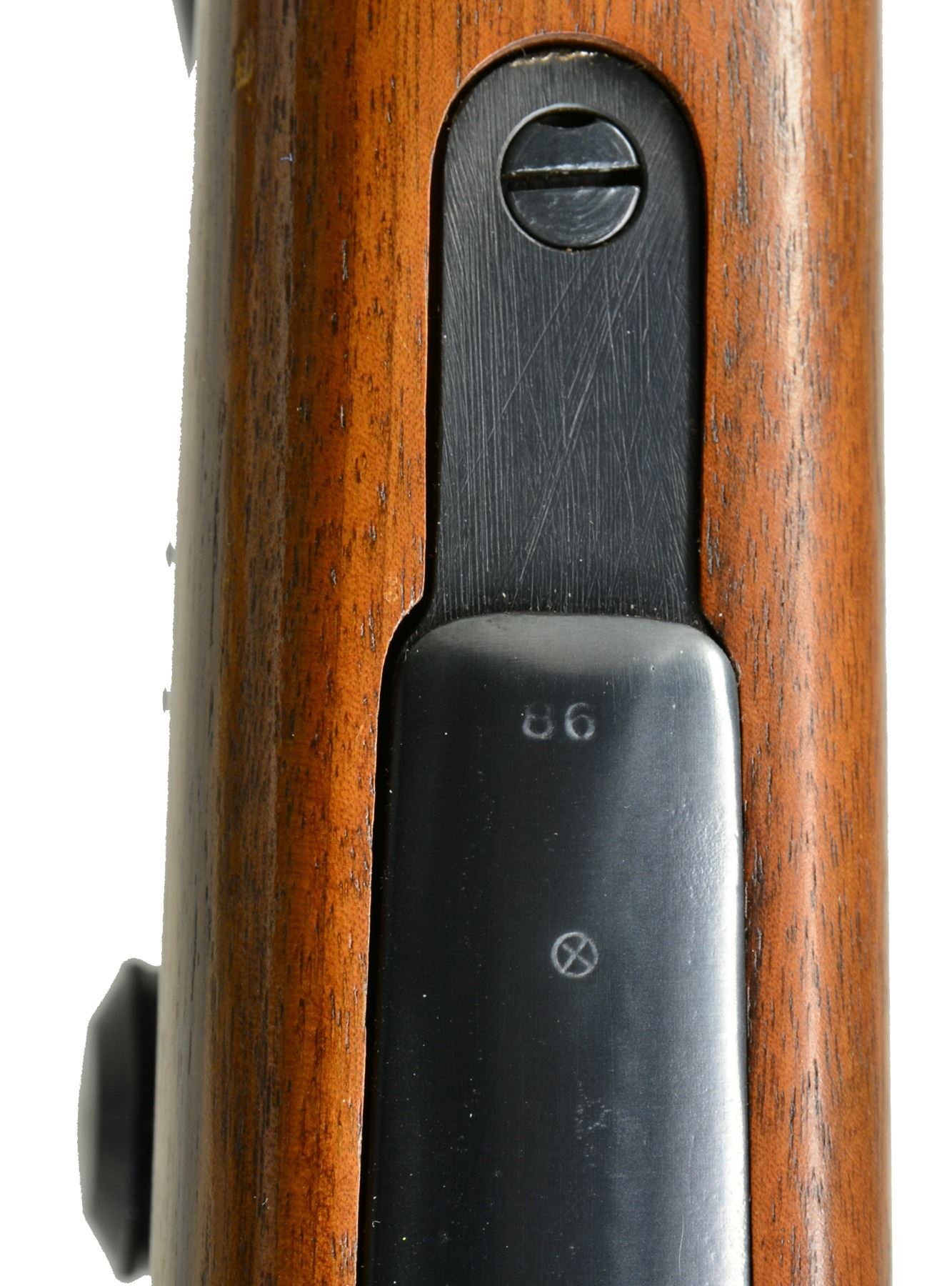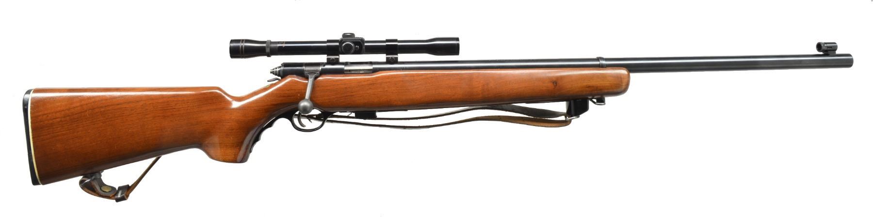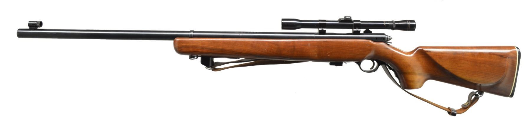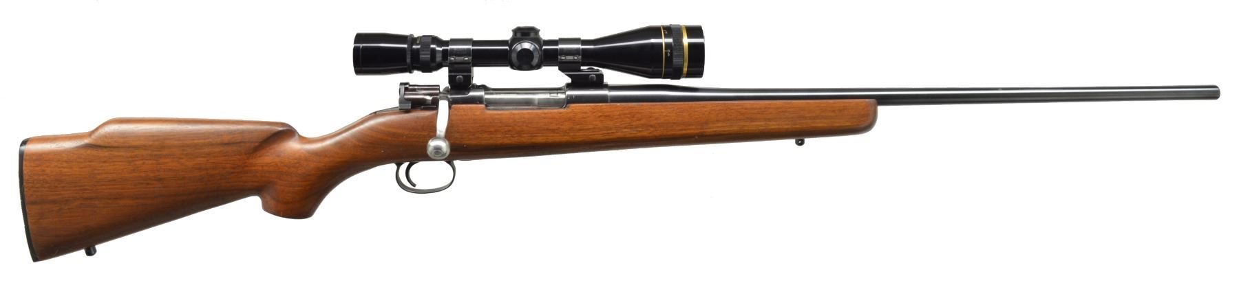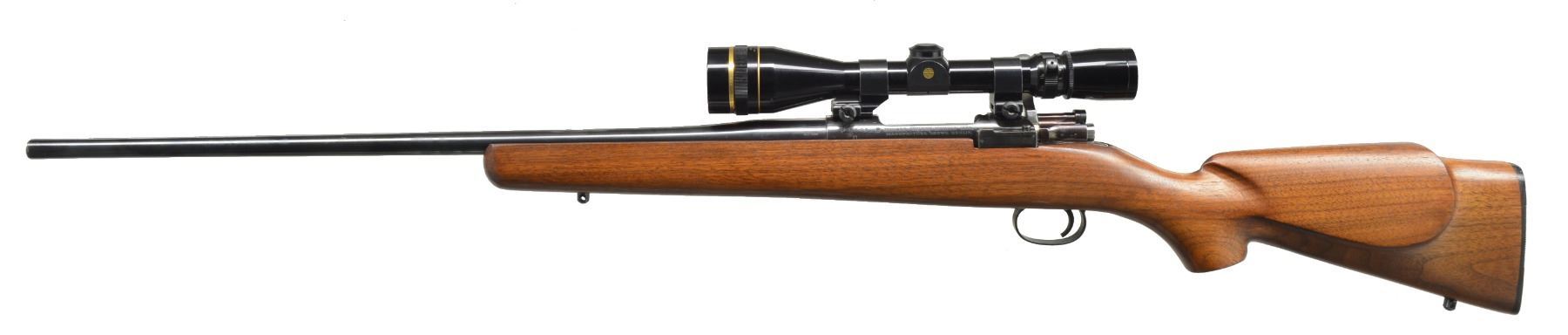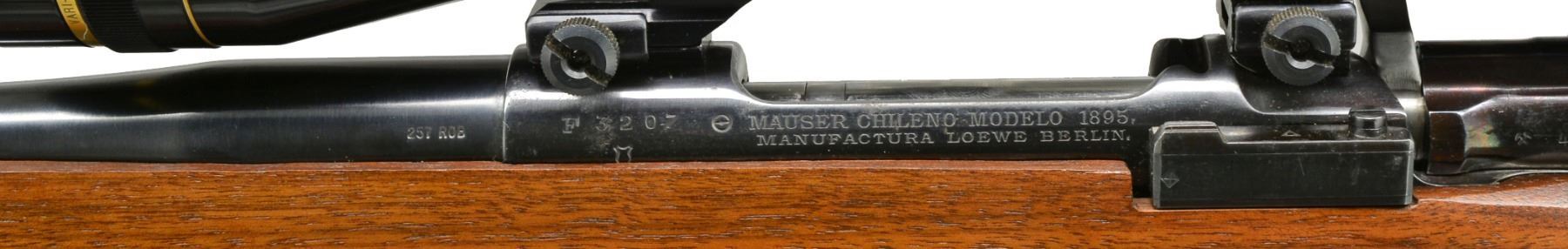 1) LOEWE CHILEANO 1895 CUSTOM. Cal. 257 Roberts. S# F3207. Bbl. 24" light sporter weight w/out sights. Action is fitted w/ Leupold Vari-X III 4.5x14 gloss finished gold ring scope w/ fine duplex reticle on Weaver mts. Bolt is fitted w/ handle for scope clearance. Low swing safety. Commercial single stage trigger. Original bottom metal. Custom Monte Carlo cheekpiece walnut stock w/ swivel bases & plastic buttplate. WEIGHT: 8 lbs., 9.8 oz. CONDITION: 98% reblued finish. Bolt shroud has acquired a plum cast. Stock has good satin finish. Bore is bright w/ near excellent rifling. Scope has bright optics. (01-17344/DS). ANTIQUE. 2) MOSSBERG MODEL 144LSB TARGET. Cal. 22 LR. NSN. Bbl. 27" heavy weight w/ Ac-Kro-Gruv rifling. Globe front sight, rear sight is detached. Ted Williams 4x rimfire scope w/ standard crosshairs on tip off mts. Target weight cheekpiece walnut stock w/ finger groove plastic trigger guard & plastic buttplate w/ white line spacer. Leather sling is attached to forearm accessory rail. MAGS: 1 detachable 7 rd. UNATTACHED ACCESSORIES: Mossberg S331 receiver sight w/ 4 aperture disks. CONDITION: 98% blue. Stock shows scattered sm. marks. Bright bore w/ strong rifling. Scope has clear optics. (20-143/DS). CURIO. $650-900.