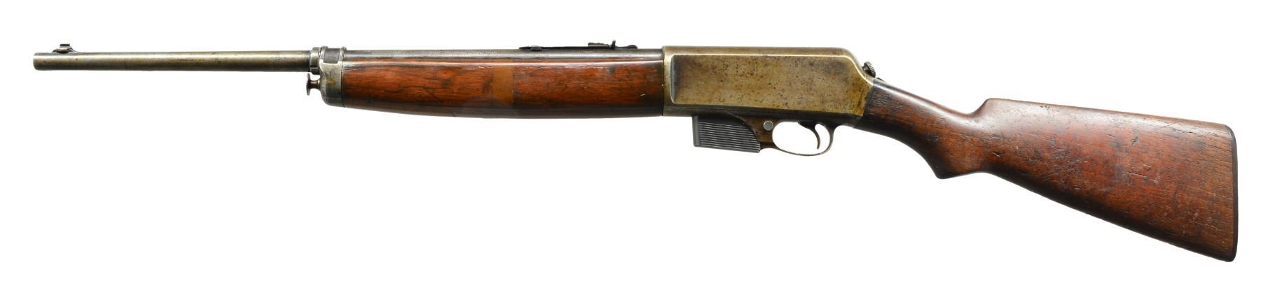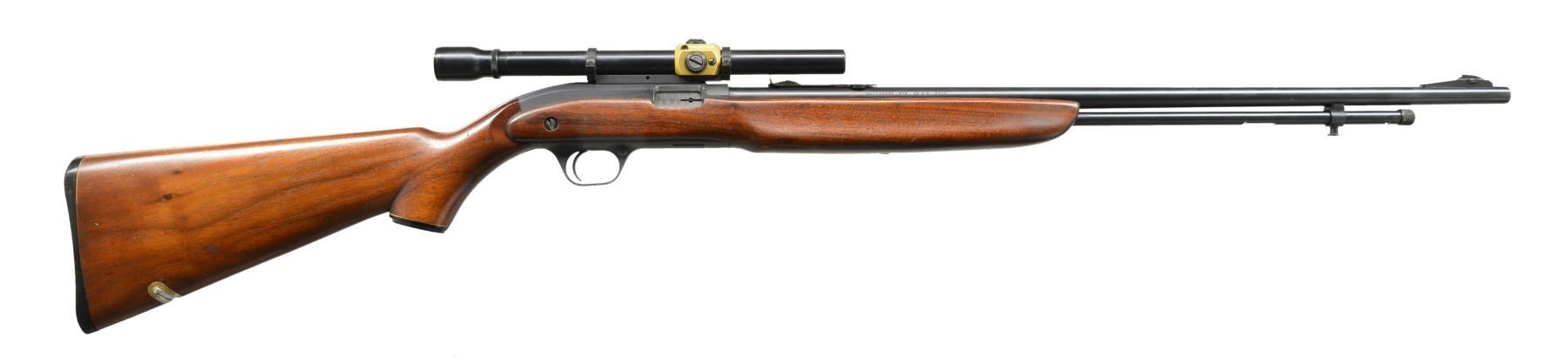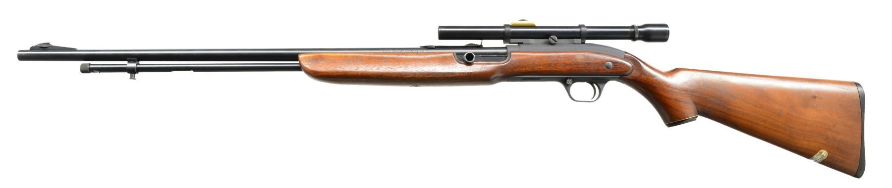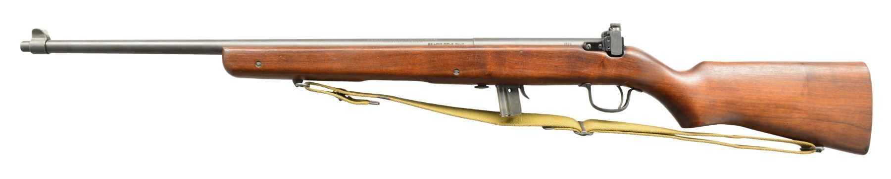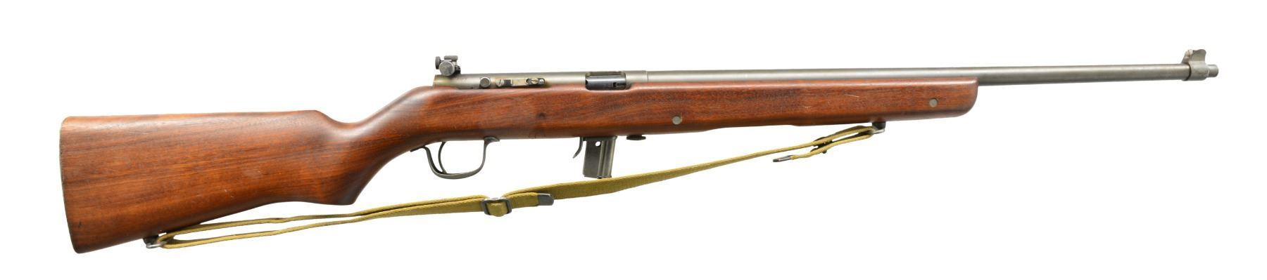 1) H&R MODEL 65. Cal. 22 LR. S# 9919. Bbl. 23" heavy w/ protected blade front sight of U.S. military style; Redfield 70 Series rear sight & no provision for bbl. rear sight. Mfg. 1944-1945 as civilian version of Model 58C that would have U.S. markings. Often referred to as General Model & like 58C training rifle has buttstock dimensions identical to M1 Garand. Smooth gray parkerized finish. Rudimentary spring loaded push button hold open latch. Cocking accomplished by finger activation of operating rod in bottom of forend by same manner as H&R Reising machine gun. Robust stamped metal trigger guard & grooved metal buttplate. Military style swivels having M1 carbine canvas web sling. MAGS: 1 good factory 10 rd. CONDITION: very good overall appearance w/ very minimal wear to metal finishes having peppery stained appearance to section of bbl. forward of forend. Stock has minor light marks appearing mostly on right side of butt. Near excellent bore. (20-389/NW). 2) J.C. HIGGINS MODEL 30. Cal. 22 LR. NSN. Bbl. 24" having ramp front sight & elevator adj. sporting rear. Mfg. by High Standard for Sears who marketed it under Higgins name. Same as HS Sport King Model w/ distinct Sears features to include: semi beavertail forend w/ panels extending over sides of receiver, jeweled bolt, buttstock w/ white line grip cap & special feature of retractable red sling originating at rear of buttstock & quick attaching to front bbl. band. Tube feed mag. w/ aluminum inner tube. Grooved alloy receiver fitted w/ J.C. Higgins Rifleman 4X scope & w/ crosshair reticle. CONDITION: very good to excellent w/ only minimal light marks on stock set. Near excellent bore. (20-392/NW). 3) WINCHESTER MODEL 1910 S.L. Cal. .401 Win. S# 2831. Bbl. 20" having dovetail bead in integral base plus thumb print elevator adj. rear w/ top filed flat. Mfg. 1910 (1910 to 1937); 20786 units. MAGS: 1 very good factory 4 rd. CONDITION: metal finishes mixture of patina & cleaned oxidation. Forend has 2 1/2" crack on right side at front plus 5/8" band of epoxy around midpoint for stability. Couple of hairline cracks at rear near receiver. Refinished forend. Dark buttstock w/ numerous handling marks, chips & dents plus screw repaired elliptical chip on right front. Fair bore w/ wear & cleaned pitting. (20-404/NW). ALL CURIO. $650-900.
