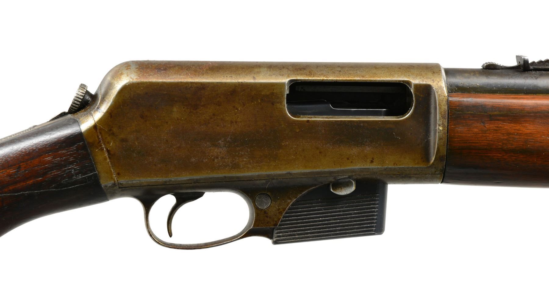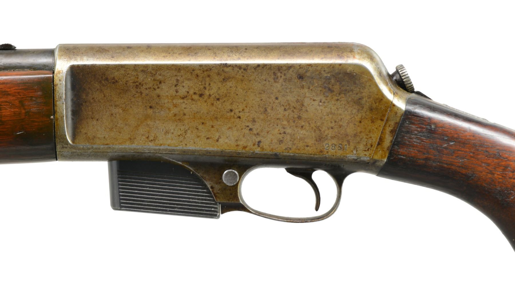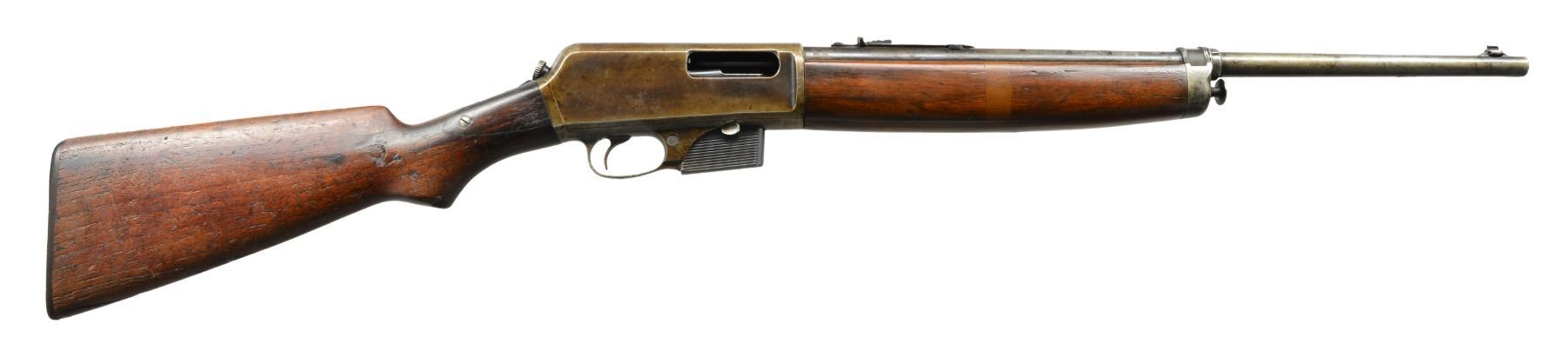 1) H&R MODEL 65. Cal. 22 LR. S# 9919. Bbl. 23" heavy w/ protected blade front sight of U.S. military style; Redfield 70 Series rear sight & no provision for bbl. rear sight. Mfg. 1944-1945 as civilian version of Model 58C that would have U.S. markings. Often referred to as General Model & like 58C training rifle has buttstock dimensions identical to M1 Garand. Smooth gray parkerized finish. Rudimentary spring loaded push button hold open latch. Cocking accomplished by finger activation of operating rod in bottom of forend by same manner as H&R Reising machine gun. Robust stamped metal trigger guard & grooved metal buttplate. Military style swivels having M1 carbine canvas web sling. MAGS: 1 good factory 10 rd. CONDITION: very good overall appearance w/ very minimal wear to metal finishes having peppery stained appearance to section of bbl. forward of forend. Stock has minor light marks appearing mostly on right side of butt. Near excellent bore. (20-389/NW). 2) J.C. HIGGINS MODEL 30. Cal. 22 LR. NSN. Bbl. 24" having ramp front sight & elevator adj. sporting rear. Mfg. by High Standard for Sears who marketed it under Higgins name. Same as HS Sport King Model w/ distinct Sears features to include: semi beavertail forend w/ panels extending over sides of receiver, jeweled bolt, buttstock w/ white line grip cap & special feature of retractable red sling originating at rear of buttstock & quick attaching to front bbl. band. Tube feed mag. w/ aluminum inner tube. Grooved alloy receiver fitted w/ J.C. Higgins Rifleman 4X scope & w/ crosshair reticle. CONDITION: very good to excellent w/ only minimal light marks on stock set. Near excellent bore. (20-392/NW). 3) WINCHESTER MODEL 1910 S.L. Cal. .401 Win. S# 2831. Bbl. 20" having dovetail bead in integral base plus thumb print elevator adj. rear w/ top filed flat. Mfg. 1910 (1910 to 1937); 20786 units. MAGS: 1 very good factory 4 rd. CONDITION: metal finishes mixture of patina & cleaned oxidation. Forend has 2 1/2" crack on right side at front plus 5/8" band of epoxy around midpoint for stability. Couple of hairline cracks at rear near receiver. Refinished forend. Dark buttstock w/ numerous handling marks, chips & dents plus screw repaired elliptical chip on right front. Fair bore w/ wear & cleaned pitting. (20-404/NW). ALL CURIO. $650-900.
