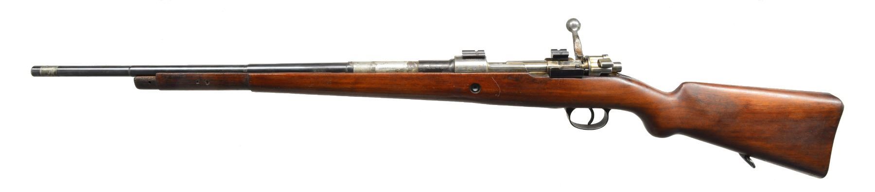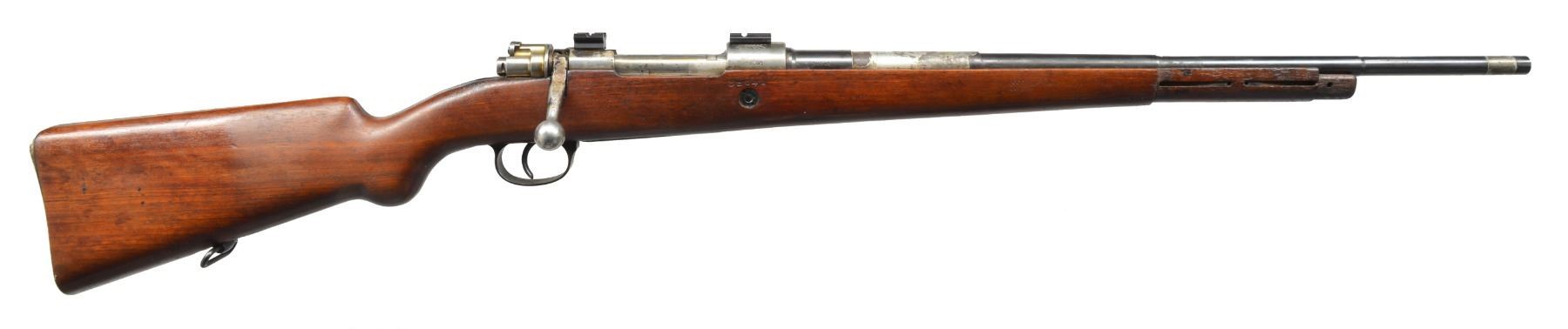 Cal. 7mm Mauser. S# 39041. Bbl. 23 1/4". All visible numbers match. Receiver has FN markings on left rail. Receiver ring has Venezuelan crest. Receiver & bbl. have Belgian proofs. Sights are not present. Partially reshaped walnut stock. CONDITION: has been modified to sporter w/ hobbyist gunsmith workmanship. Receiver fitted w/ Weaver bases on top. Bolt handle has been altered to clear scope by removal & rewelding. Sights removed leaving areas of solder coated on bbl. Buttstock modified in grip area. Stock has light wear & handling marks as refinished. Metal has combination of blue w/ bright receiver & bolt w/ wear & scattered spots of oxidation. Very good shiny bore. (20-285/RW). MODERN. $150-250.
