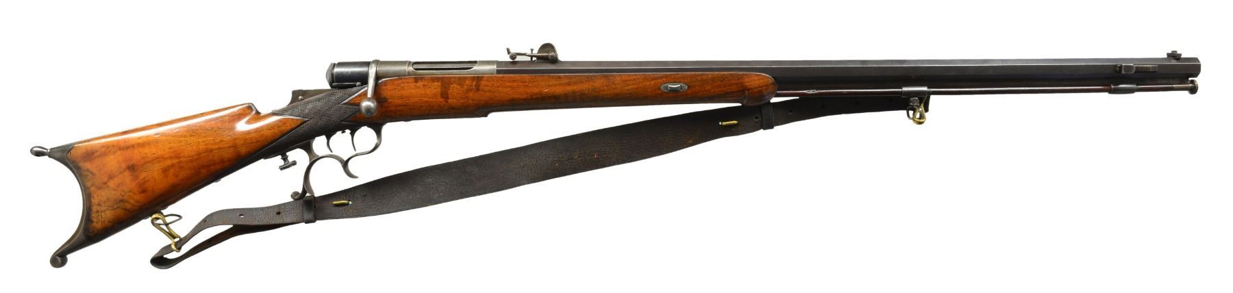 Cal. 41 CF. NSN. Bbl. 30 5/8" heavy oct. Bbl. fitted w/ tangent windage adj. rear sight graduated to 1,000 meters. Blade dovetail front sight. Right bbl. flat fitted w/ bayonet lug, likely to qualify for military shooting matches. Solid underrib w/ 2 cleaning rod ferrules, the lower of which has sling swivel. Has wooden wiping rod w/ rounded horn tip. Demountable schuetzen style trigger guard. Double set triggers & schuetzen style prong buttplate. Walnut half stock w/ checkered grip. Cheekpiece on left side. Schnabel tip forend has 1 fastening wedge. Plugged hole ahead of trigger guard, likely for palm rest. Vintage leather sling w/ hooks. CONDITION: stock has moderate overall wear w/ scratches & handling marks. Notable fine crack in right side of forend through wedge escutcheon. Receiver turning gray w/ peppery oxidation. Bolt sleeve has 50% original blue. Bbl. has 60% thinning original blue w/ high point wear. Good bore w/ strong lands but streaks of oxidation & fouling. (01-17651/RW). ANTIQUE. $500-700.