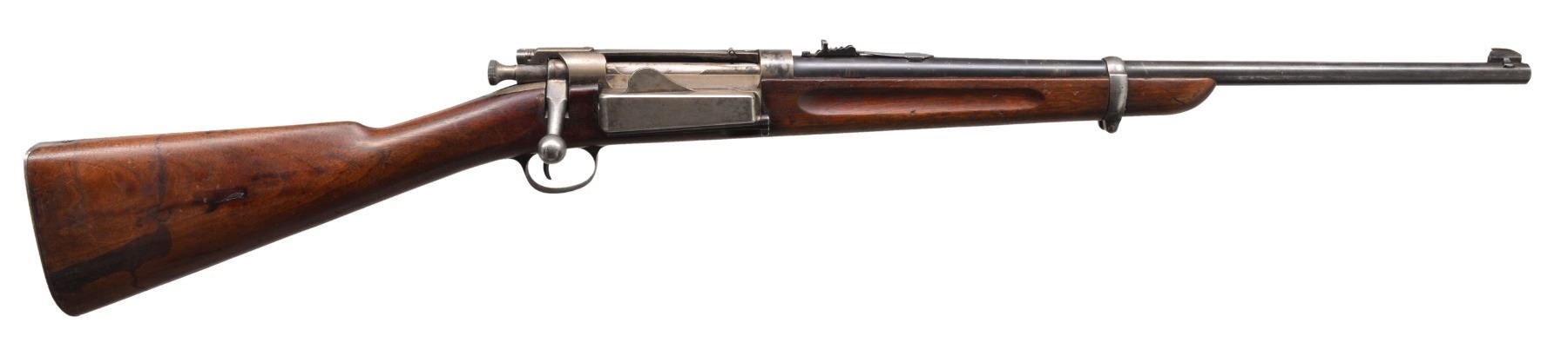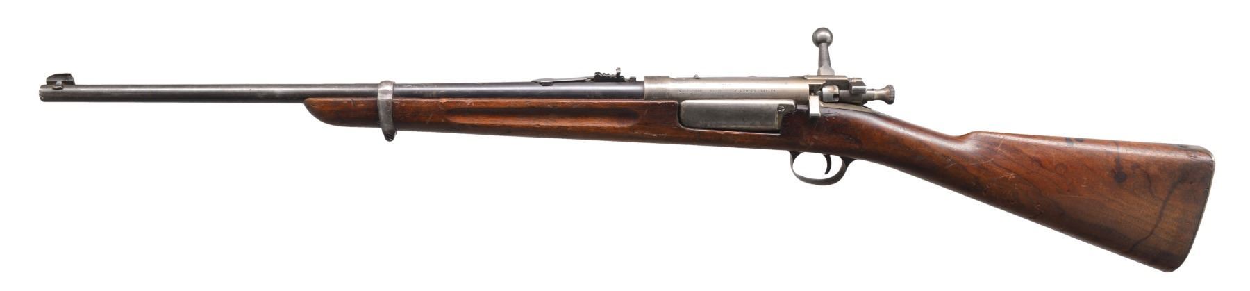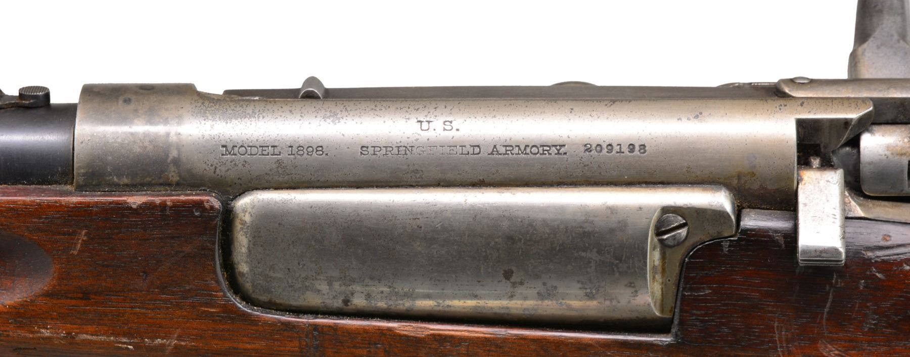 RIFLE. Cal. 30-40 Krag. S# 209198. Bbl. 22". Model 1898 Krag modified to Sporter configuration. Bbl. has original sights replaced by King sporting rear sight & unmarked bead front sight. Bbl. band has been retained. Stock has been given light refinish. Smooth trap buttplate. Band swivel is not present. Butt swivel mortise has walnut filler. CONDITION: stock has moderate wear, dents, staining & scratches w/ filled knot on right side of butt. Receiver turning gray showing traces of color. Metal has worn blue w/ wear & scratches. Very good shiny bore. (19-5822/RW). MODERN. $300-500.
