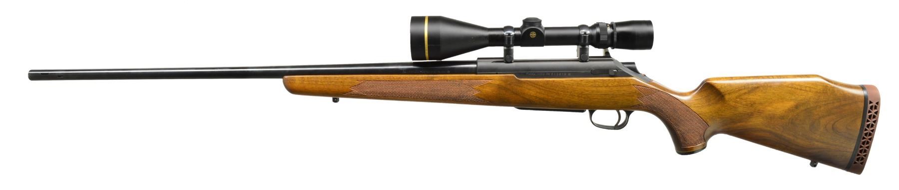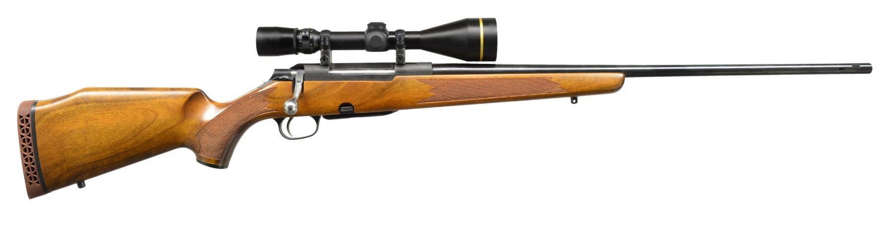Cal. 338 Win. Mag. S# 600819. Bbl. 25" medium sporter weight w/ slotted porting having no iron sights. Leupold Vari-X III 3.5x10-50mm matte finished scope w/ duplex reticle on integral bases. Matte finished action w/ 2 lug bolt having cocking indicator & right side safety. Monte Carlo sporter stock of checkered European walnut w/ black grip cap, swivel bases & Pachmayr Competitor ventilated pad. Imported by Stoeger, Inc. MAGS: 3 detachable 3 rd. UNATTACHED ACCESSORIES: scope caps, Tikka high scope mts. & Bueller scope bases for Weatherby Mark V. CONDITION: rifle retains over 98% wood & metal finish. Bright near excellent bore. (20-1162/DS). MODERN. $600-900.