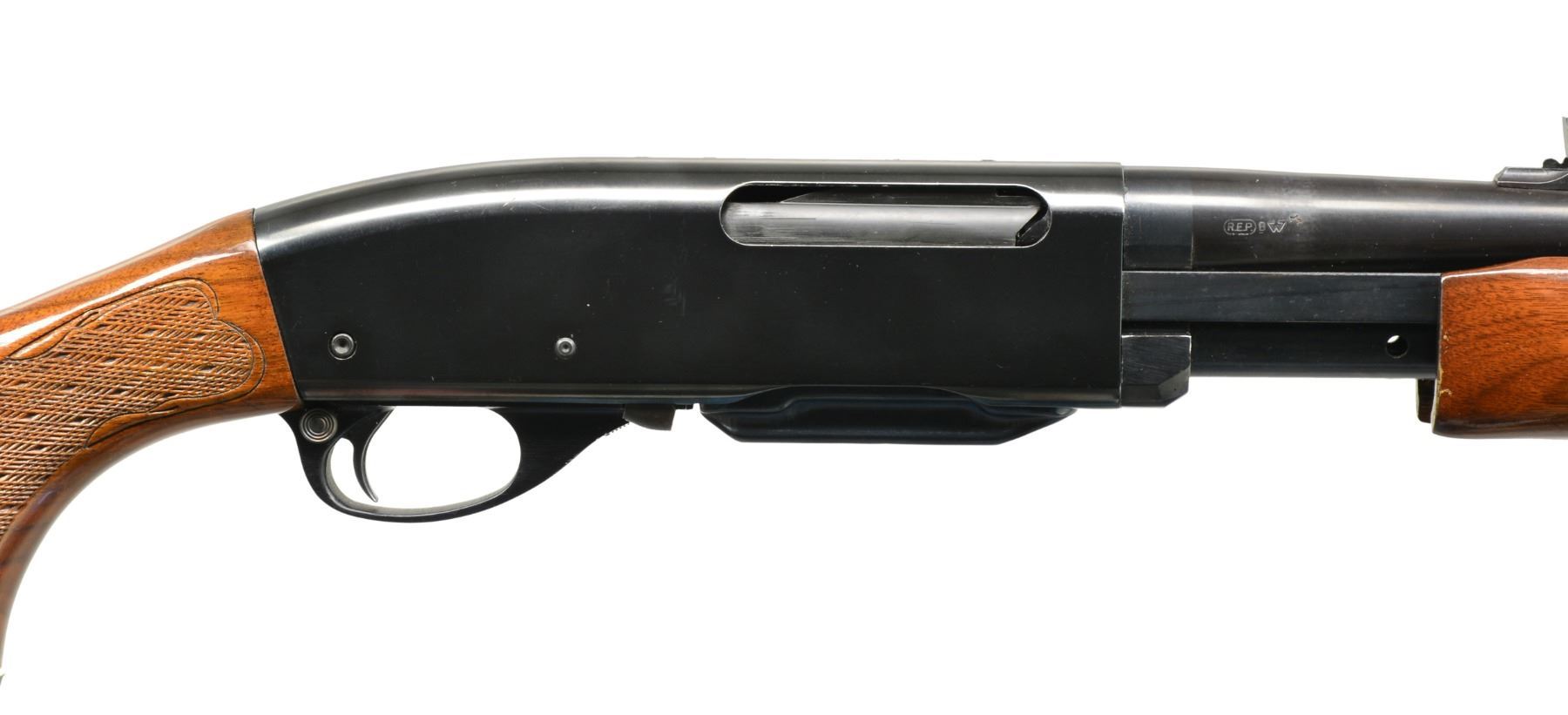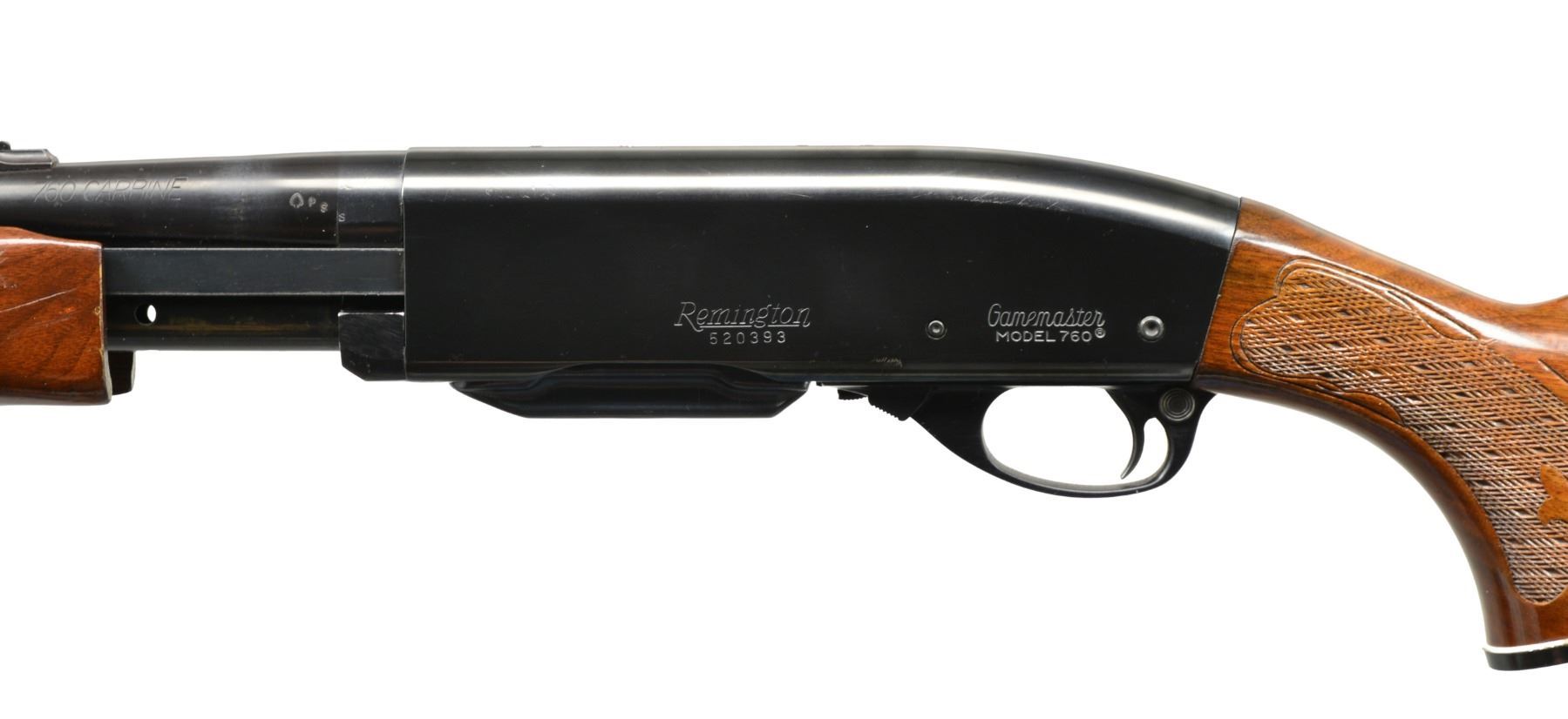 Cal. 308 Win. S# 520393. Bbl. 18 1/2". Receiver marked "REMINGTON GAMEMASTER MODEL 760". Bbl. markings include"308 WIN 760 CARBINE". Receiver drilled for scope mt. Sporting open rear sight & ramp front sight w/ gold colored bead. Walnut stock & slide handle w/ impressed checkering. Black plastic buttplate, grip cap & forend tip. Forend has extended QD swivel stud. Buttstock has QD swivel stud. MAGS: 1 detachable 4 rd. mag. CONDITION: stock set has light wear, scattered handling marks. Metal has light high point wear w/ light handling marks. Very good shiny bore. (20-744/RW). MODERN. $300-450.