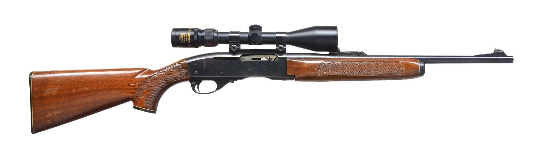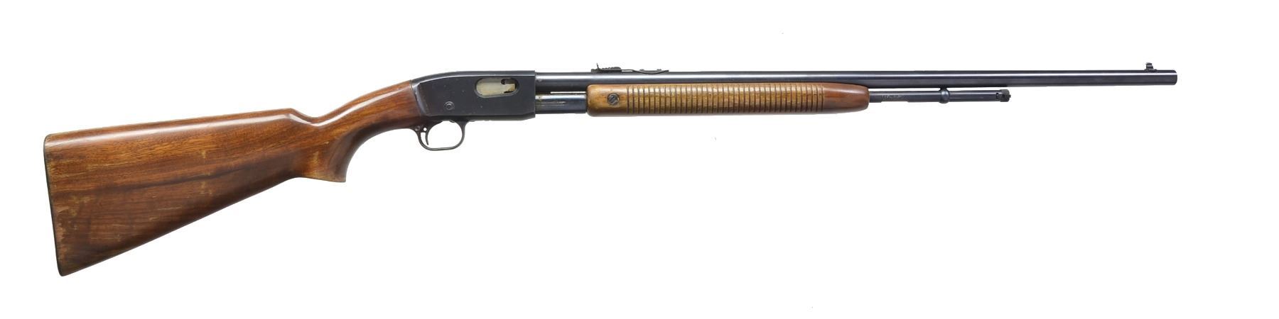 1) MODEL 597 AUTOLOADER. Cal. 22 LR. S# A2647668. Bbl. 20" rnd. w/ ramp mounted bead front sight & adj. rear sight, base only missing sight blade. Alloy receiver w/ lockable safety is grooved & drilled for scope attachment. Matte finished bbl. & action. Dark gray injection molded stock. MAGS: 1 detachable 10 rd. UNATTACHED ACCESSORIES: envelope containing instructions & J wrenches for lockable safety. CONDITION: 98% metal finish. Stock shows light scuffs. Bore is bright w/ strong rifling. (19-5814/DS). MODERN. 2) MODEL 742 WOODSMASTER SEMI AUTO CARBINE. Cal. 30-06. S# 358991. Bbl. 19" w/ ramp mounted blade front sight & adj. rear sight missing elevator. Jason 3-9x46 Model 814 matte finished scope w/ duplex reticle on Weaver mts. Forearm & capped pistol grip stock have basket weave pressed checkering, original buttplate & white line spacer. Bbl. codes indicated May, 1968 mfg. MAGS: none. CONDITION: 70% dull lightly faded blue showing spots of pitting. Wood has worn & peeling finish w/ numerous dents & handling marks. Stock has cracks & dents. Bore retains sound rifling showing sm. spots of pitting. Scope has clear optics. (19-5816/DS). CURIO. 3) MODEL 121 FIELDMASTER PUMP. Cal. 22 S, L, LR. S# 73140. Bbl. 24 1/2" rnd. Dovetail mounted bead front sight w/ elevator adj. U notch rear sight. Tubular mag. Blue finish. Flat bottom grooved forearm & pistol grip stock of nicely grained walnut w/ aluminum buttplate. Bbl. codes indicates May 1946 mfg. CONDITION: over 95% original blue showing light wear on tube w/ sm. spots on bbl. Original wood finish shows areas of peeling w/ scattered sm. dents & handling marks. Bore is bright w/ strong rifling. (19-5817/DS). CURIO. $600-900.