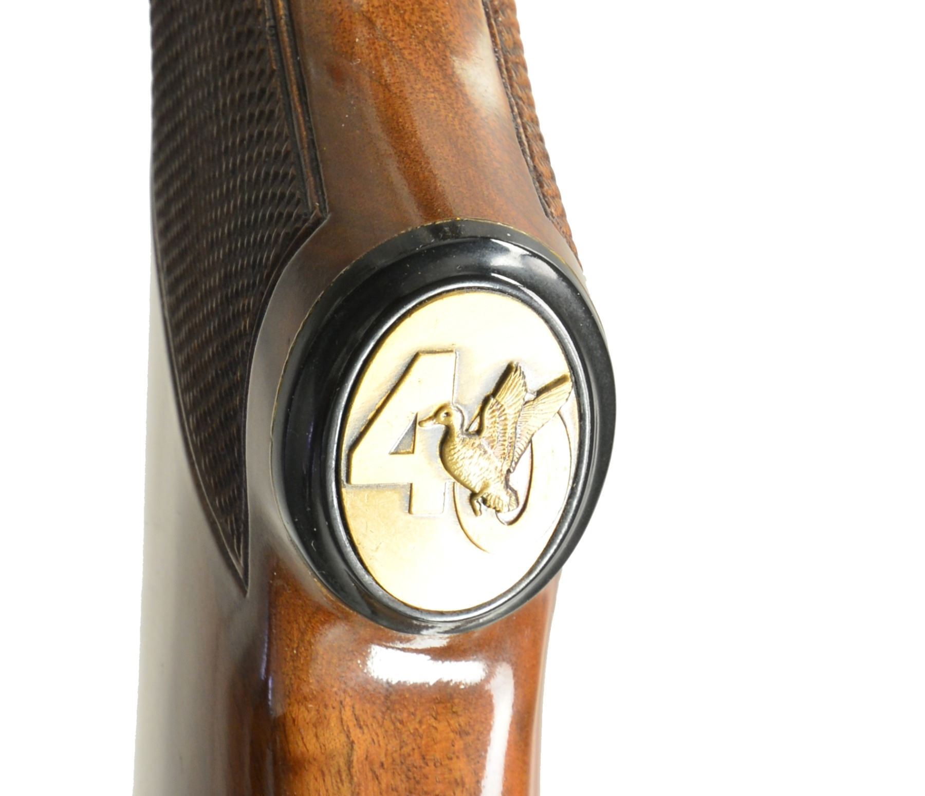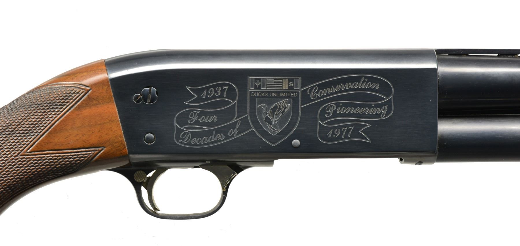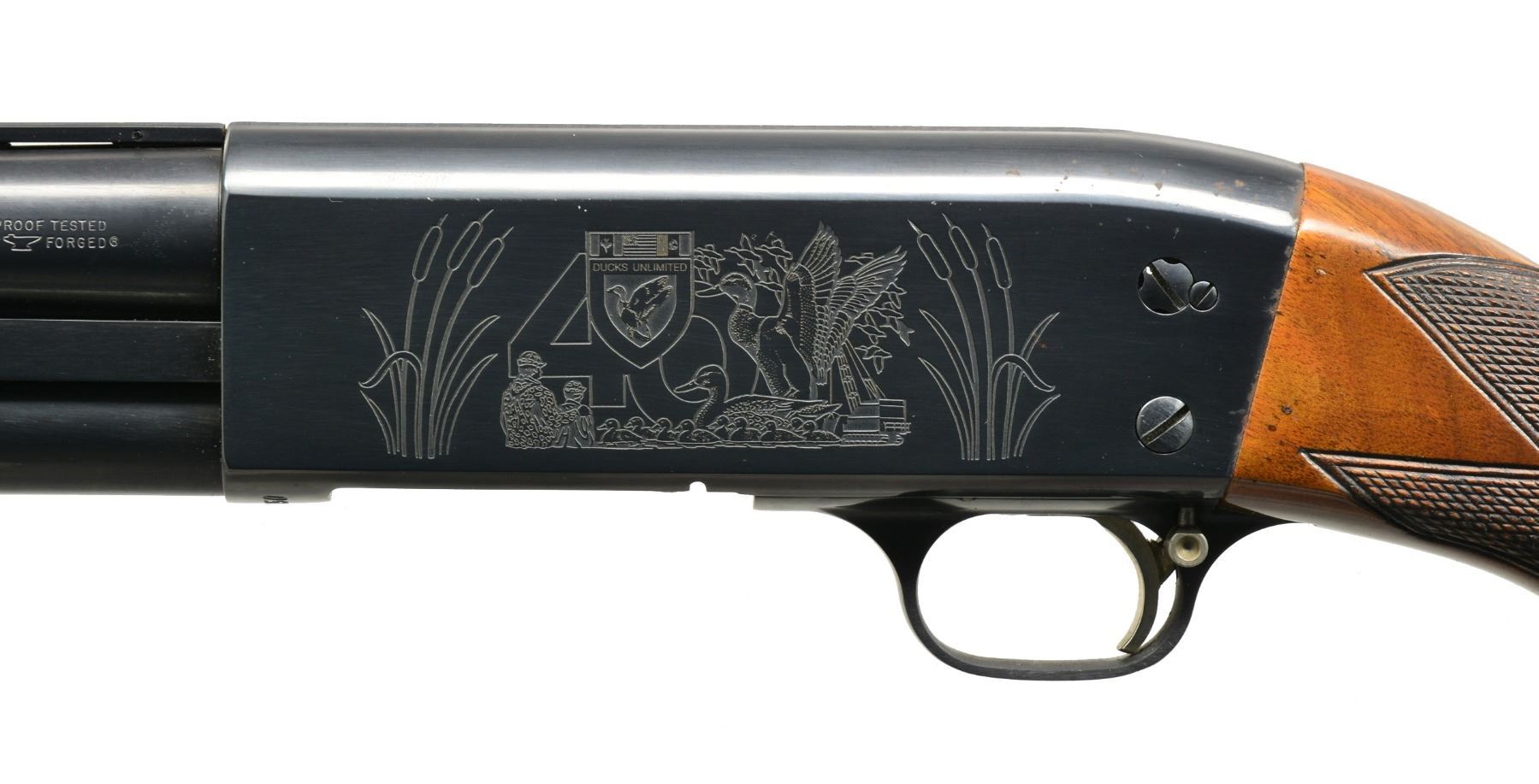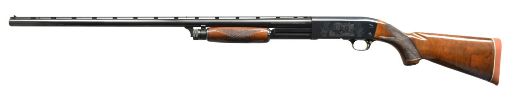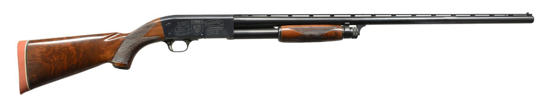 PUMP SHOTGUN. Cal. 12 Ga., 2 3/4". S# 40DU0350. Bbl. 30" VR w/ fixed Full choke. White target style front sight w/ steel mid bead. Brightly polished blued metal finish. Action has special Ducks Unlimited ornamentation, right side has inscription "1937 Four Decades of Conservation Pioneering 1977". Sm. rnd. forearm & capped pistol grip stock of fancy gloss finished American walnut w/ cut checkering. Grip cap has gold 40th Anniversary medallion. LOP: 14" over solid red Pachmayr Presentation pad. UNATTACHED ACCESSORIES: black Naugahyde covered hard case w/ red cloth interior. Case contains 40th Anniversary belt buckle, stickers, & instruction manual. CONDITION: as new, appears unfired. (20-105/DS). MODERN. $700-1,000.