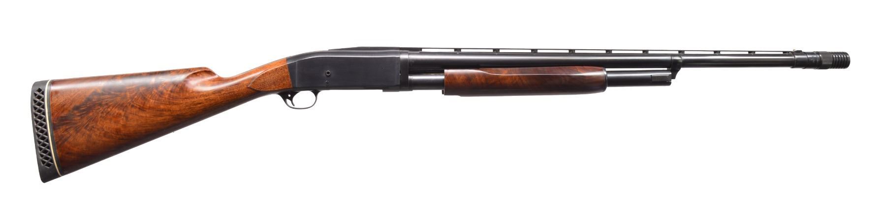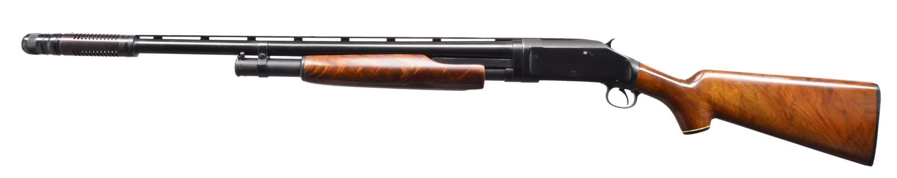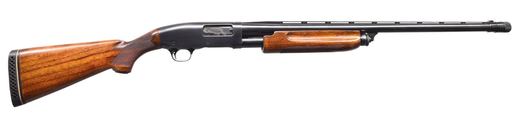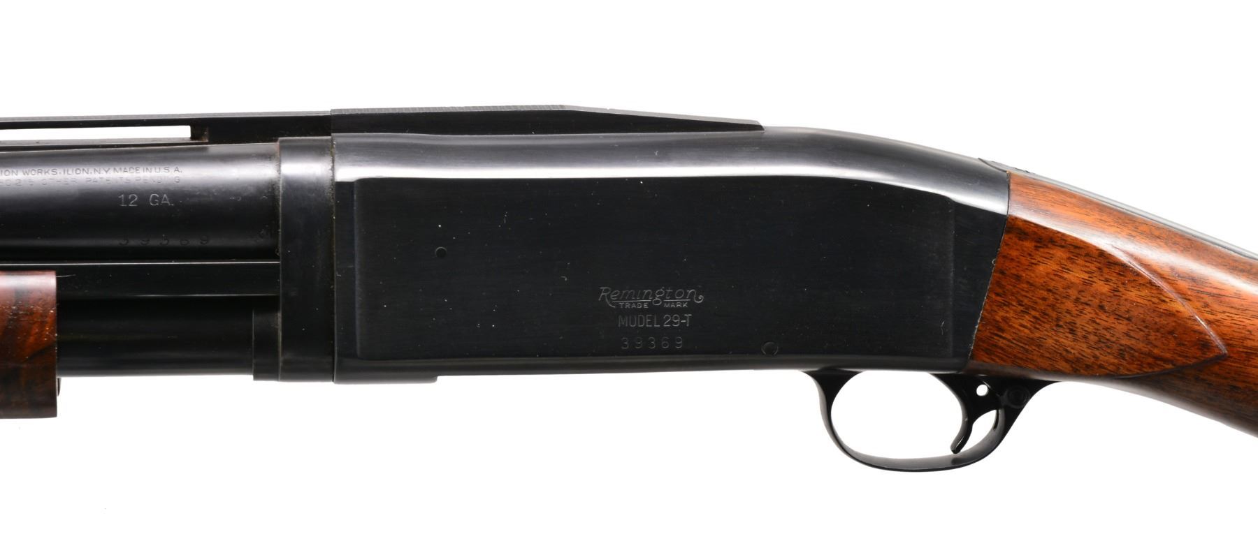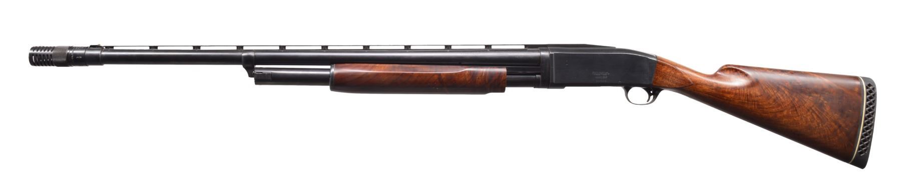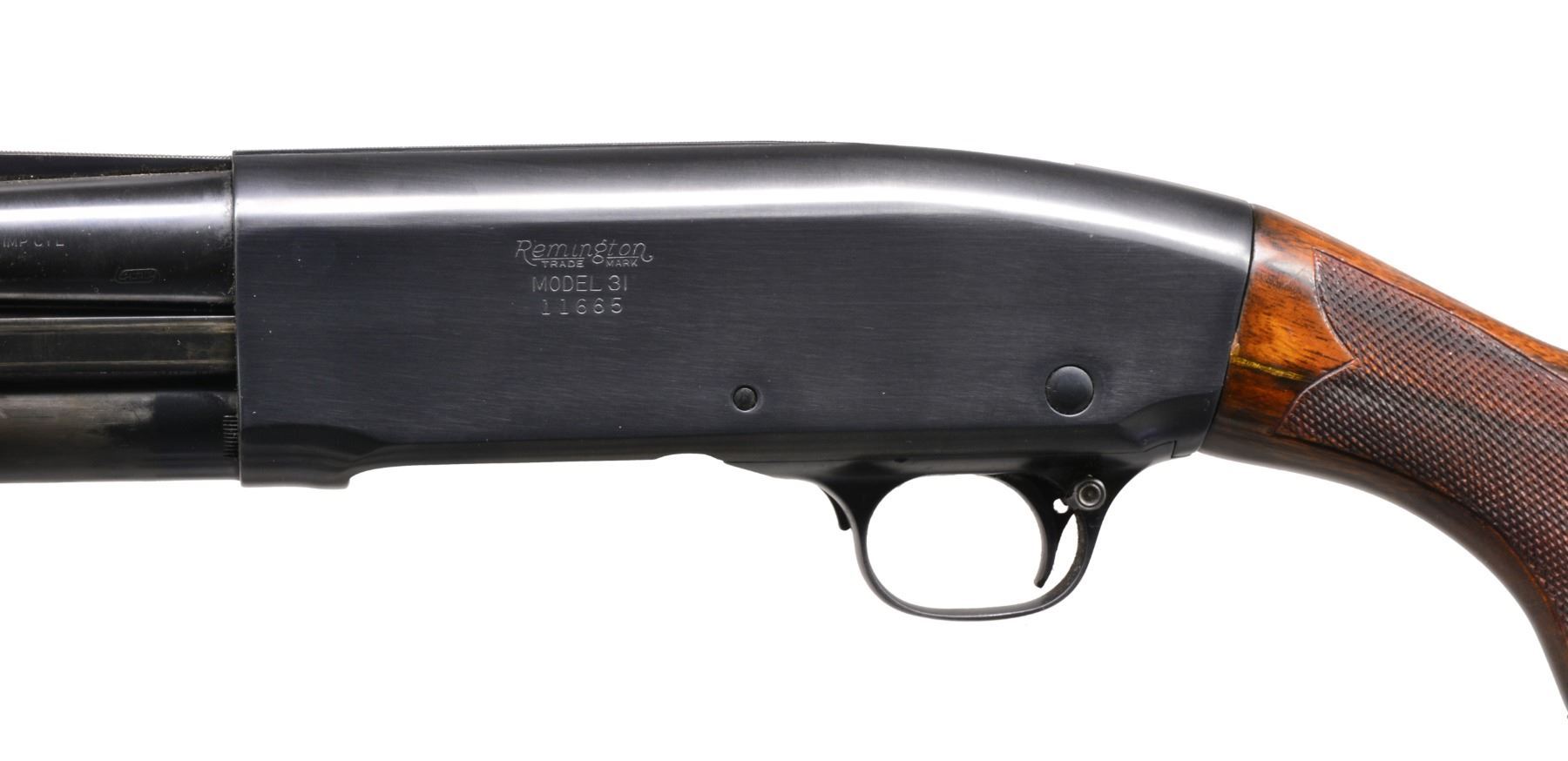 1) REMINGTON MODEL 31. Cal. 12 Ga., 2 3/4". S# 11665. Bbl. 27" w/ factory VR & aftermarket adj. Polychoke. Ivory front bead w/ steel mid bead. Checkered walnut target forearm & hard rubber capped pistol grip stock. LOP: 14" over aftermarket black ventilated pad. CONDITION: over 90% reblued metal finish. Wood is heavily sanded & refinished w/ recut checkering. Stock is cracked at head w/ epoxy repair. Good bore. (20-131/DS). 2) REMINGTON MODEL 29-T. Cal. 12 Ga. S# 39369. Bbl. 28" w/ factory VR & aftermarket Polychoke. Brass front bead w/ steel mid bead. Custom beavertail forearm & straight grip stock of fancy walnut w/ semi gloss finish. LOP: 13 1/2" over Pachmayr White Line pad. CONDITION: 95% reblued metal finish. Wood has very good finish. Clean bright bore. (20-132/DS). 3) WINCHESTER MODEL 97. Cal. 12 Ga. S# 294817. Bbl. 27 1/2" w/ aftermarket lg. oval post Simmons VR & added adj. Cutt's Compensator. Bbl. lacks address marking having choke marking only. Custom beavertail forearm & capped pistol grip stock of gloss finished fancy black walnut. LOP: 13 3/4" over Fajen plastic buttplate. CONDITION: metal retains over 90% reblued finish showing takedown marks on left side of action. Stocks have very good finish. Bore is clean & bright. (20-133/DS). ALL CURIO. $800-1,200.