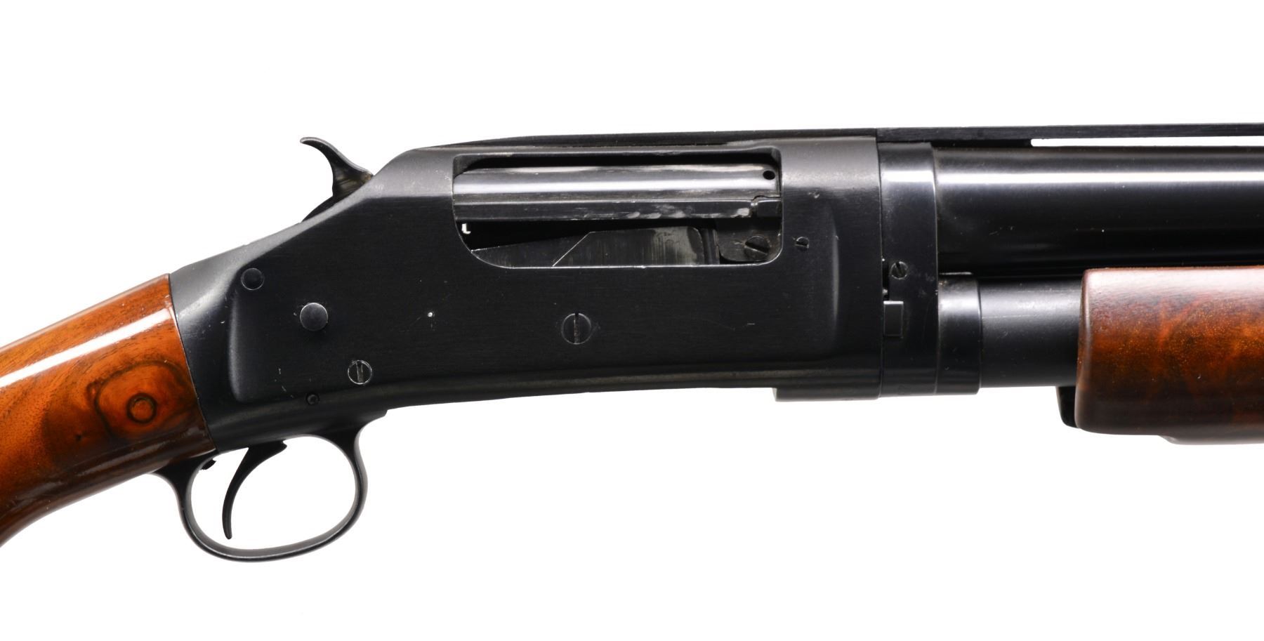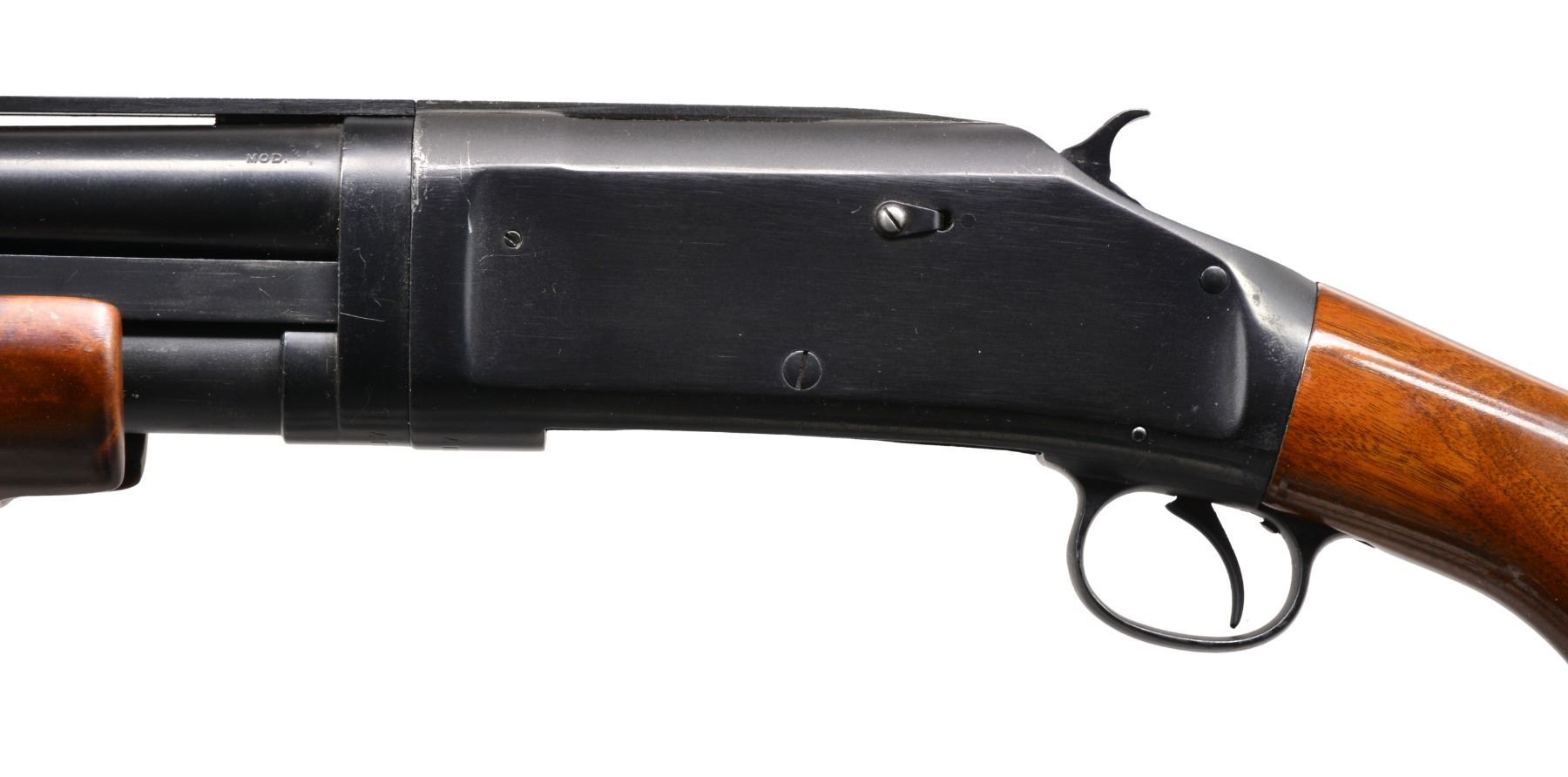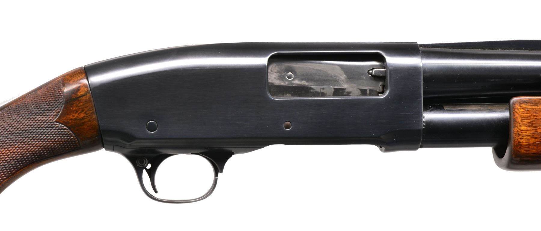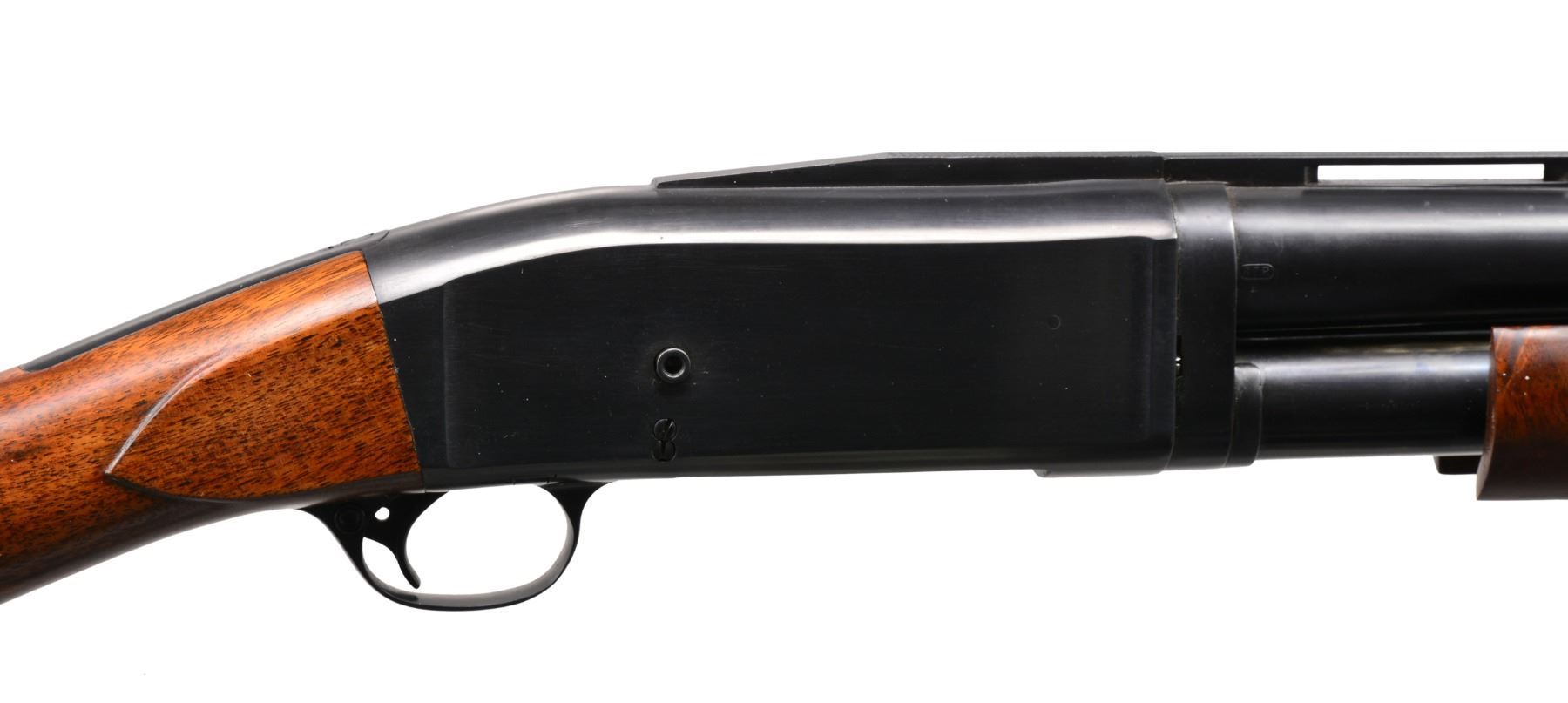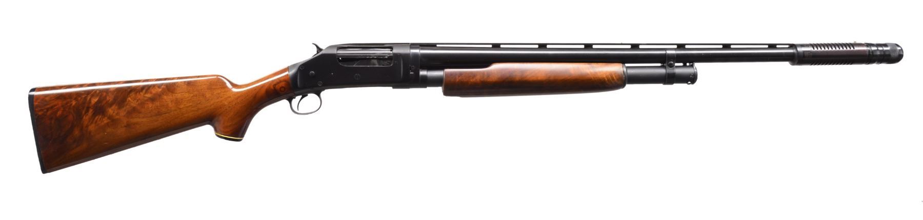 1) REMINGTON MODEL 31. Cal. 12 Ga., 2 3/4". S# 11665. Bbl. 27" w/ factory VR & aftermarket adj. Polychoke. Ivory front bead w/ steel mid bead. Checkered walnut target forearm & hard rubber capped pistol grip stock. LOP: 14" over aftermarket black ventilated pad. CONDITION: over 90% reblued metal finish. Wood is heavily sanded & refinished w/ recut checkering. Stock is cracked at head w/ epoxy repair. Good bore. (20-131/DS). 2) REMINGTON MODEL 29-T. Cal. 12 Ga. S# 39369. Bbl. 28" w/ factory VR & aftermarket Polychoke. Brass front bead w/ steel mid bead. Custom beavertail forearm & straight grip stock of fancy walnut w/ semi gloss finish. LOP: 13 1/2" over Pachmayr White Line pad. CONDITION: 95% reblued metal finish. Wood has very good finish. Clean bright bore. (20-132/DS). 3) WINCHESTER MODEL 97. Cal. 12 Ga. S# 294817. Bbl. 27 1/2" w/ aftermarket lg. oval post Simmons VR & added adj. Cutt's Compensator. Bbl. lacks address marking having choke marking only. Custom beavertail forearm & capped pistol grip stock of gloss finished fancy black walnut. LOP: 13 3/4" over Fajen plastic buttplate. CONDITION: metal retains over 90% reblued finish showing takedown marks on left side of action. Stocks have very good finish. Bore is clean & bright. (20-133/DS). ALL CURIO. $800-1,200.