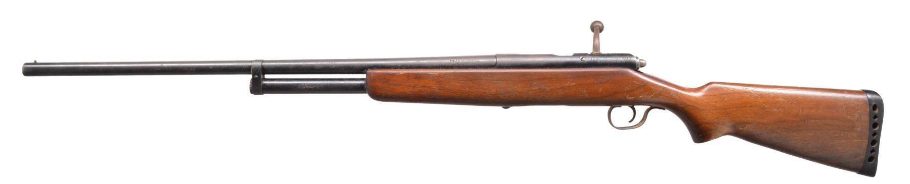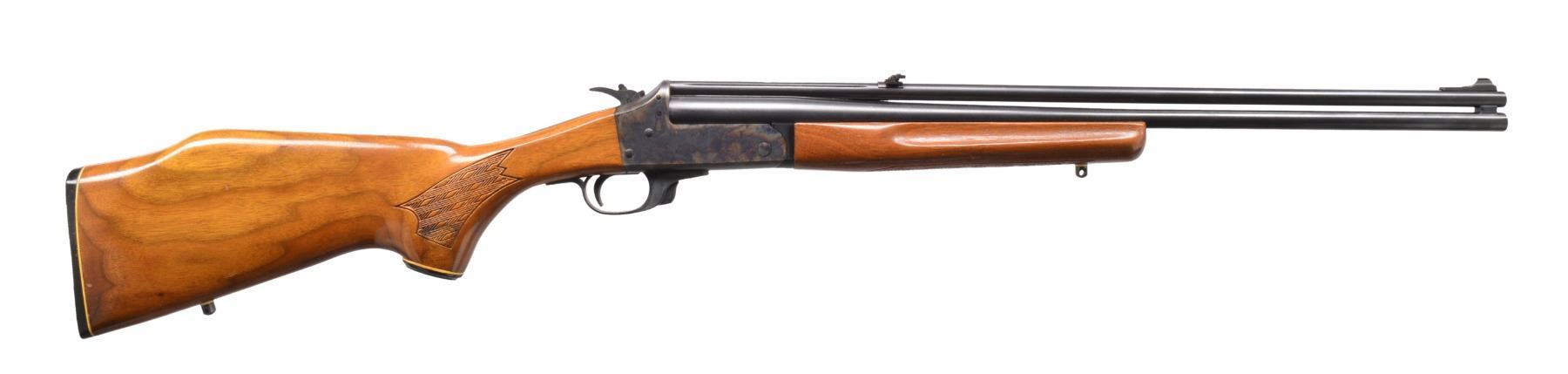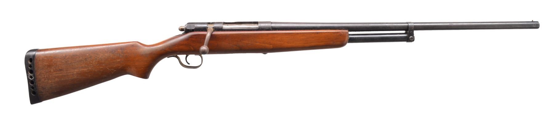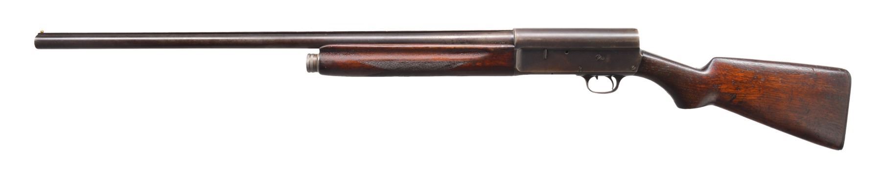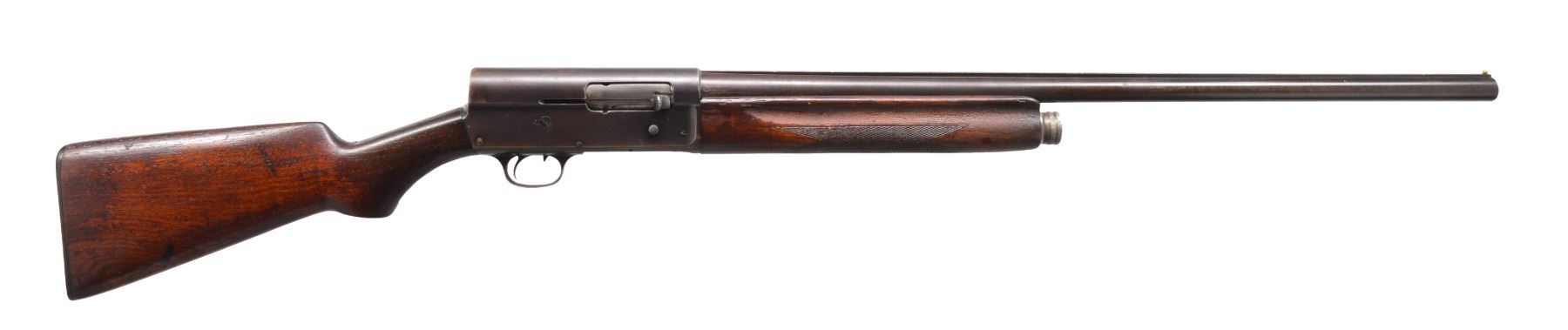 1) REMINGTON MODEL 11 SEMI AUTO SHOTGUN. Cal. 12 Ga. S# 213176. Bbl. 28" w/ solid rib & fixed Full choke. Brass front bead. Browning designed recoil operated action w/ safety in front of trigger. Checkered walnut forearm & smooth pistol grip walnut stock w/ original buttplate. CONDITION: 60% dull blue fading to patina w/ spots of surface corrosion. Stocks have blistered added finish over areas of wear & handling marks. Bore shows scattered spots of light pitting. (20-147/DS). CURIO. 2) JC HIGGINS 583.2 BOLT ACTION SHOTGUN. Cal. 16 Ga., 2 3/4". NSN. Bbl. 26" plain w/ fixed Full choke & brass bead. Tubular mag. Straight comb walnut stock. LOP: 13 7/8" over original ventilated pad. CONDITION: 80% lightly faded blue showing surface corrosion. Stock has worn finish w/ numerous scratches & handling marks. Clean sound bore. (20-148/DS). CURIO. 3) SAVAGE MODEL 24 O/U COMBINATION. Cal. 410, 2 1/2" & 3" / 22 LR. S# D305921. Bbls. 24" w/ ramp mounted bead front sight & folding leaf rear sight. 22 Bbl. is grooved for tip off scope mts. Case colored action having bbl. selector on hammer w/ push button opening on front of plastic trigger guard. Finger groove walnut forearm & capped Monte Carlo pistol grip walnut stock w/ pressed basket weaver checkering & swivel bases. LOP: 14 1/4" over original buttplate & white line spacer. CONDITION: over 95% blue & case colored finish. Stock shows scattered scratches & marks. Very good bright bores. (20-149/DS). MODERN. $500-700.