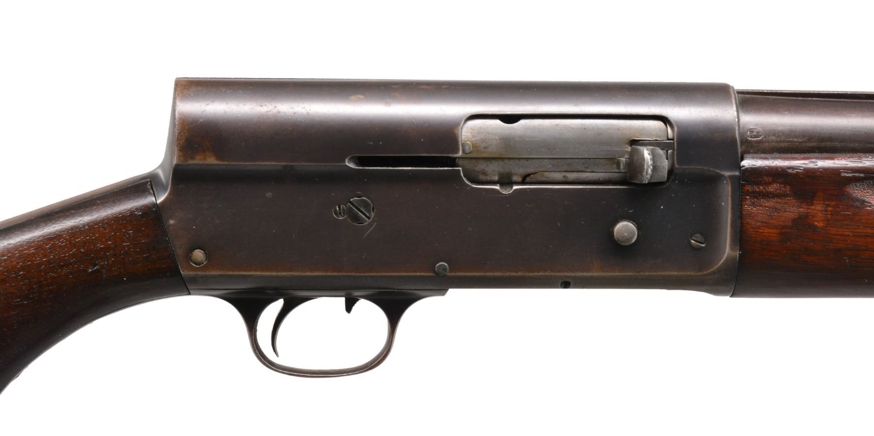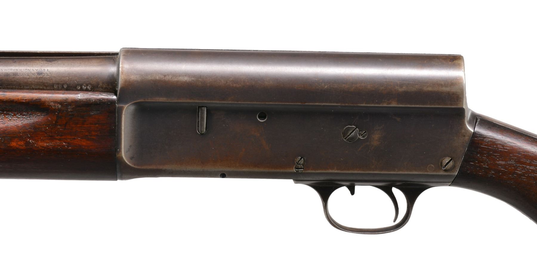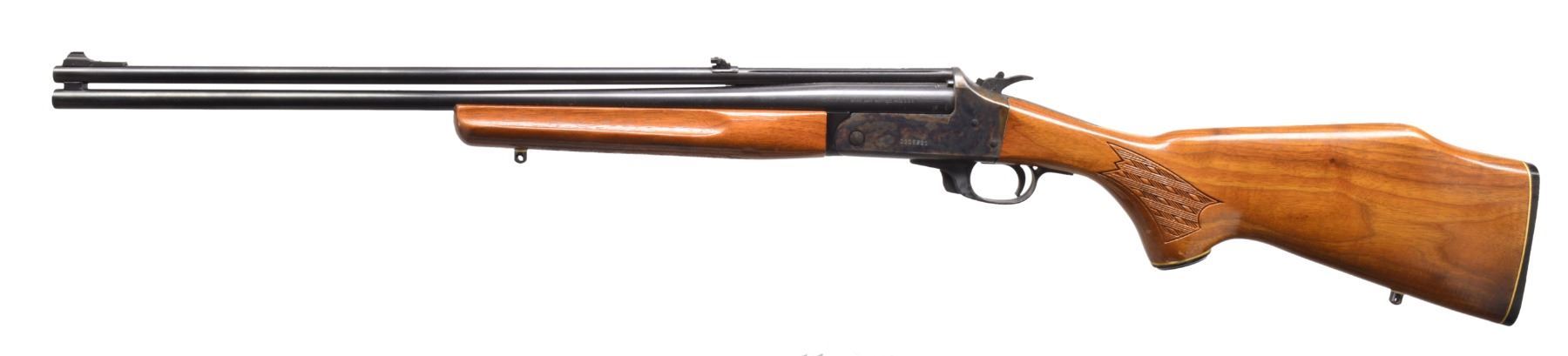 1) REMINGTON MODEL 11 SEMI AUTO SHOTGUN. Cal. 12 Ga. S# 213176. Bbl. 28" w/ solid rib & fixed Full choke. Brass front bead. Browning designed recoil operated action w/ safety in front of trigger. Checkered walnut forearm & smooth pistol grip walnut stock w/ original buttplate. CONDITION: 60% dull blue fading to patina w/ spots of surface corrosion. Stocks have blistered added finish over areas of wear & handling marks. Bore shows scattered spots of light pitting. (20-147/DS). CURIO. 2) JC HIGGINS 583.2 BOLT ACTION SHOTGUN. Cal. 16 Ga., 2 3/4". NSN. Bbl. 26" plain w/ fixed Full choke & brass bead. Tubular mag. Straight comb walnut stock. LOP: 13 7/8" over original ventilated pad. CONDITION: 80% lightly faded blue showing surface corrosion. Stock has worn finish w/ numerous scratches & handling marks. Clean sound bore. (20-148/DS). CURIO. 3) SAVAGE MODEL 24 O/U COMBINATION. Cal. 410, 2 1/2" & 3" / 22 LR. S# D305921. Bbls. 24" w/ ramp mounted bead front sight & folding leaf rear sight. 22 Bbl. is grooved for tip off scope mts. Case colored action having bbl. selector on hammer w/ push button opening on front of plastic trigger guard. Finger groove walnut forearm & capped Monte Carlo pistol grip walnut stock w/ pressed basket weaver checkering & swivel bases. LOP: 14 1/4" over original buttplate & white line spacer. CONDITION: over 95% blue & case colored finish. Stock shows scattered scratches & marks. Very good bright bores. (20-149/DS). MODERN. $500-700.