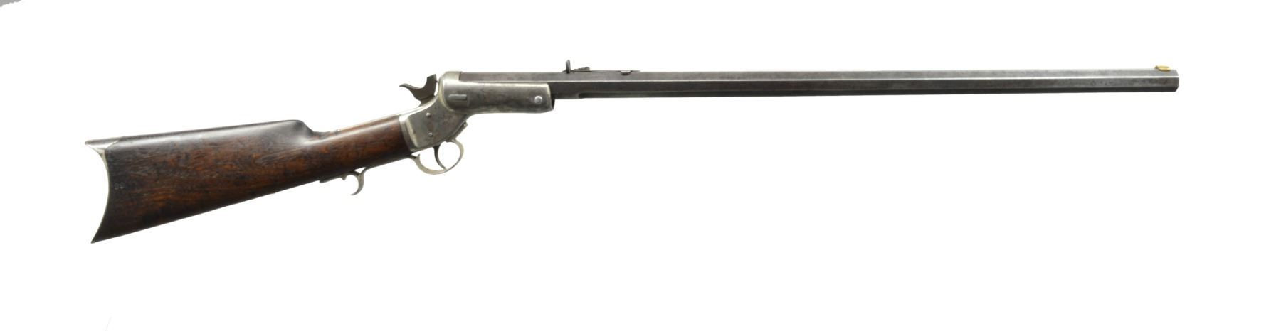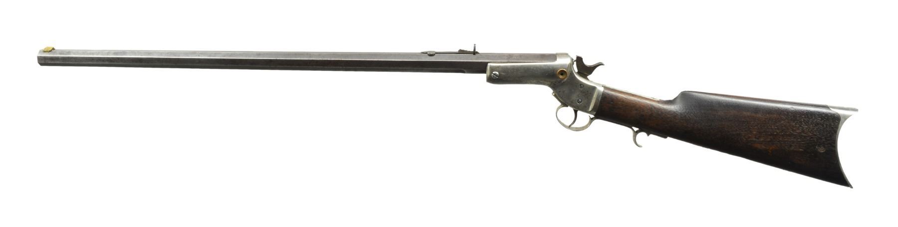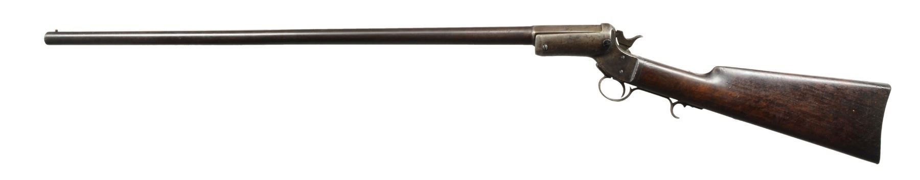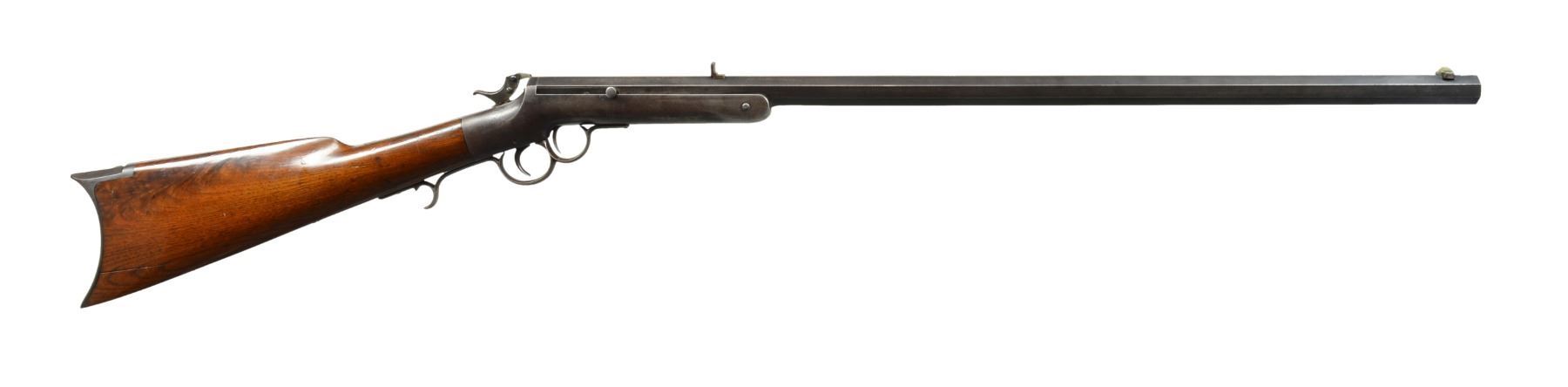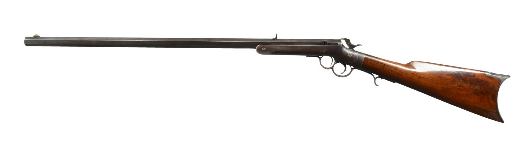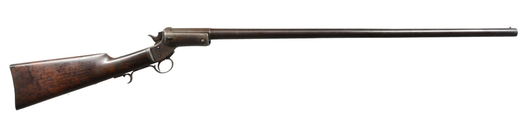 1. TIP UP SHOTGUN. Cal. 12 Ga. S# 6805. Bbl. 30 1/4" full. Round bbl., oct. at chamber. Marked on top flat "J. STEVENS & CO CHICOPEE FALLS MASS PAT. SEPT. 6 1864". Brass bead front sight. Iron frame w/ traces of case color. Walnut buttstock w/ steel buttplate. CONDITION: buttstock shows wear, scratches & handling marks w/ original finish. Stock has 1" crack ahead of buttplate tang. Connecting link for extractor is not present. Metal turning overall gray & patina w/ wear, scratches & areas of fine pitting. Fair bore w/ fine pitting throughout. (01-17647/RW). 2. STEVENS TIP UP. Cal. 38-45 Stevens. S# 7555. Bbl. 26 1/8". Bbl. numbered "2040". Bbl. marked on top left flat "J STEVENS CO CHICOPEE FALLS MASS PAT. SEPT. 6 1864". Open sporting rear sight. Replacement brass blade front sight. Nickel plated iron frame. Bbl. release button is copper colored replacement. Walnut buttstock w/ nickel plated crescent buttplate. Buttstock marked "89" on right rear. Receiver tang has open holes for tang sight. CONDITION: buttstock has early refinish w/ wear, scratches & handling marks throughout. Nickel plated parts show wear, flaking & peppery oxidation. Bbl. has traces of blue turning overall gray & patina w/ wear & spots of peppery oxidation. Replacement extractor shows hobbyist gunsmith fitting. Extractor link is loose. Fair bore has strong lands w/ areas of fine scattered pitting throughout. (01-17648/RW). 3. FRANK WESSON 2 TRIGGER. Cal. 32 RF. S# 6050. Bbl. 28 1/4" oct. Bbl. marked on top"FRANK WESSON WORCESTER MASS PAT"D OCT 25 1859 NOV 11 1862". Hammer marked "PAT. APR 1872". Elevation adj. sporting rear sight. Dovetail front sight w/ brass blade front sight. Iron frame walnut buttstock w/ crescent steel buttplate. CONDITION: buttstock has added gloss type finish w/ wear, handling marks & extensive crack on both sides at toe. Cracks on left side of grip. Frame & bbl. turning gray & patina w/ wear, light oxidation & fine pitting throughout. Good bore w/ lightly worn lands. (01-17649/RW). ALL ANTIQUE. $900-1,200.