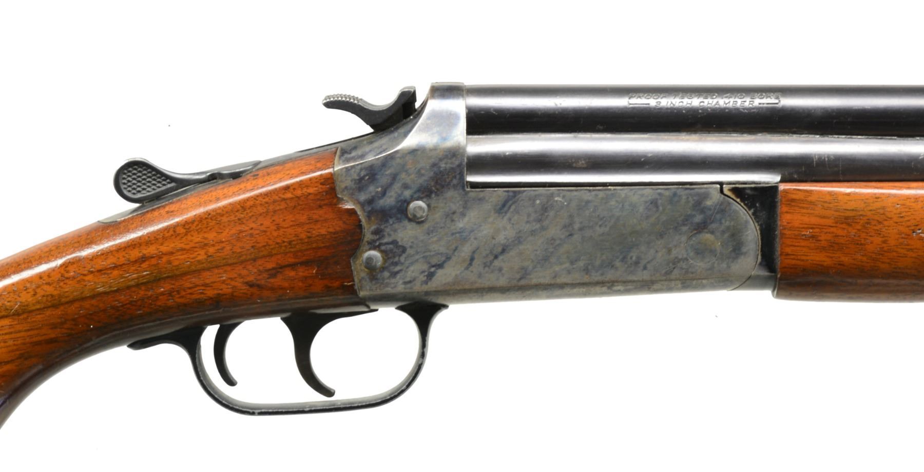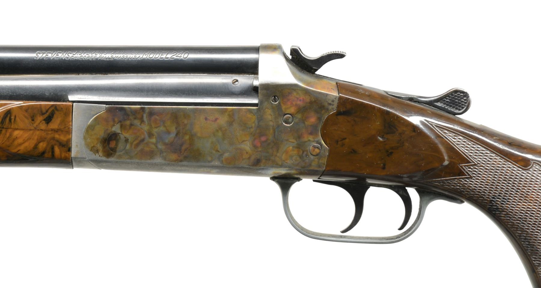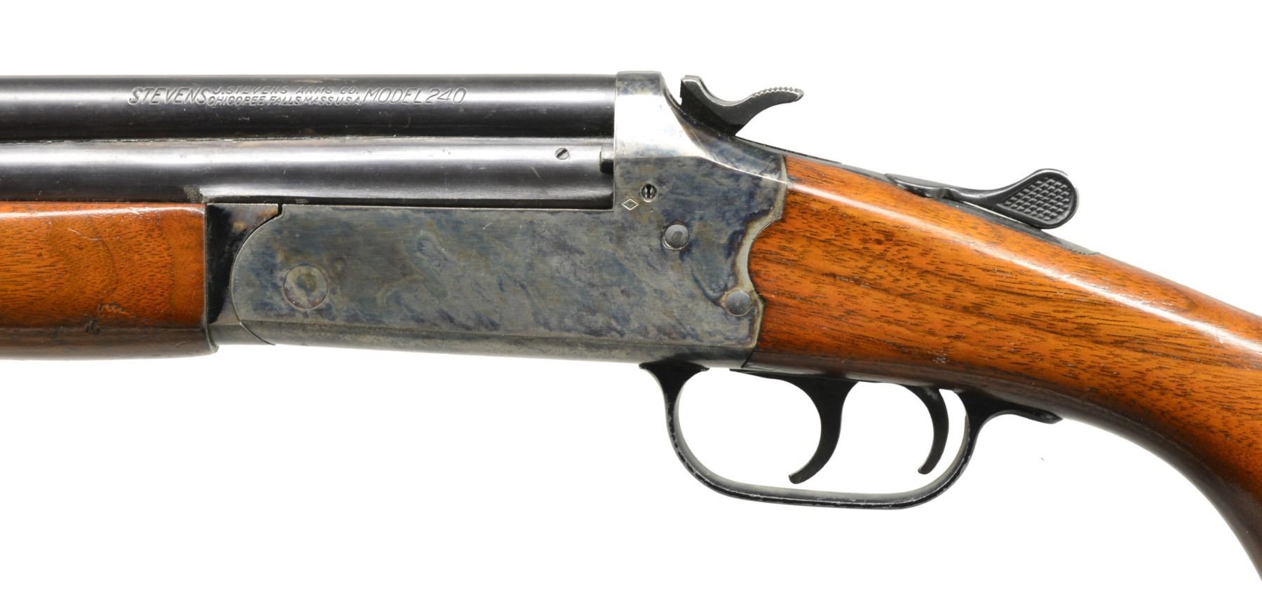 ALL: cal. 410, 3". NSN. Bbls. 26" . Very tight fixed Full & Full chokes. Bbls. marked "J STEVENS ARMS CO CHICOPEE FALLS MASS USA MODEL 240". Twin hammers as selectors. Dbl. triggers. Plain extractors. Case hardened receivers. 1) White bead front sight. Walnut stock set w/ plastic buttplate. CONDITION: stock has light wear & scattered handling marks throughout. Receiver shows lg. degree of case colors. Bbls. have slightly thinning blue w/ handling marks & scattered sm. scratches. Very good shiny bores. (20-604/RW). 2) Gold colored bead front sight. Checkered tenite stock set w/ black grip cap & black plastic buttplate. CONDITION: stock set has light wear, dents & scratches throughout. Has notable gouge in panel behind frame on left side. Action shows 50% case colors. Bbl. has thinning blue w/ light wear & scattered scratches. Good shiny bores. (20-605/RW). ALL CURIO. $800-1,200.