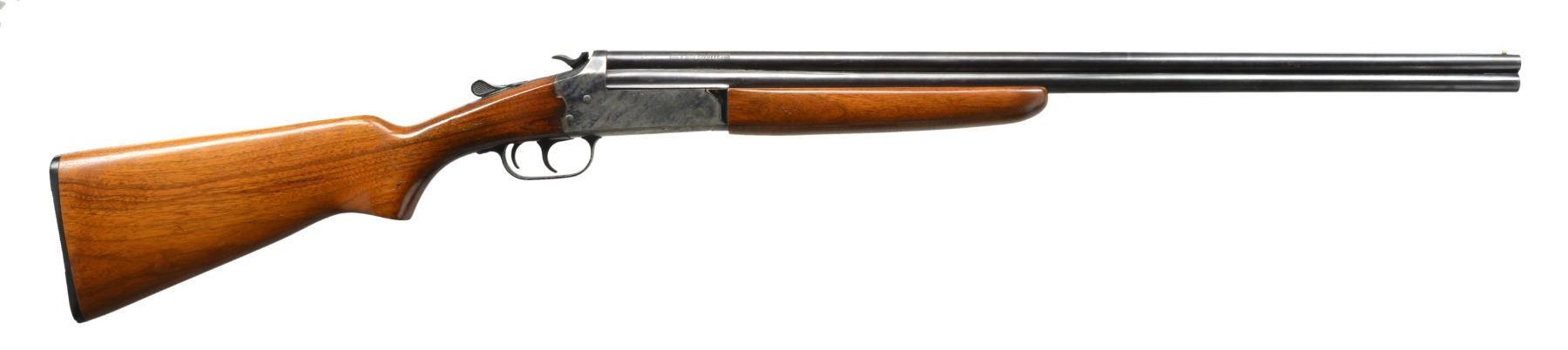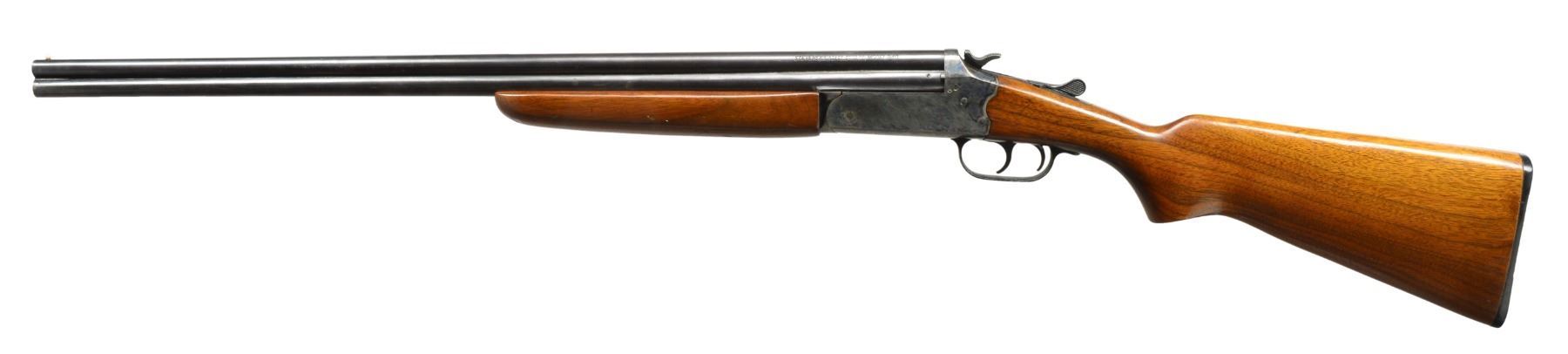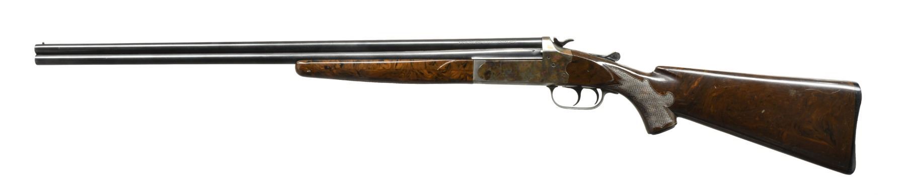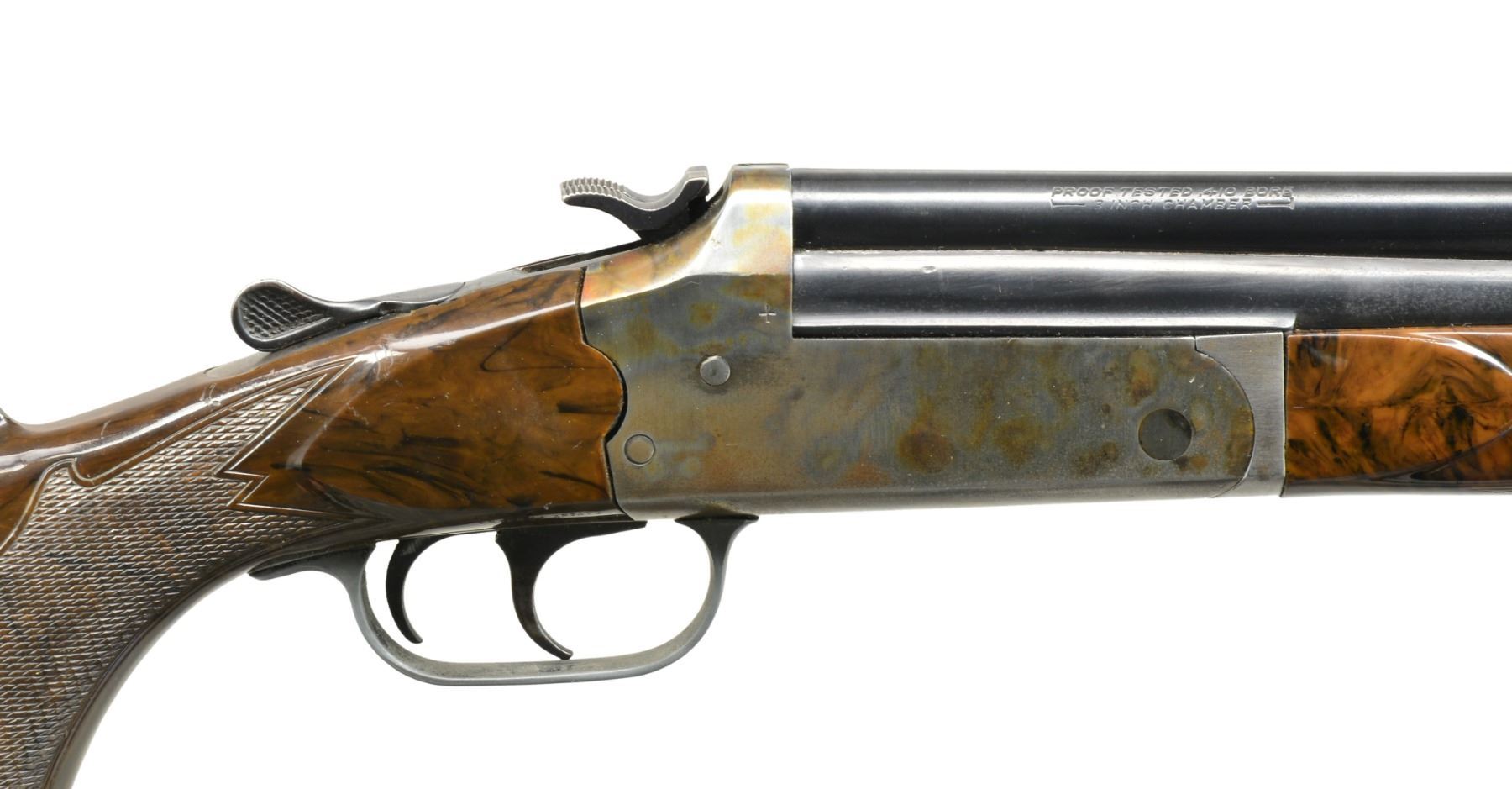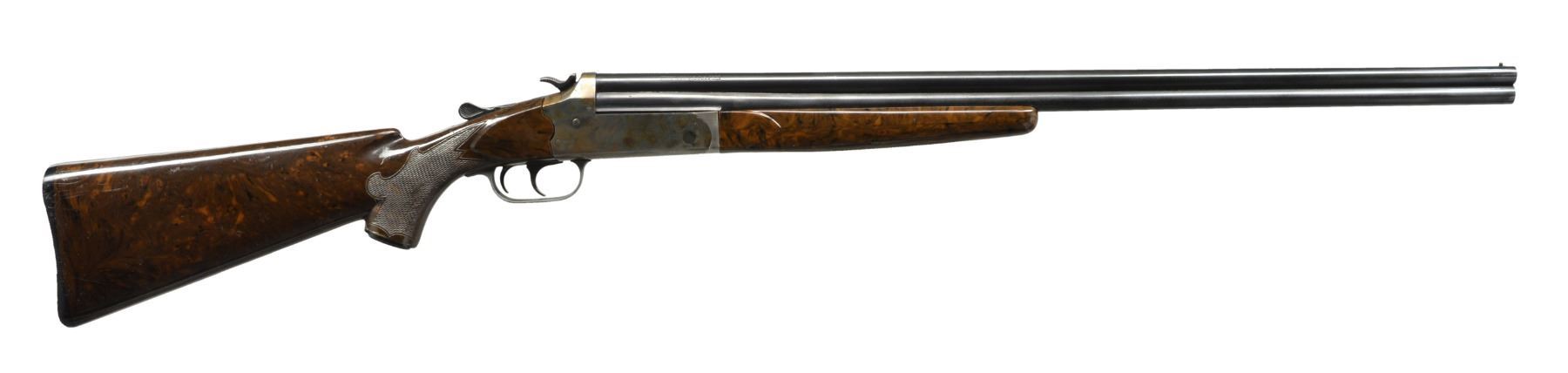 ALL: cal. 410, 3". NSN. Bbls. 26" . Very tight fixed Full & Full chokes. Bbls. marked "J STEVENS ARMS CO CHICOPEE FALLS MASS USA MODEL 240". Twin hammers as selectors. Dbl. triggers. Plain extractors. Case hardened receivers. 1) White bead front sight. Walnut stock set w/ plastic buttplate. CONDITION: stock has light wear & scattered handling marks throughout. Receiver shows lg. degree of case colors. Bbls. have slightly thinning blue w/ handling marks & scattered sm. scratches. Very good shiny bores. (20-604/RW). 2) Gold colored bead front sight. Checkered tenite stock set w/ black grip cap & black plastic buttplate. CONDITION: stock set has light wear, dents & scratches throughout. Has notable gouge in panel behind frame on left side. Action shows 50% case colors. Bbl. has thinning blue w/ light wear & scattered scratches. Good shiny bores. (20-605/RW). ALL CURIO. $800-1,200.