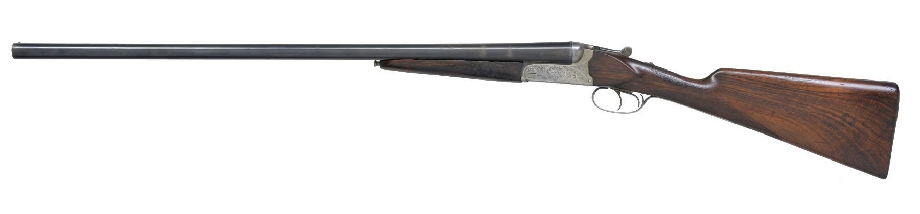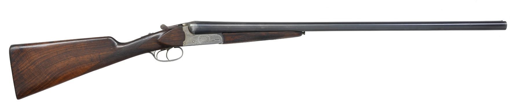 Cal. 12 Ga., 2 3/4". S# 86412. Bbls.: 27 7/8" Shoe lump bbls. are marked "HARRIER DE LUXE" on narrow, swamped game rib. Coin finished notch-backed boxlock action features automatic safety, bushed strikers & dbl. triggers. Action is roll engraved w/ 70% coverage scroll w/ rose bouquet on trigger plate. Attractively streaked & nicely figured European walnut straight grip buttstock measures 13 7/8" over checkered wood butt. Point pattern checkering is at grip. Matching splinter forend has Anson release. Bore diameters: left-.725 restriction: .035 (full). Right-.725 Restriction: .016 (mod). Minimum wall thickness: left-.030, right-.030. DAH: 2 1/8". DAC: 1 3/8". WEIGHT: 6 lbs. 11 oz. CONDITION: good. Bbls. retain most of their original blue. Action retains most of its original coin finish. Stocks heavily refinished, w/ rounded edges & some deep knocks. Checkering almost flat. Bright shiny bores. Tight action. (20-1258/MGM154). CURIO. $250-450.