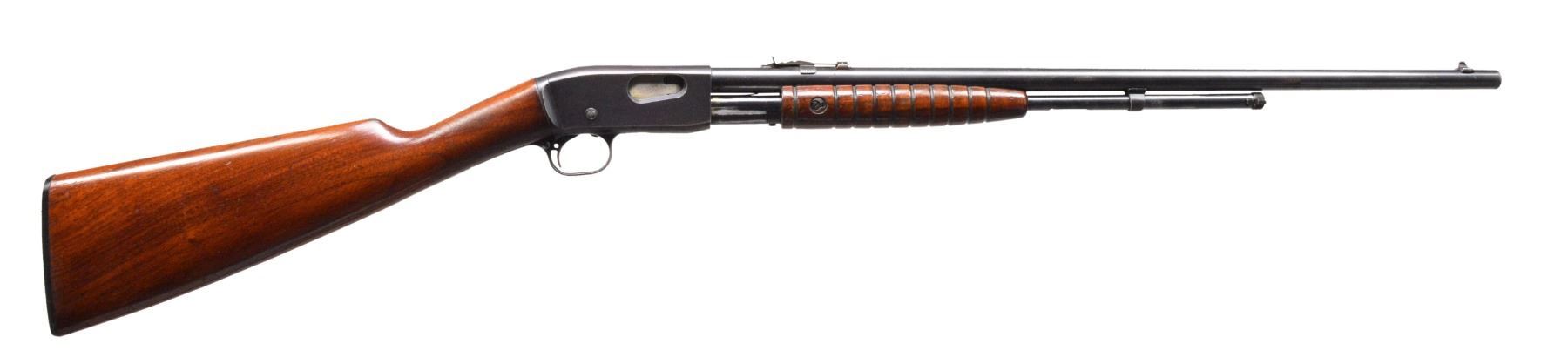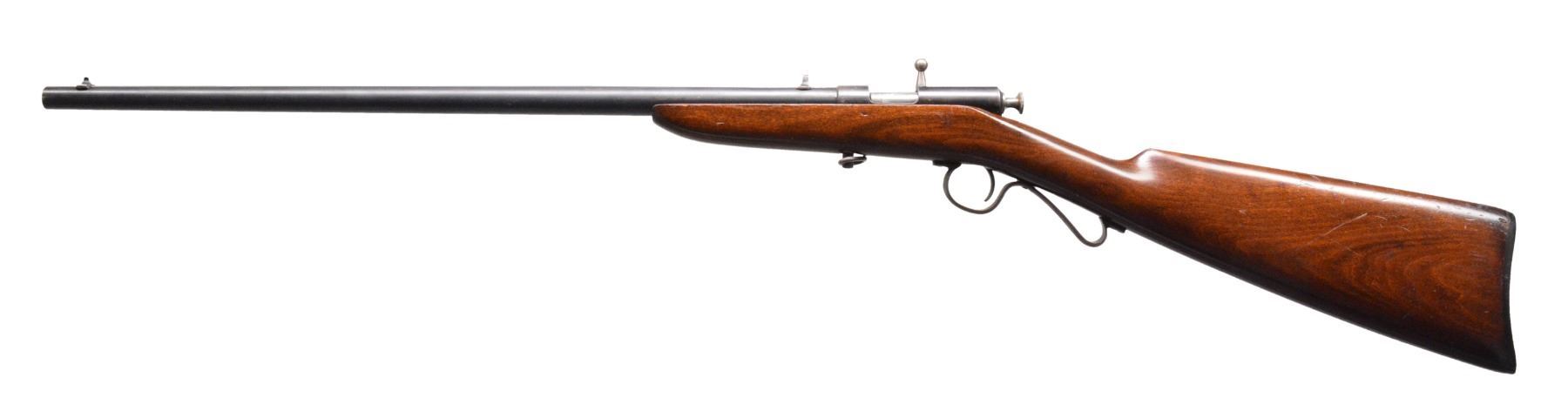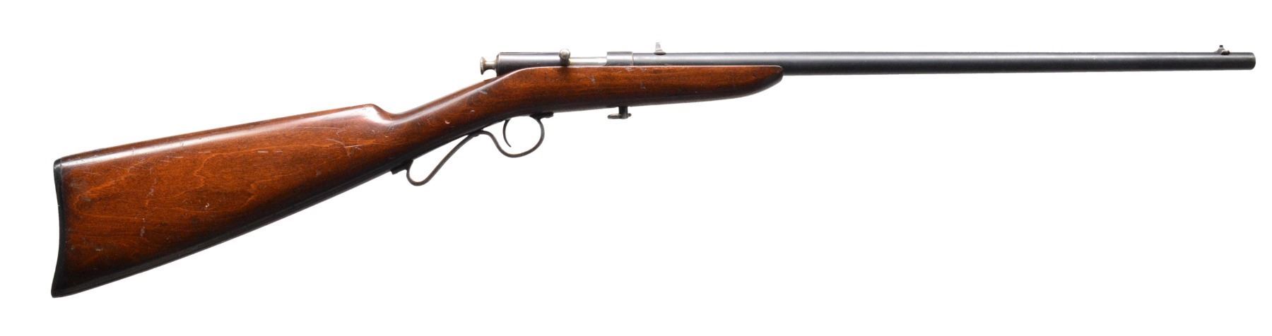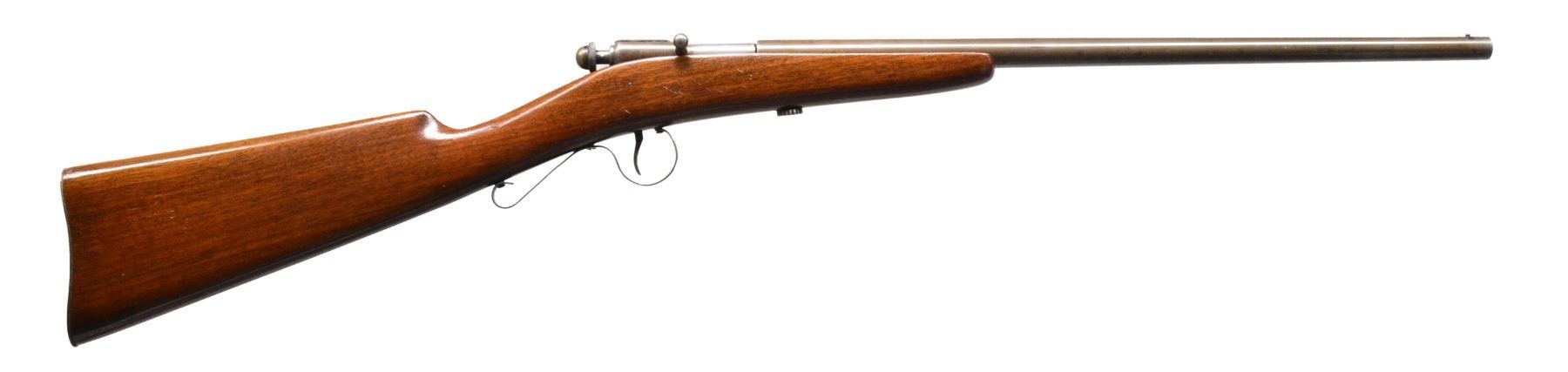 GUNS. 1) WINCHESTER MODEL 36 BOLT ACTION SINGLE SHOT SHOTGUN. Cal. 9mm RF Shot shell. S# NSN. Bbl.17 3/8" w/ steel front bead. Replacement walnut stock w/ gunsmith produced curled trigger guard & steel buttplate. CONDITION: bbl. has brown gray appearance from touch up finish over areas of pitting. Stock finish shows scratches & marks. Bore shows scattered pitting. (19-5743/DS). 2) STEVENS LITTLE KRAG NO. 65 BOLT ACTION RIFLE. Cal. 22 LR. NSN. Bbl. 20" rnd. w/ blade front sight & fixed peep rear sight. Gumwood stock w/ finger rest trigger guard & dished hard rubber buttplate. Very scare rifle mfg. 1903-1910. CONDITION: 80% blue showing scratches & spots of freckling. Original stock finish shows numerous scratches & marks. Bore retains lightly worn rifling. (19-5761/DS). 3) REMINGTON 12-A PUMP RIFLE. Cal. 22 S, L, LR. S# 454392. Bbl. 22" rnd. Bead front sight w/ elevator adj. sporting rear sight. Grooved walnut forearm & straight grip stock w/ replacement buttplate mfg. from plexiglass. CONDITION: 80% lightly faded blue showing scattered spots of corrosion & light pitting. Wood has added varnish over scratches & handling marks. Stock has sm. chips at action along side trigger guard. Bore has slightly darkened appearance w/ sound rifling. (19-5764/DS). ALL CURIO. $750-1,250.