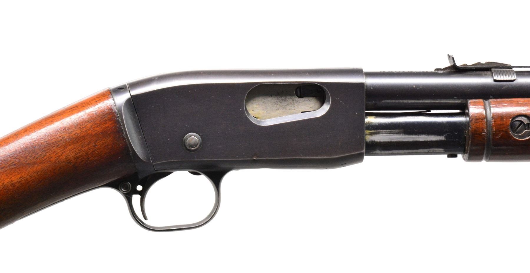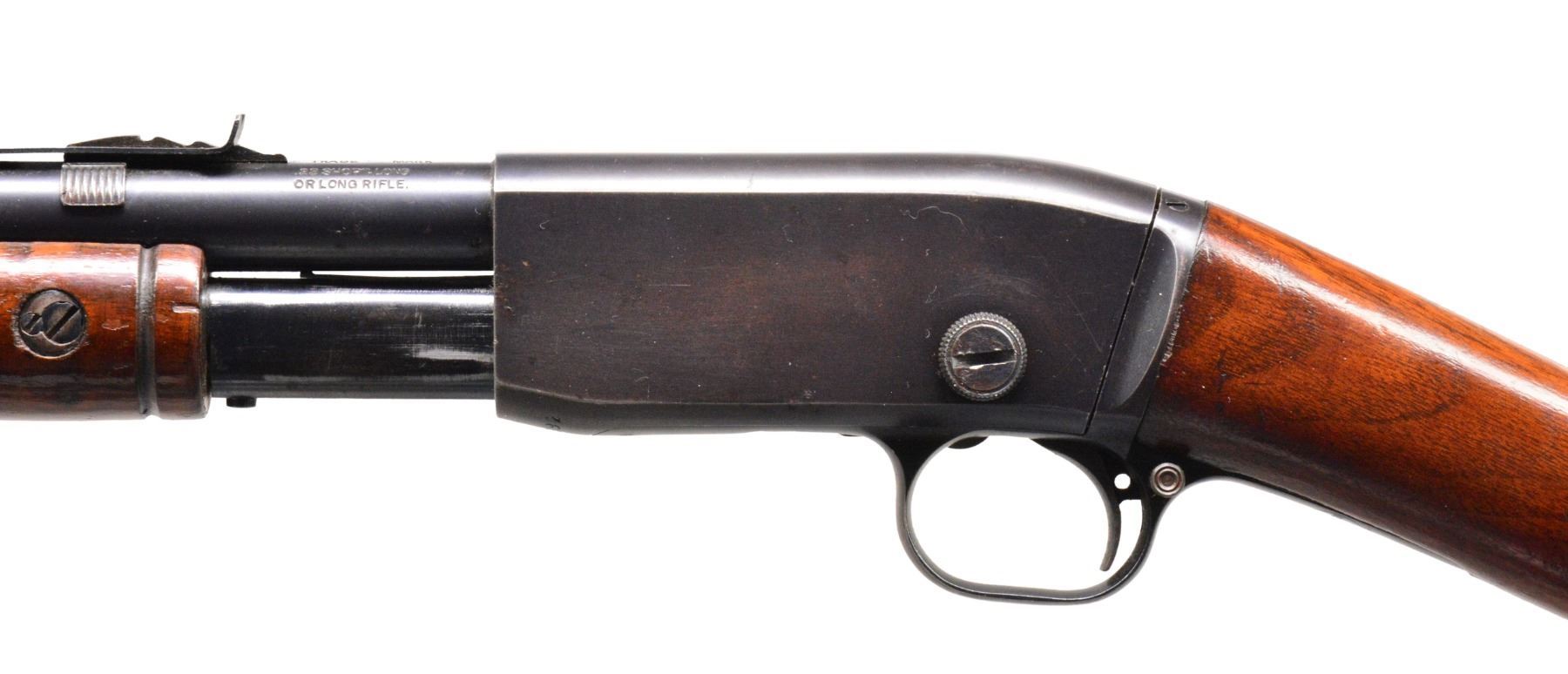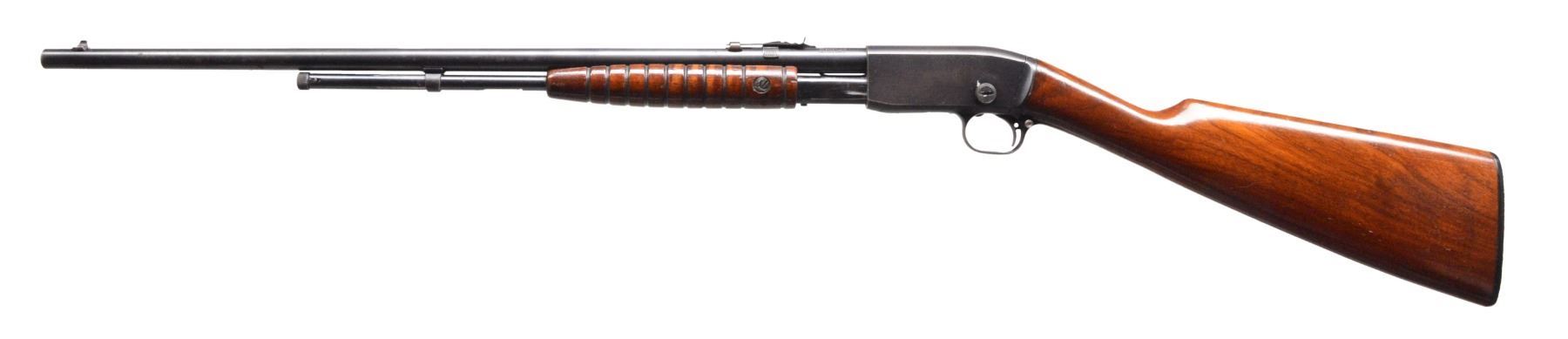 GUNS. 1) WINCHESTER MODEL 36 BOLT ACTION SINGLE SHOT SHOTGUN. Cal. 9mm RF Shot shell. S# NSN. Bbl.17 3/8" w/ steel front bead. Replacement walnut stock w/ gunsmith produced curled trigger guard & steel buttplate. CONDITION: bbl. has brown gray appearance from touch up finish over areas of pitting. Stock finish shows scratches & marks. Bore shows scattered pitting. (19-5743/DS). 2) STEVENS LITTLE KRAG NO. 65 BOLT ACTION RIFLE. Cal. 22 LR. NSN. Bbl. 20" rnd. w/ blade front sight & fixed peep rear sight. Gumwood stock w/ finger rest trigger guard & dished hard rubber buttplate. Very scare rifle mfg. 1903-1910. CONDITION: 80% blue showing scratches & spots of freckling. Original stock finish shows numerous scratches & marks. Bore retains lightly worn rifling. (19-5761/DS). 3) REMINGTON 12-A PUMP RIFLE. Cal. 22 S, L, LR. S# 454392. Bbl. 22" rnd. Bead front sight w/ elevator adj. sporting rear sight. Grooved walnut forearm & straight grip stock w/ replacement buttplate mfg. from plexiglass. CONDITION: 80% lightly faded blue showing scattered spots of corrosion & light pitting. Wood has added varnish over scratches & handling marks. Stock has sm. chips at action along side trigger guard. Bore has slightly darkened appearance w/ sound rifling. (19-5764/DS). ALL CURIO. $750-1,250.