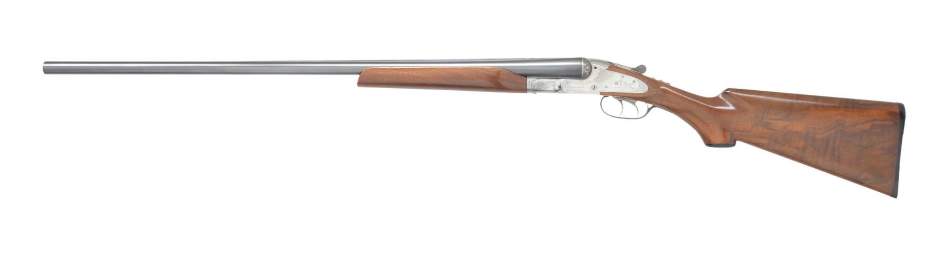 Cal. 12 Ga. S# 1078. Bbls. 30" marked top & bottom "KRUPP FLUID STEEL". Fixed Full & Full chokes. Chambers are lengthened to 2 3/4". Left bbl. & water table marked "P. K. B/E", indicating Paragon Krupp Ejector grade. Matted rib w/ white colored front & center beads. Numbers match on bbl., frame & forend iron. Sidelock action. Locks are marked "BAKER GUN CO". Plain extractors. Action has light scroll engraving. Locks have pointing dogs. Dbl. triggers. Automatic safety. Replacement beavertail forearm & walnut stock w/ unmarked hard rubber buttplate & grip cap. LOP: 14 1/2". DOH 1 9/16", DOC 2 3/8". CONDITION: reblued bbls. have very light wear. Action is polished bright. Stocks have good finish showing light marks & spots of mildew. Shiny bores have several sm. scattered pits & show evidence of several raised dents. (19-5866/RW/DS). CURIO. $200-300.
